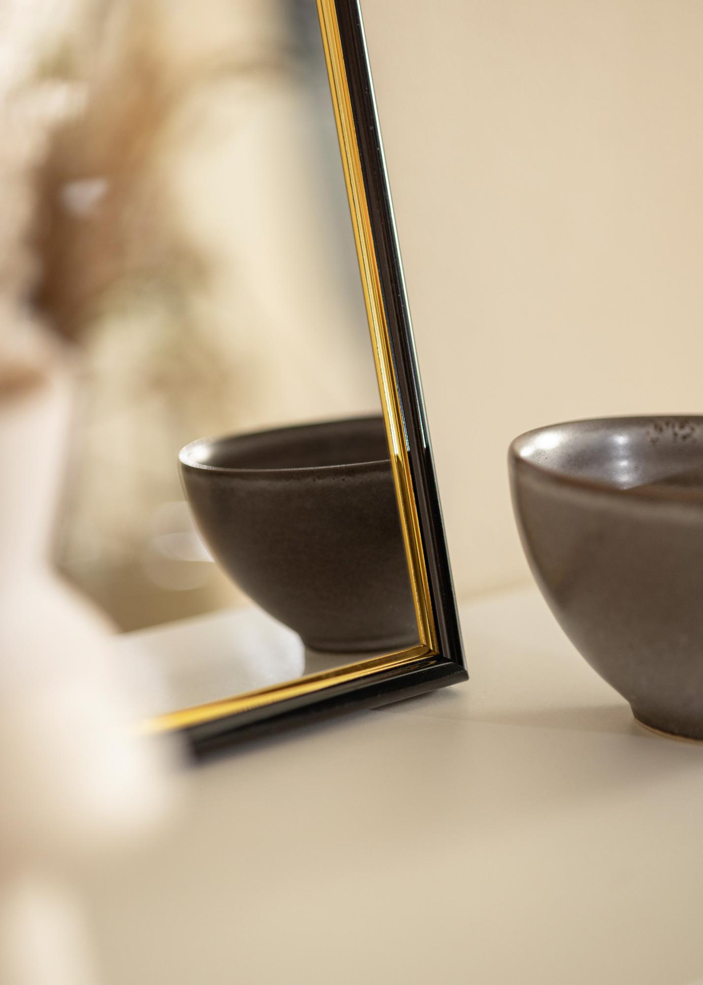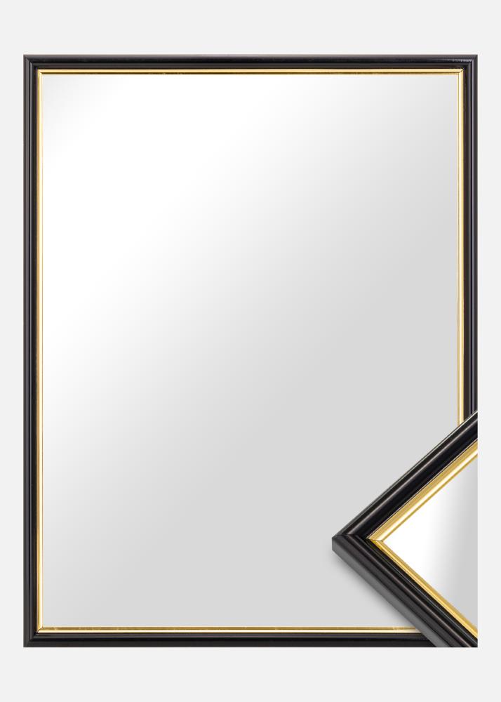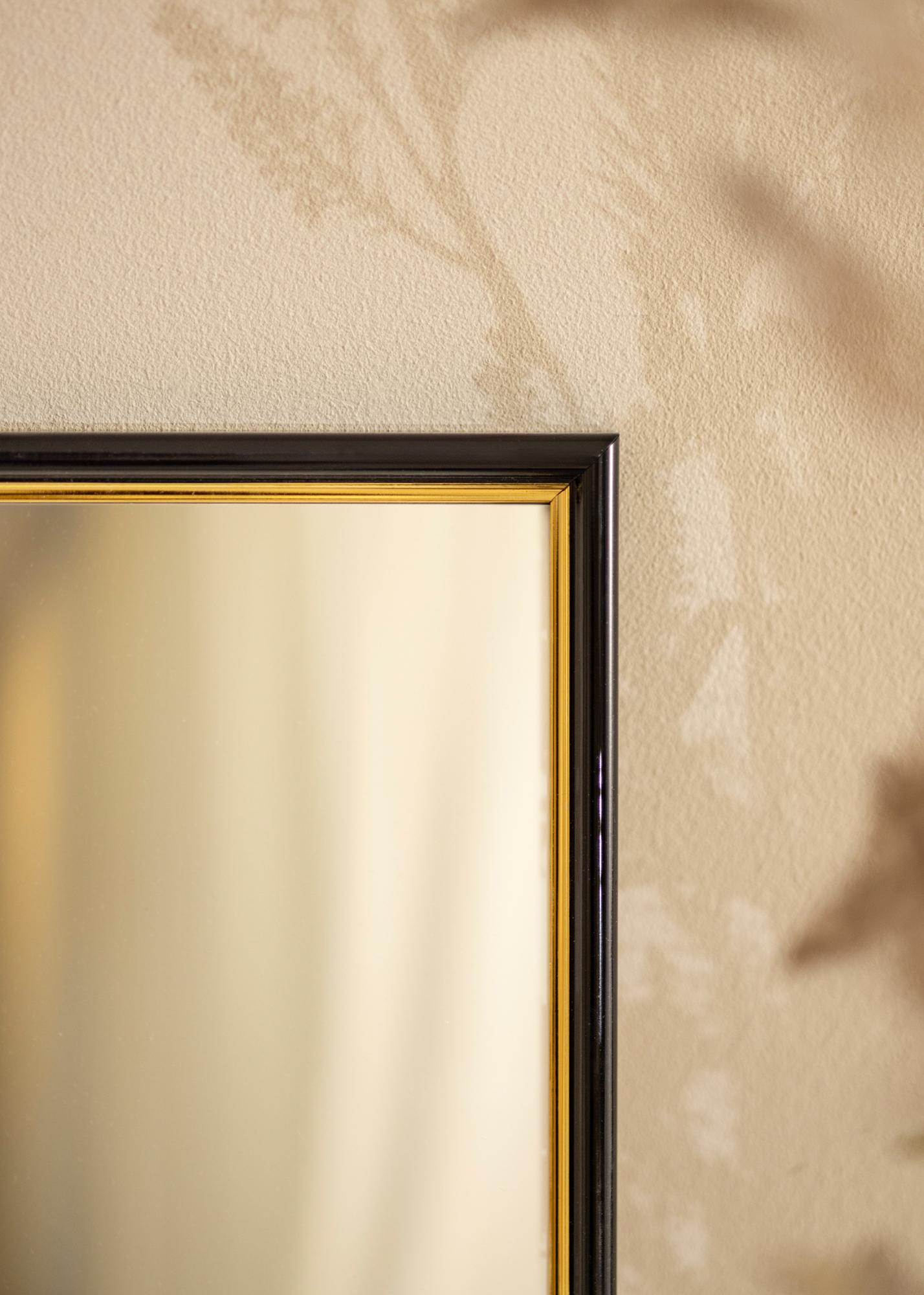 Förändra atmosfären i hallen, badrummet eller vardagsrummet när du hänger upp denna lyxiga spegel! Spegeln är svart med ett guldfärgat parti närmast glaset. Färgerna går fint ihop med inredningsdetaljer i exempelvis svart, guld, lila eller pastell. Eftersom den tillverkas efter dina önskemål kan du vara säker att den passar perfekt där du vill ha den.