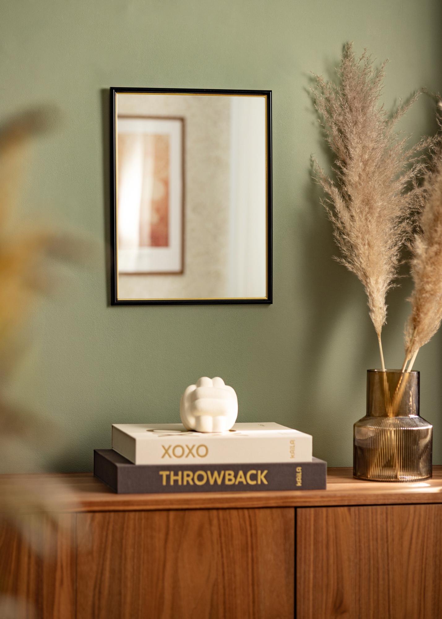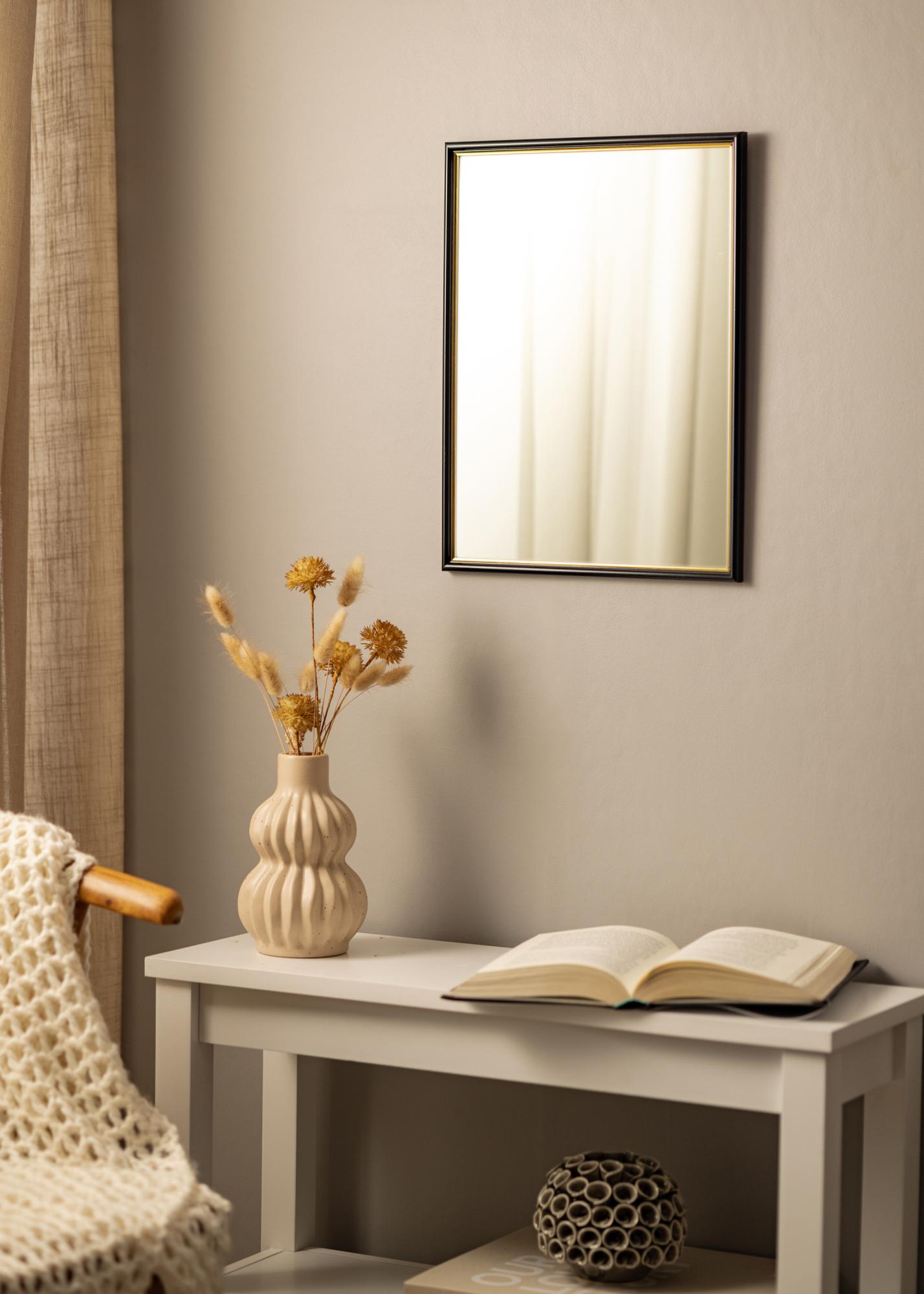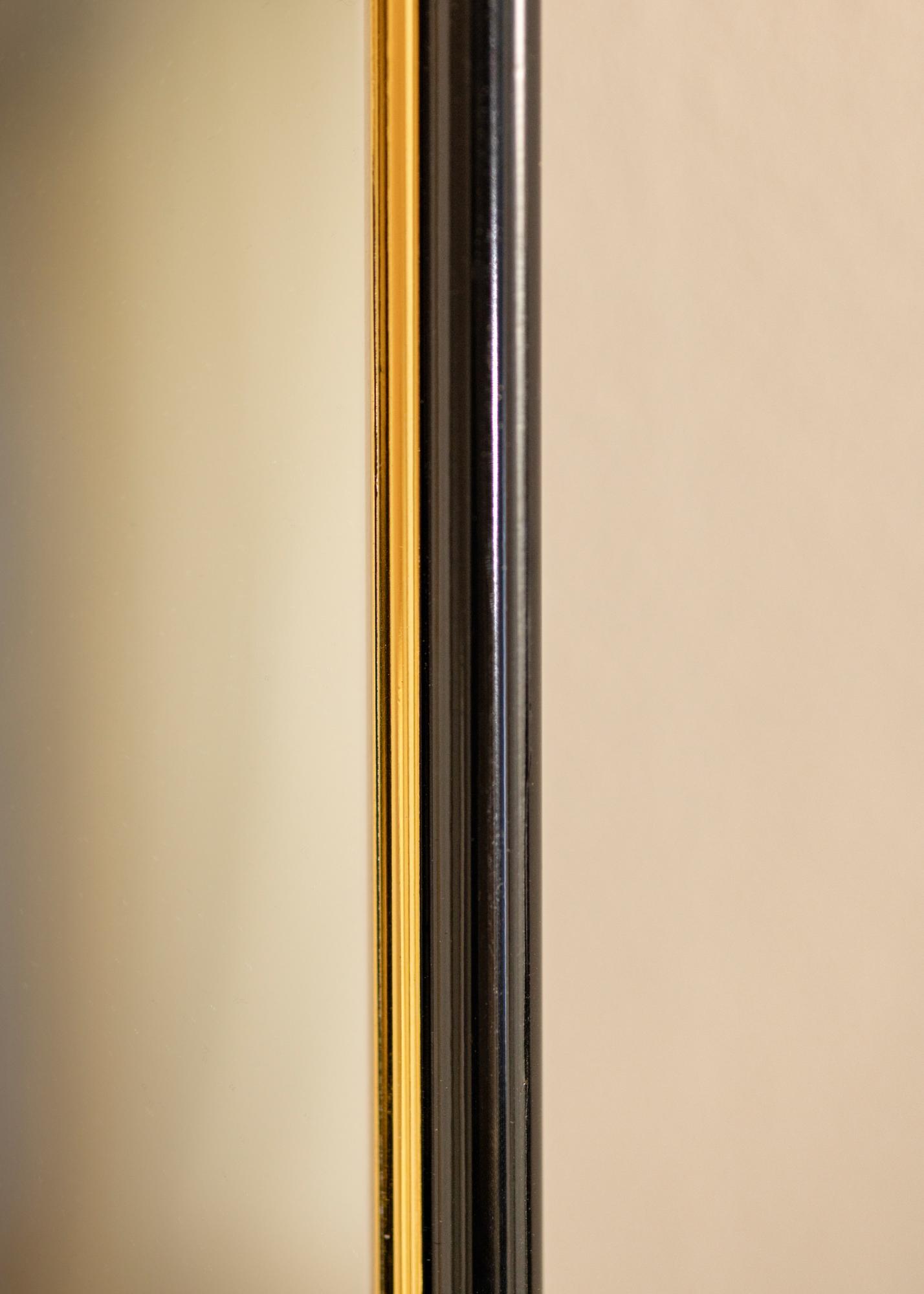 Förändra atmosfären i hallen, badrummet eller vardagsrummet när du hänger upp denna lyxiga spegel! Spegeln är svart med ett guldfärgat parti närmast glaset. Färgerna går fint ihop med inredningsdetaljer i exempelvis svart, guld, lila eller pastell. Eftersom den tillverkas efter dina önskemål kan du vara säker att den passar perfekt där du vill ha den.