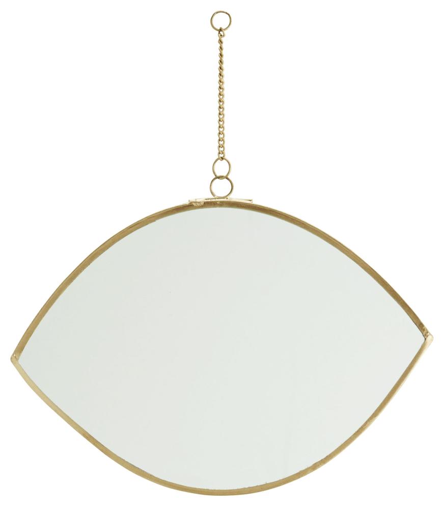 Låt denna vackra spegel från Madam Stoltz bli en iögonfallande inredningsdetalj i ditt hem. Den speciella formen efterliknar ett öga, som tillsammans med den mässingfärgade ramen gör denna väggspegel mycket elegant. Spegeln hängs upp i en nätt kedja, vilket förstärker känslan av elegans ytterligare. Denna spegelmodell finns i två olika storlekar varav denna har en längd på 16 cm. Den nätta storleken gör att väggspegeln är supersnygg att matcha tillsammans med andra spegelmodeller.