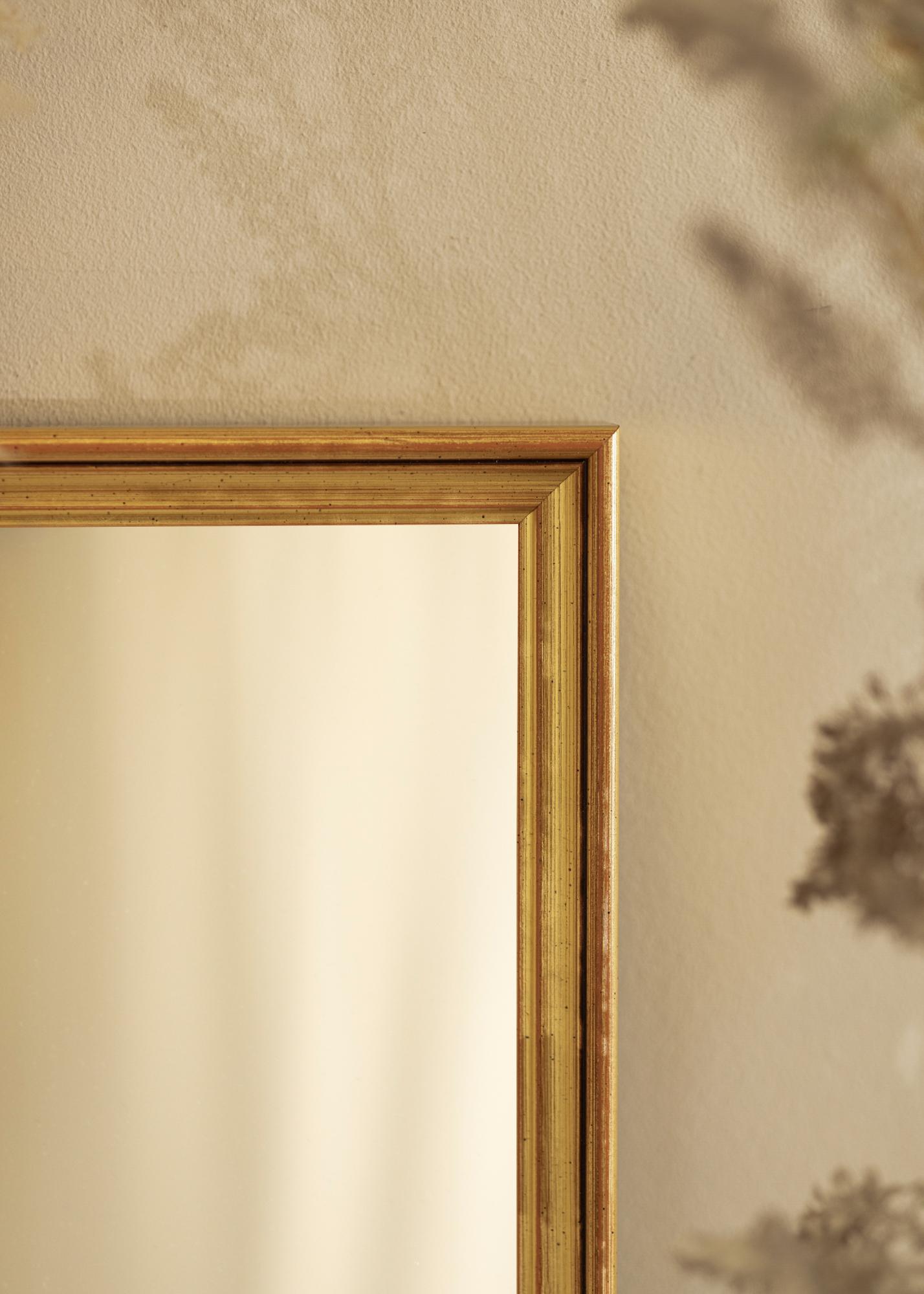 Denna spegel har ett djup på 39 mm, vilket ger den en robust känsla utan att vara för tung eller dominerande. Tillverkad av furu, kombinerar den hållbarhet med en lätthet som gör den enkel att montera på väggen. Den gyllene ytan har en lätt antik finish med små mörka detaljer, vilket skapar en tidlös karaktär som passar både moderna och klassiska inredningsstilar.