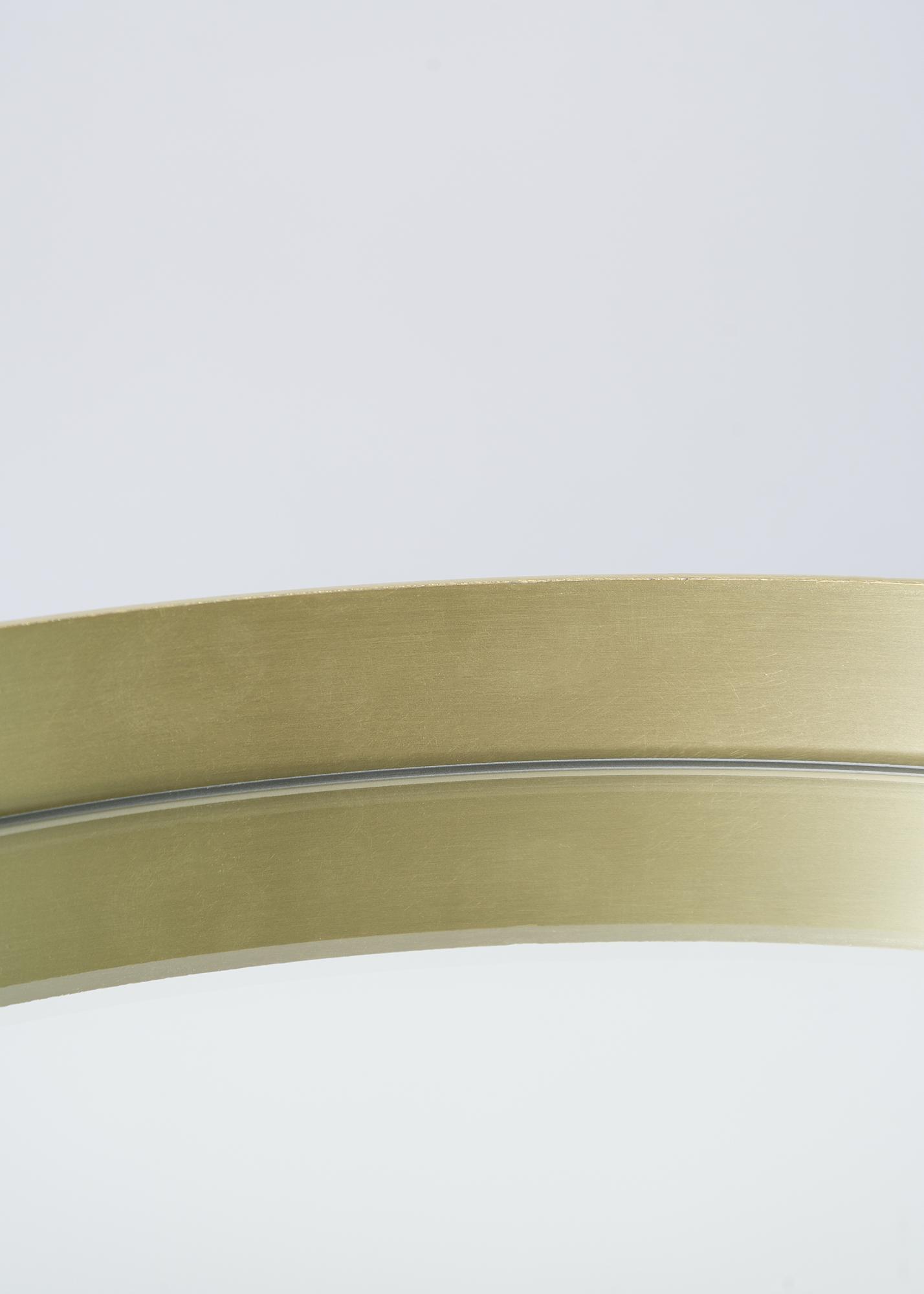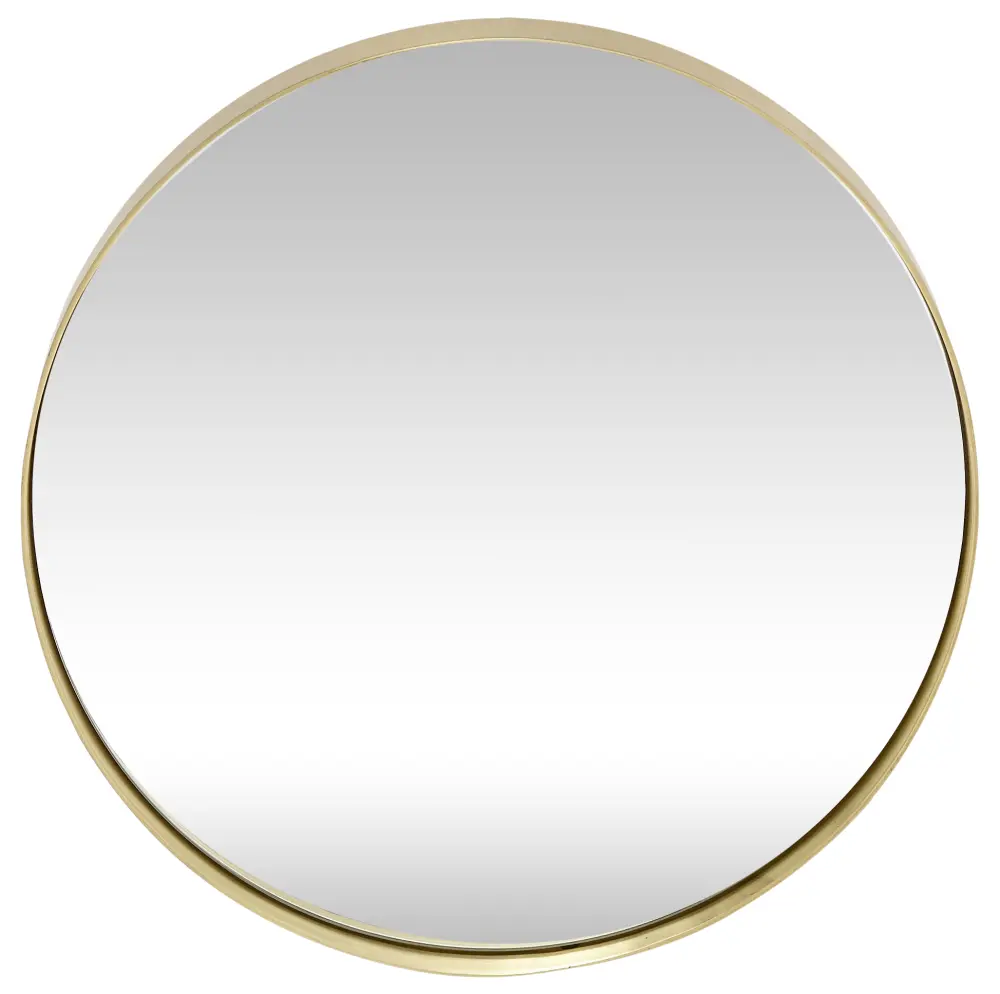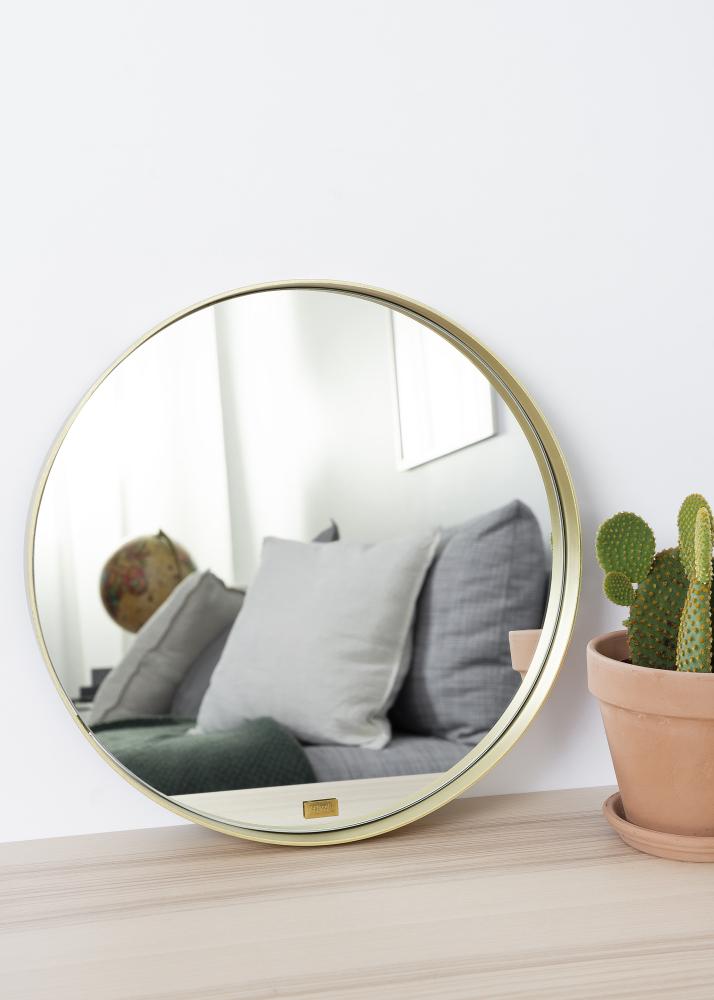 En rund väggspegel med en inbjudande och exklusiv känsla. Spegeln omges av en mässingsfärgad metallram. En ram som är tunn och stilren, samtidigt som den har en några centimeter hög kant som ger en smakfull effekt på helheten.
