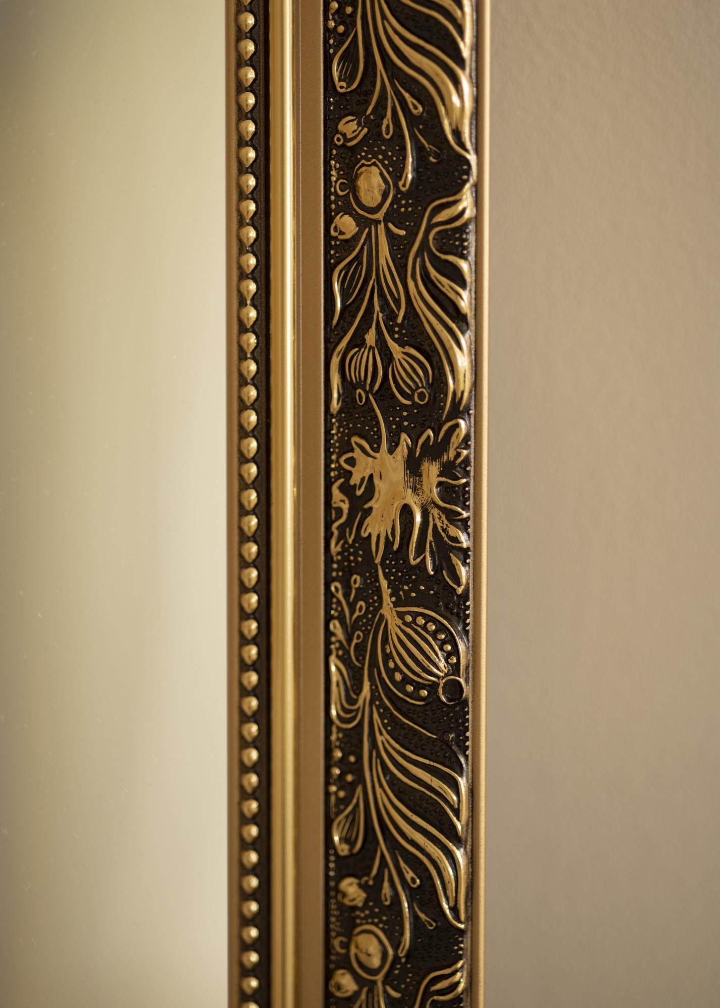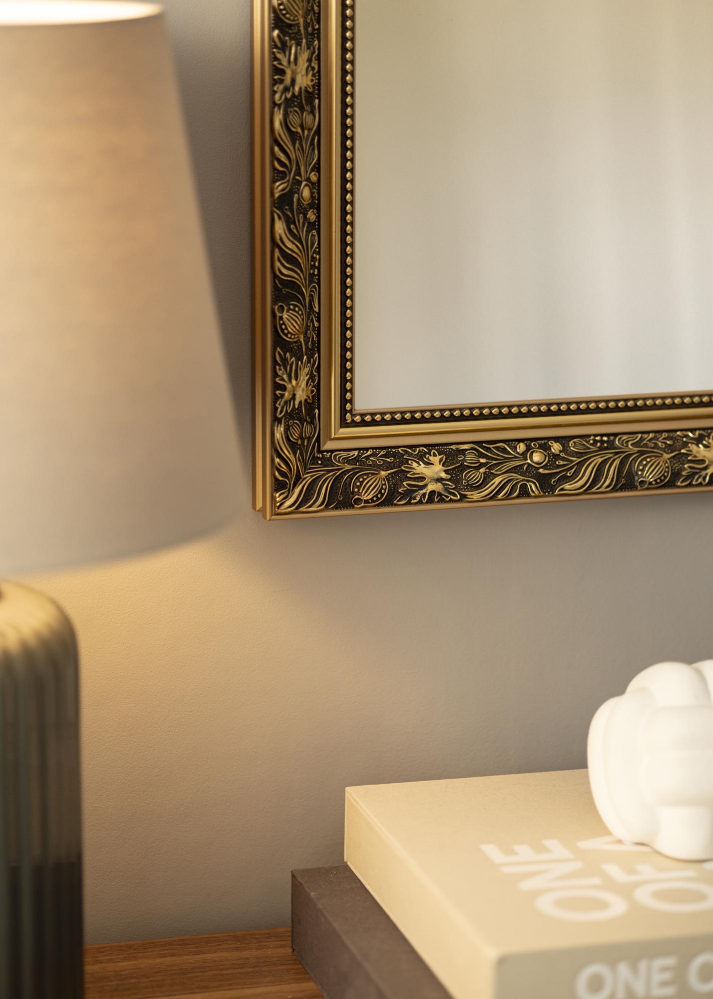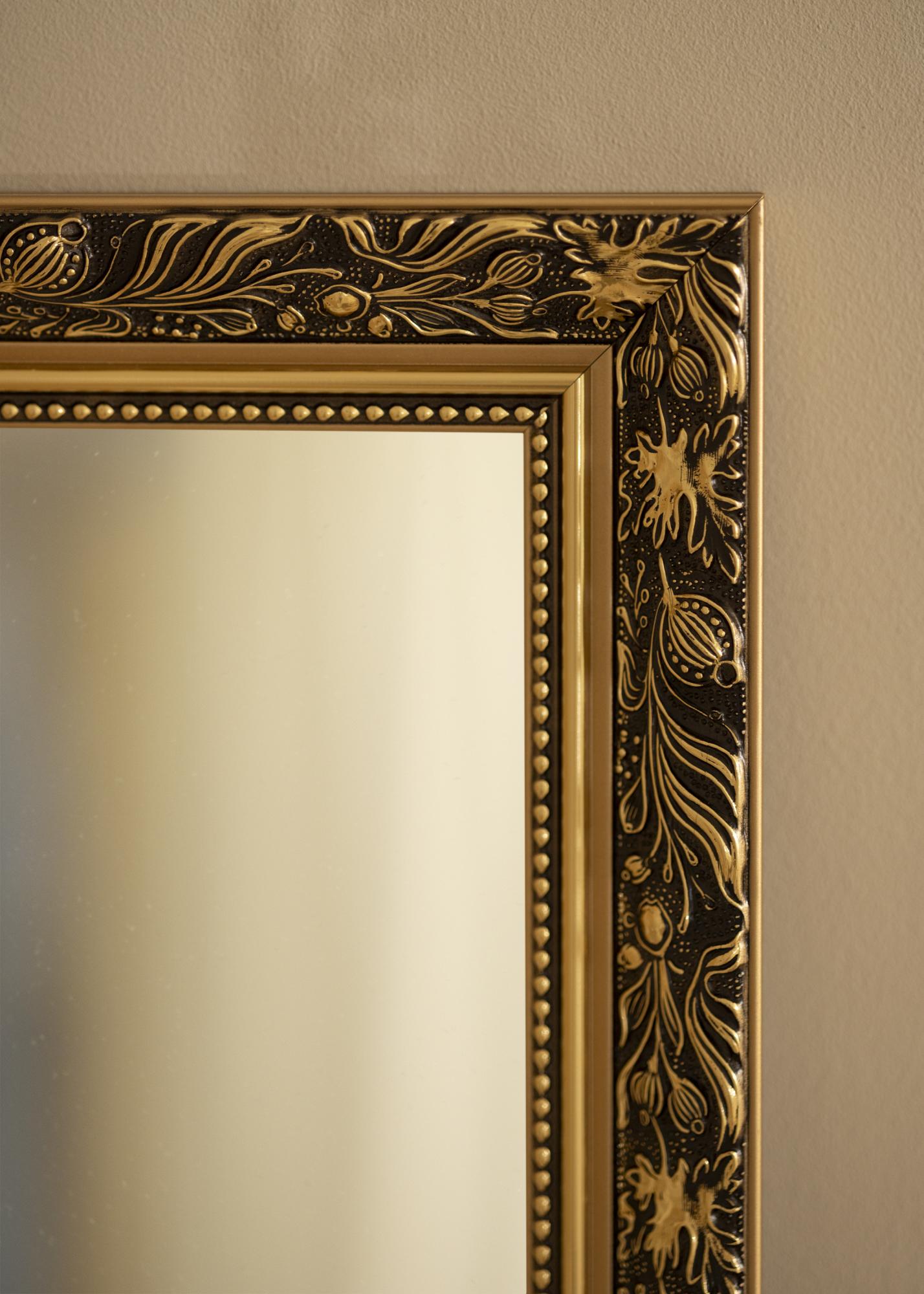 Skapa en inbjudande och lyxig känsla vart du än väljer att placera denna vackra spegel! Spegeln har en romantiskt designad ram med snirkliga mönster, räta kanter och pärlband i olika nivåer. Den gyllene färgen gör sig perfekt tillsammans med andra inredningsdetaljer i guld, pastellfärger, svart och vitt!