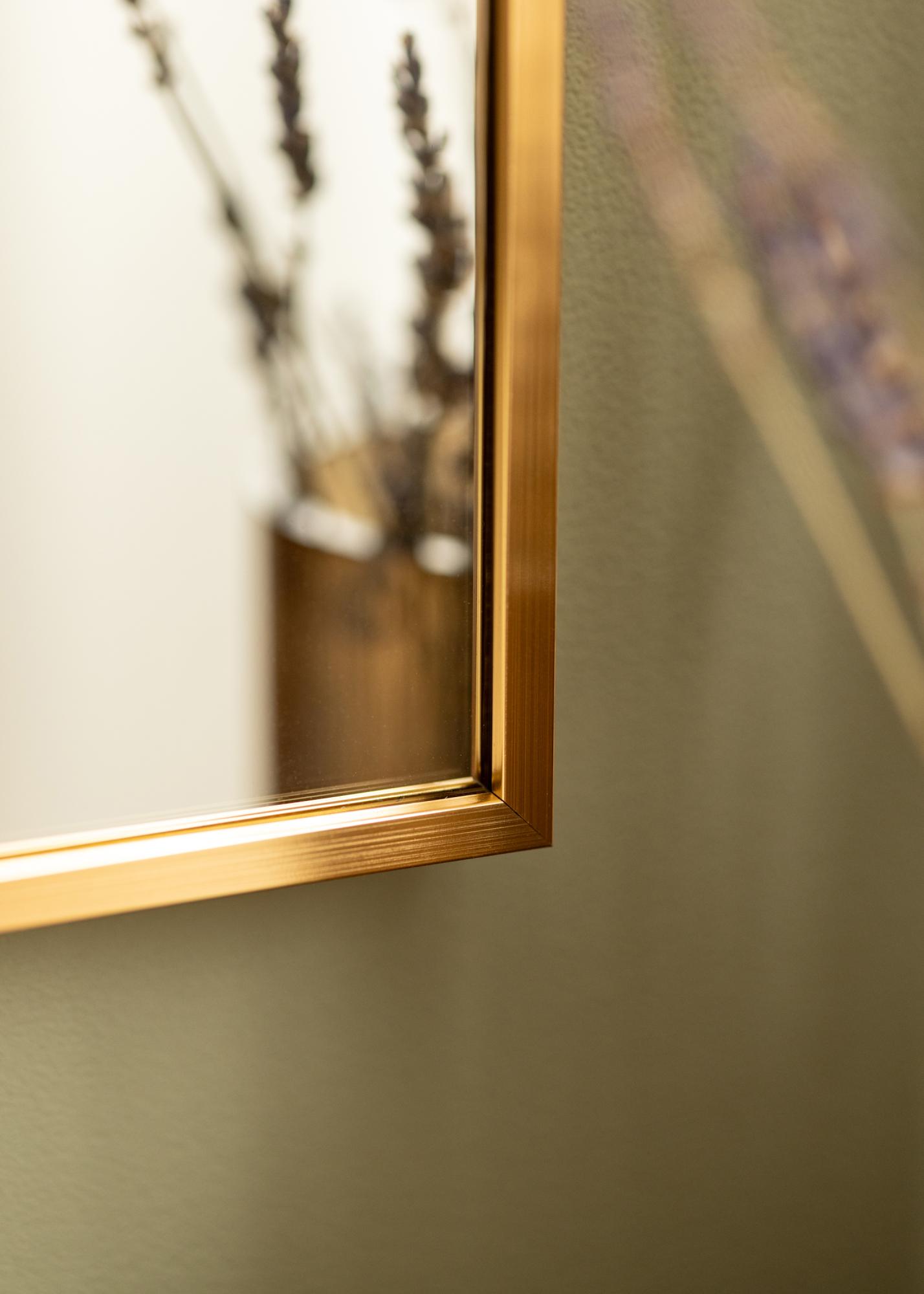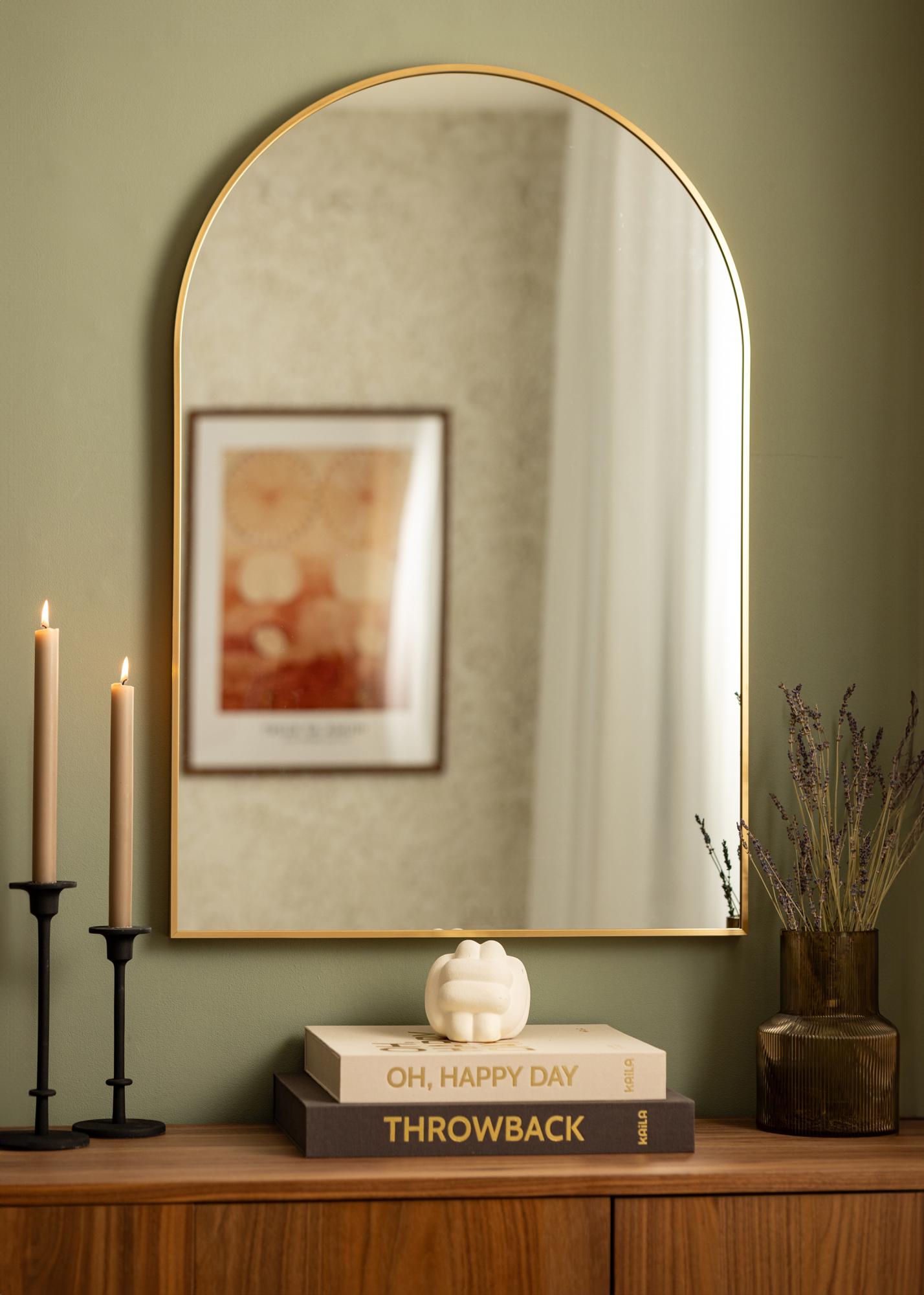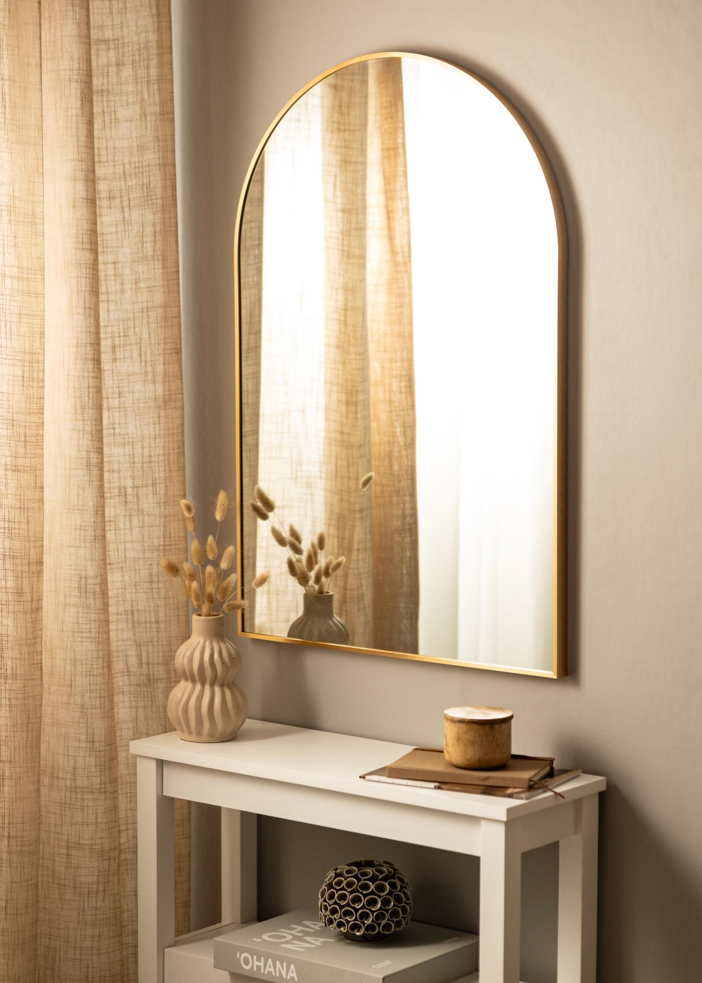 Detta är en modern väggspegel som kan användas i varje rum. Du kan antingen låta den bli en trendig detalj i sovrummet eller vardagsrummet, eller använda den som badrumsspegel eller hallspegel för att kunna spegla dig ordentligt när du gör dig redo för dagen. Spegeln har en 28 mm djup ram i metall, med en exklusiv guldnyans som ger den en förträfflig finess. Den stilfulla valvinspirerade formen förstärker det lyxiga uttrycket ytterligare.