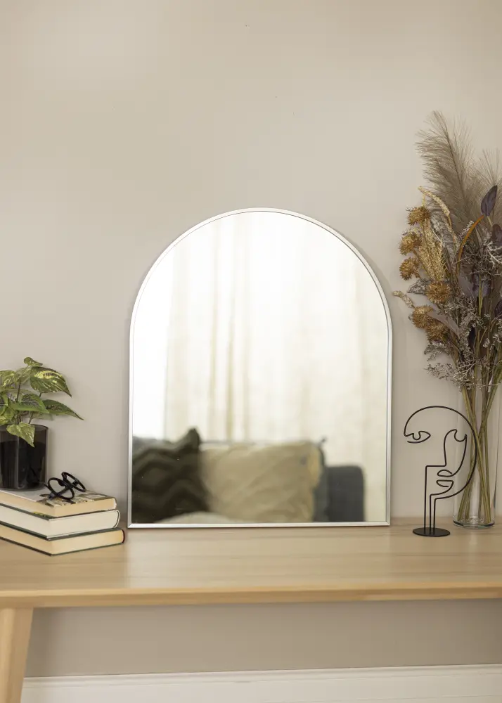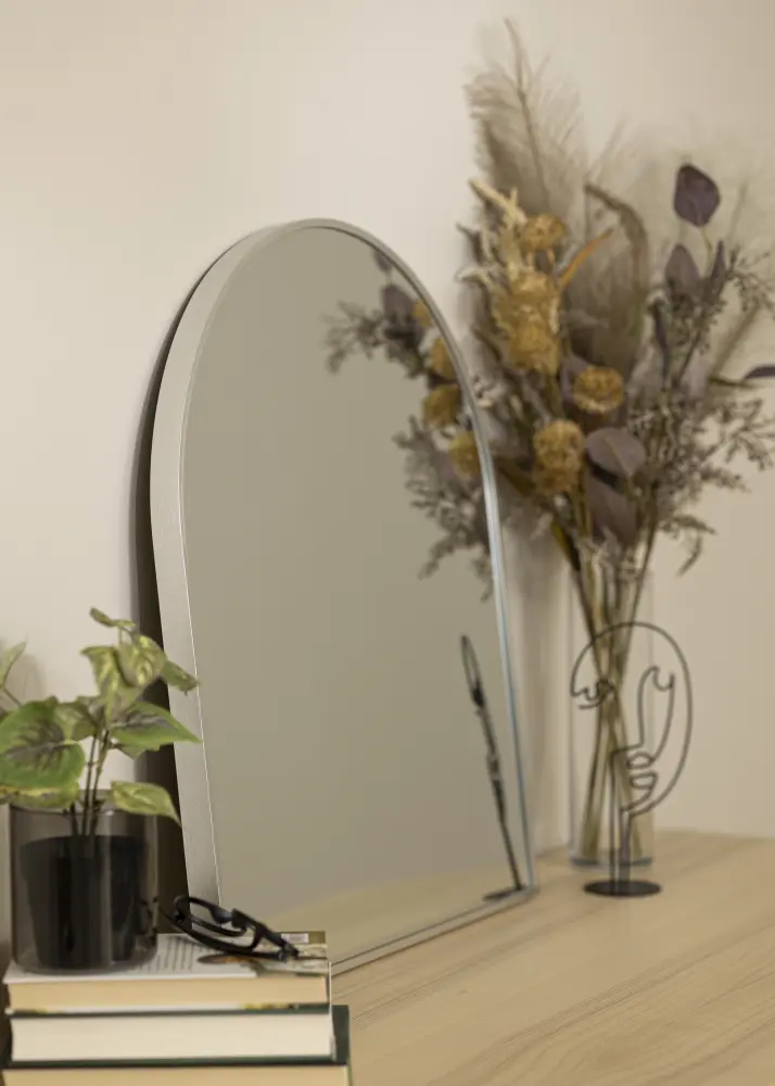 Denna väggspegel är både trendig och funktionell – med andra ord perfekt i varje hem! Den valvformade designen kompletteras av en 28 mm djup ram i en silvernyans, som ger hela spegeln ett modernt uttryck. Ramen är tillverkad i metall.