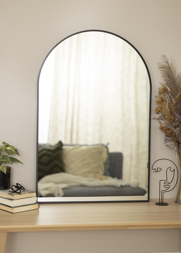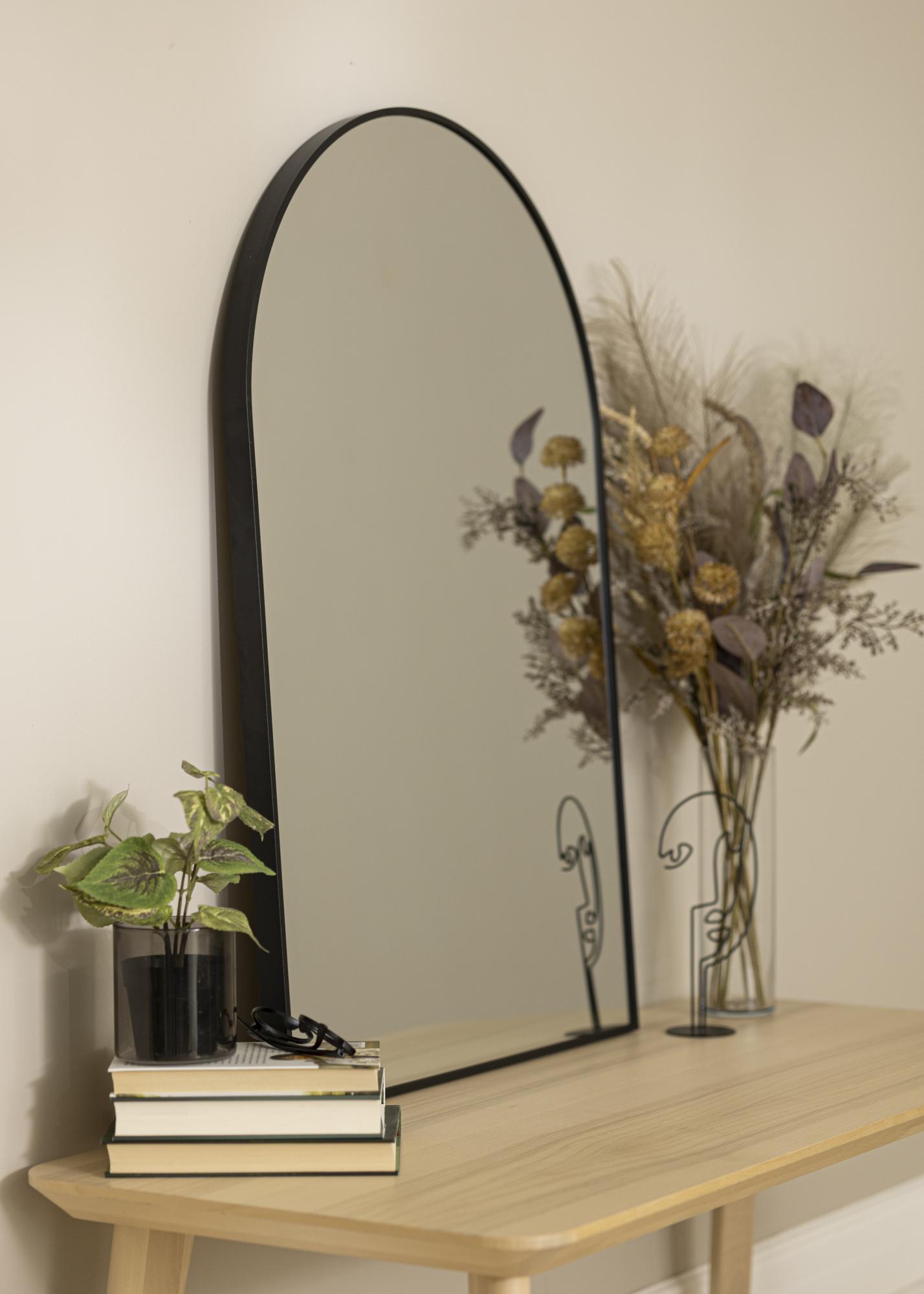 Detta är ett utmärkt val för dig som letar efter en spegel i modern design med trendigt valvformat utförande och stilfull svart ram. Spegelramen är 28 mm djup och tillverkad i metall. Denna spegel blir en given dekorativ detalj i hallen eller vardagsrummet, där den kommer att reflektera ljus från rummets alla ljuskällor på ett vackert vis. Det robusta materialet gör att det även går bra att använda den i badrummet.