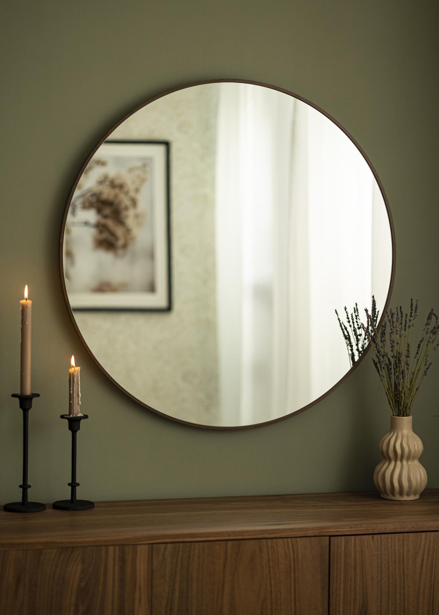 Upptäck den stilrena elegansen med vår vägghängda spegel, perfekt för att addera en känsla av rymd och ljus i ditt hem. Med en imponerande diameter på 80 cm, blir denna spegel en omedelbar blickfångare i vilket rum som helst. Dess runda form ger en mjuk och inbjudande känsla, samtidigt som den valnötsfärgade ramen i aluminium tillför en touch av sofistikation.