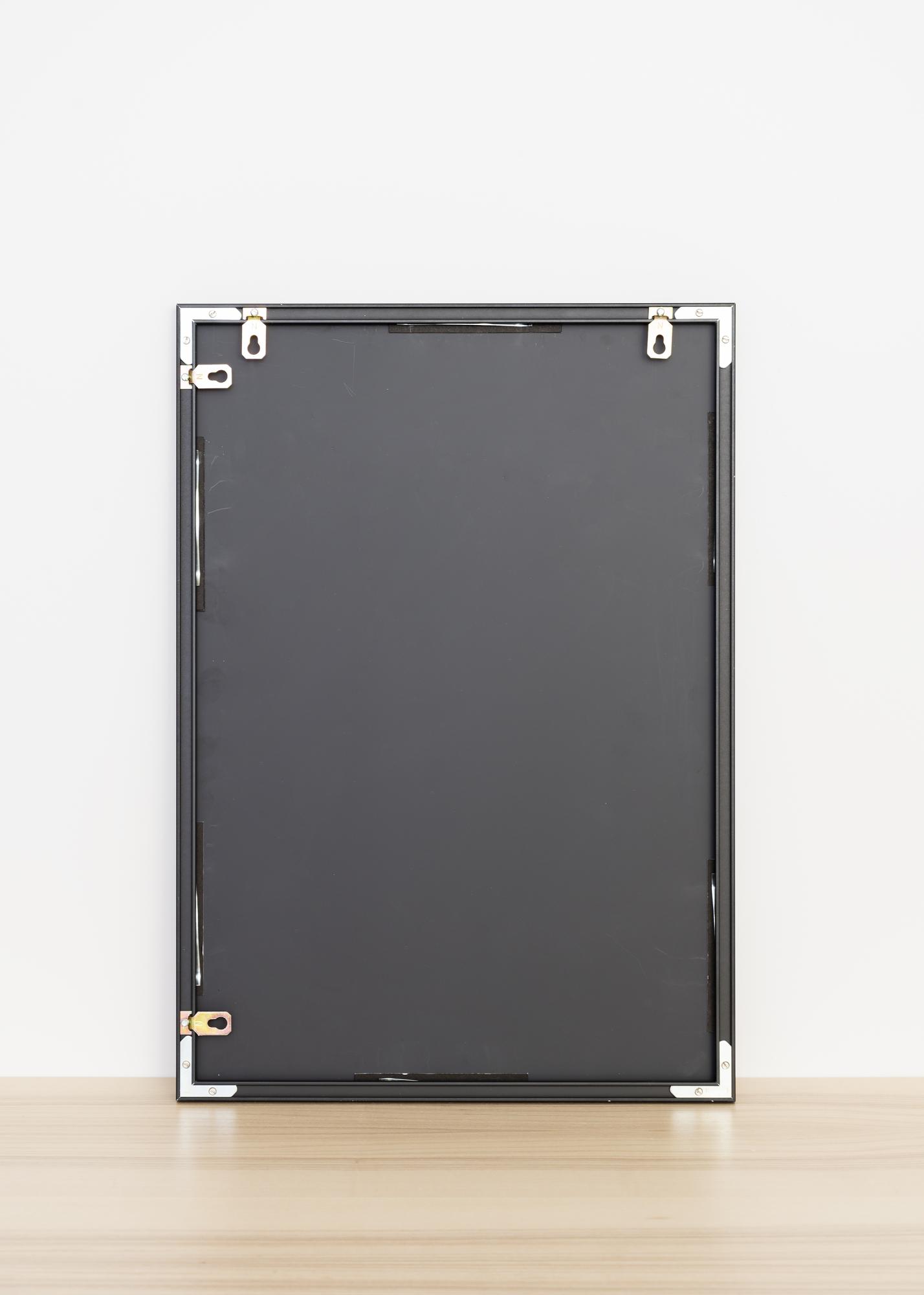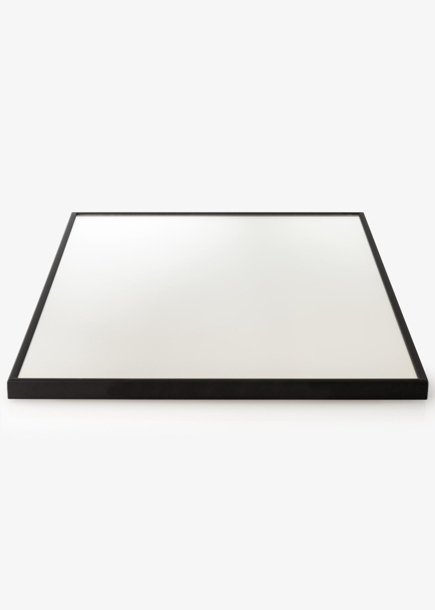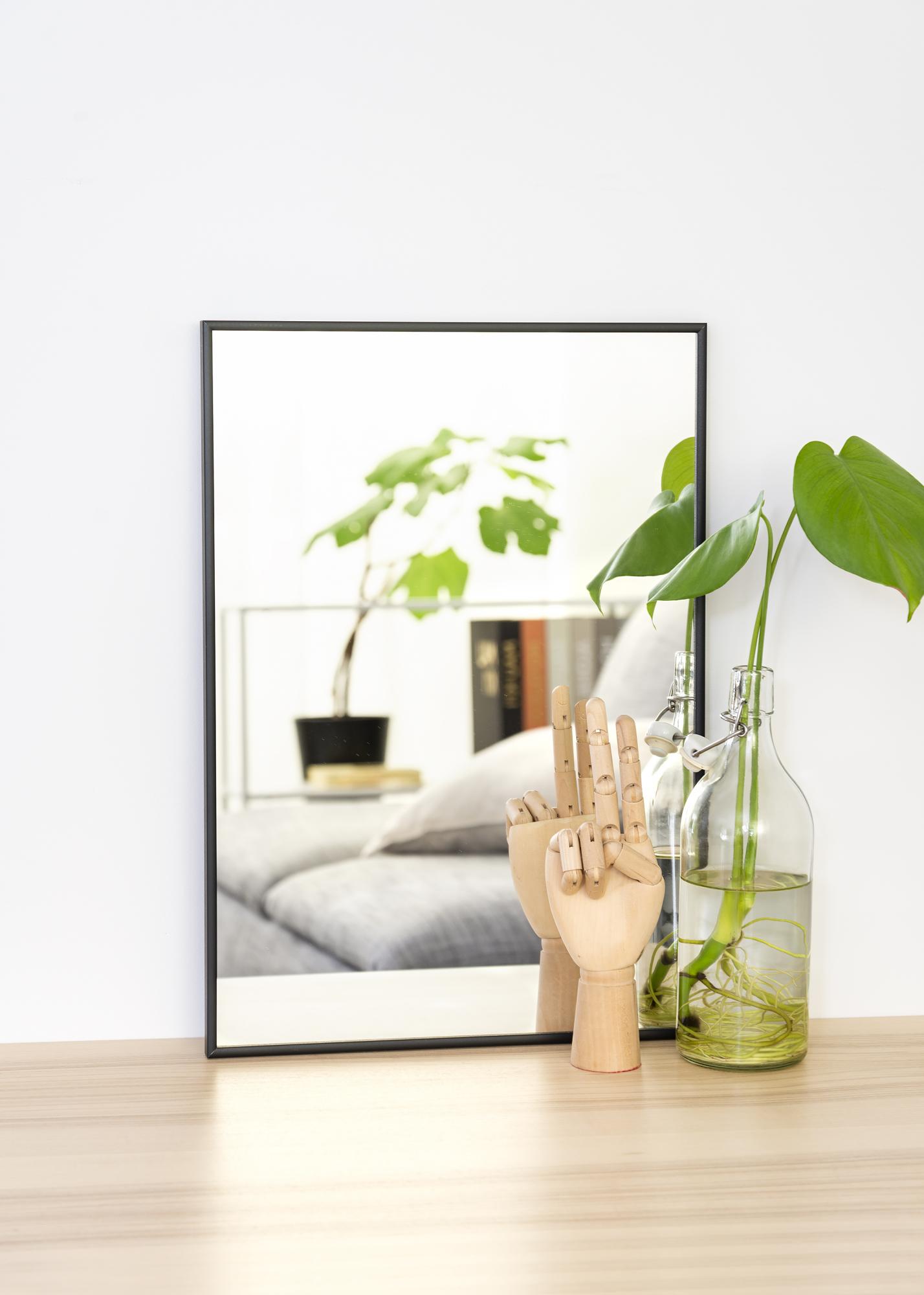 En stilren spegel med svart aluminiumram. Spegeln är utrustad med smarta väggfästen, som gör att den är enkel att hänga upp.