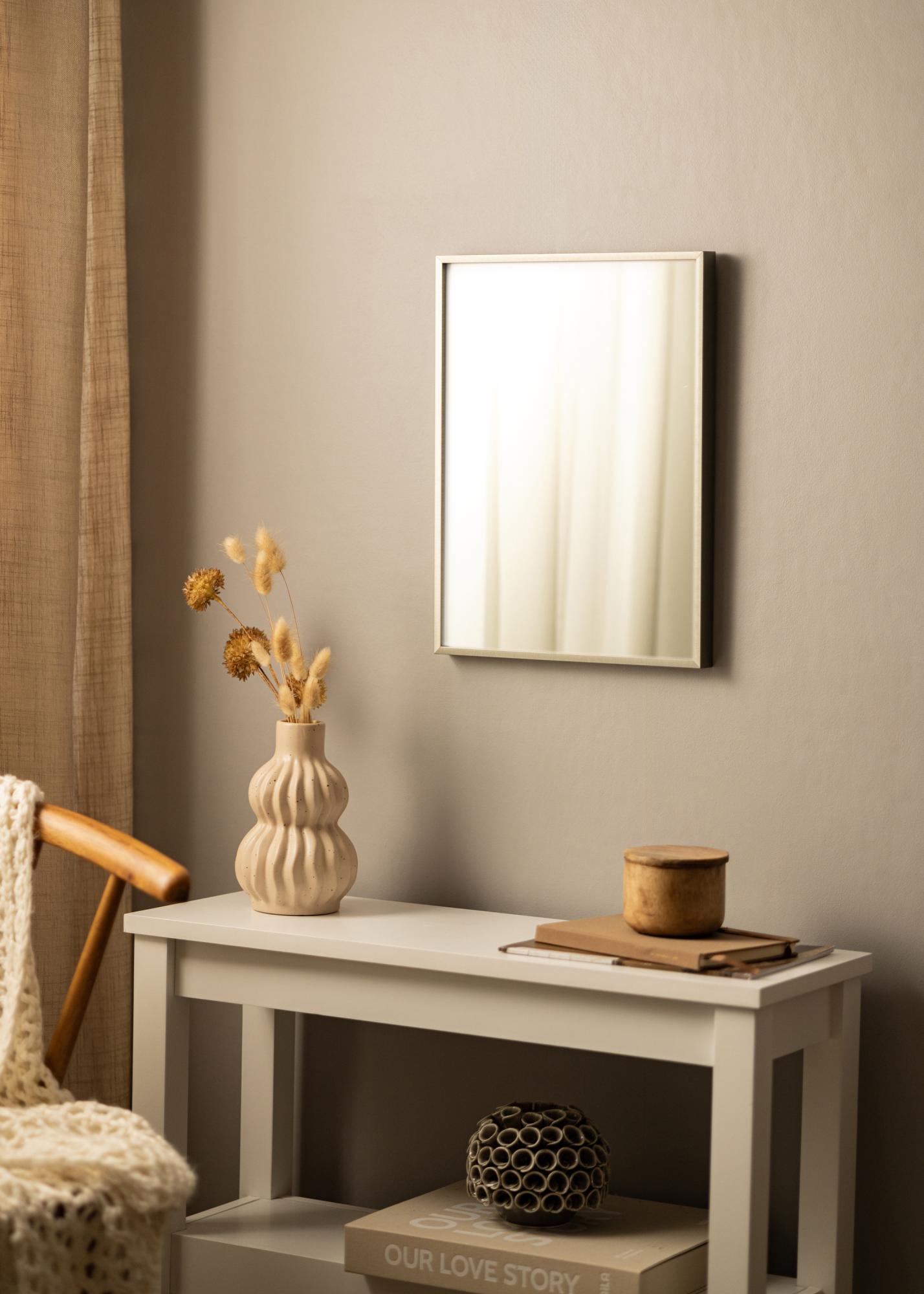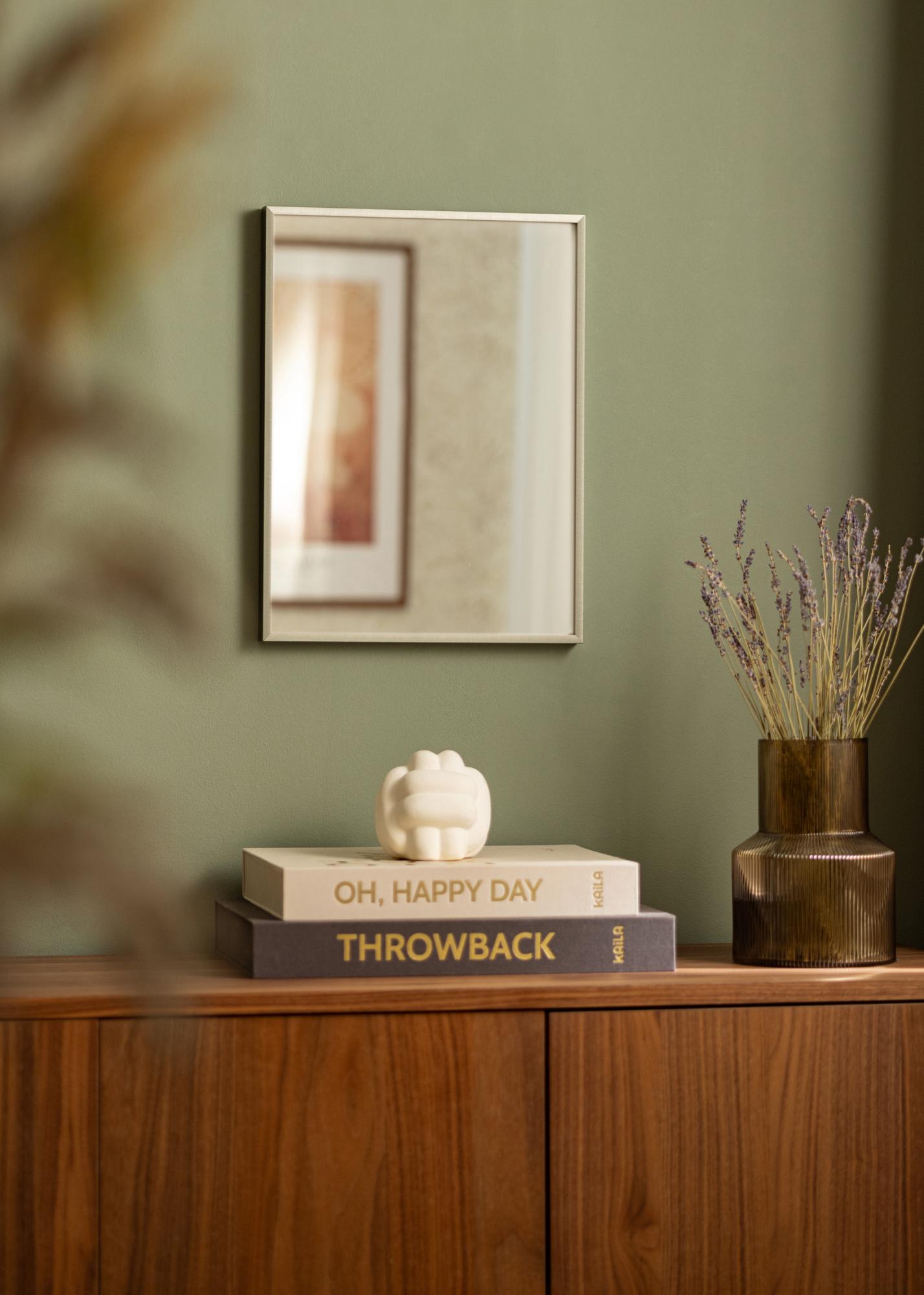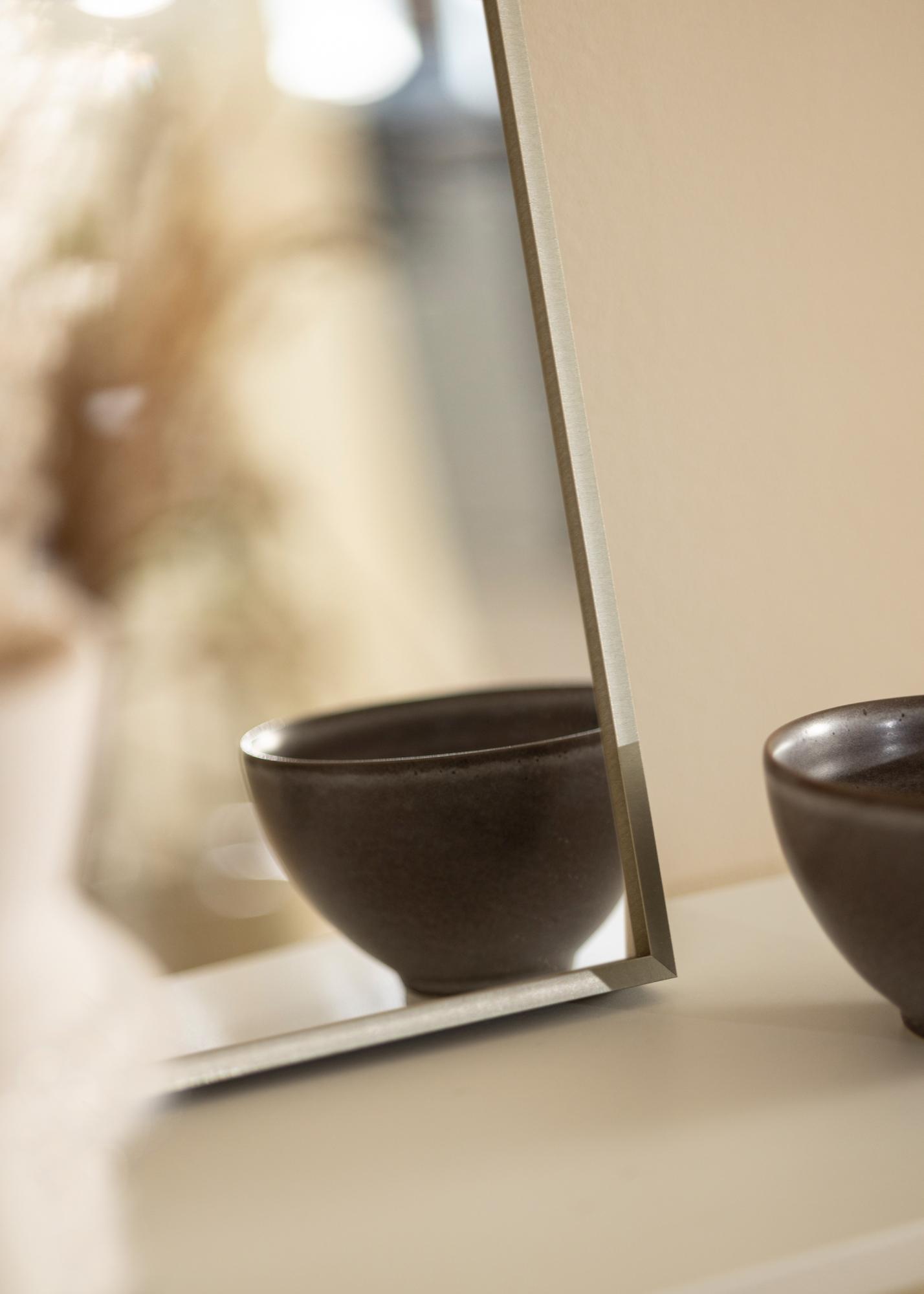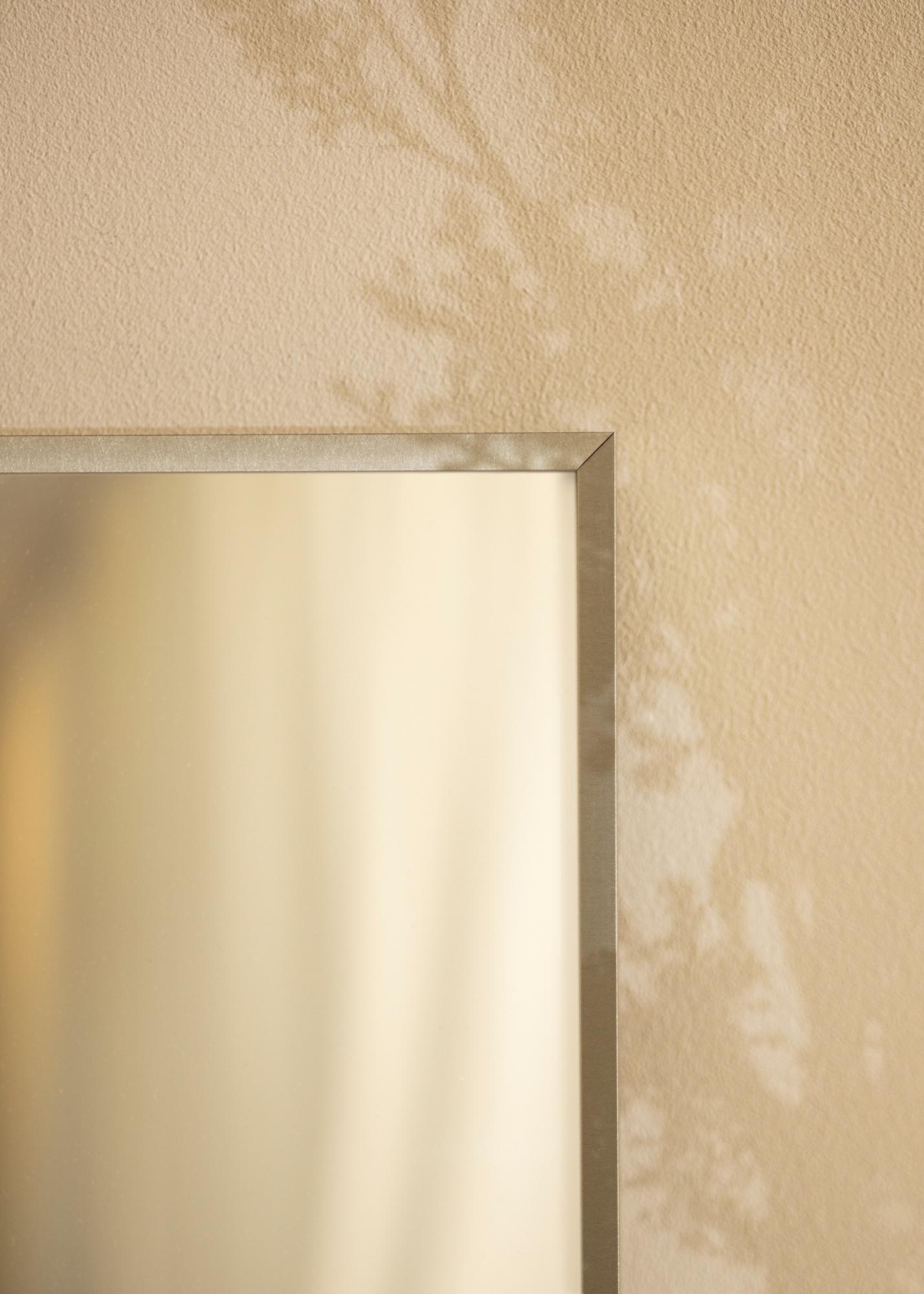 Denna spegel har en vacker silverfärg som ger ett tidlöst och sofistikerat intryck. Ramen är 7,8 mm bred och tillverkad av aluminium, vilket ger spegeln en robust och hållbar konstruktion samtidigt som den behåller en lätt och smidig känsla. Djupet på 25,9 mm gör att spegeln sitter stadigt mot väggen och ger ett elegant utseende.