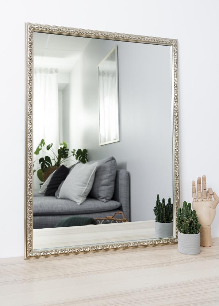 Starta ramväljaren »Nost Silver heter en serie väggspeglar. Ramen är rikligt dekorerad av oregelbundna symboler som ger ett lite mystiskt intryck.