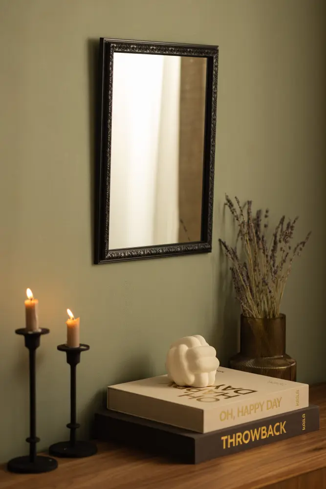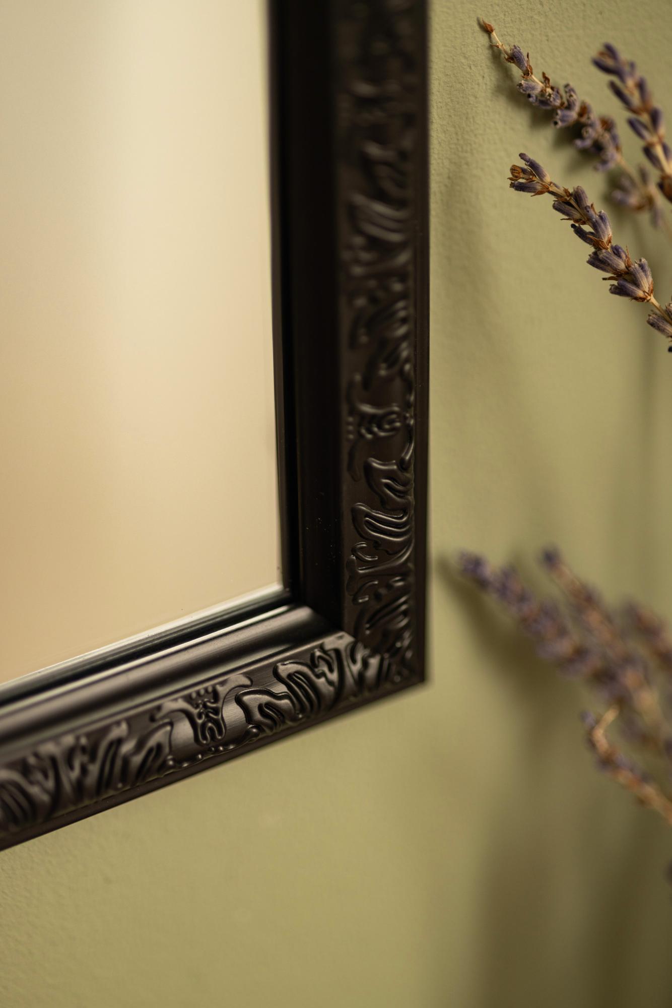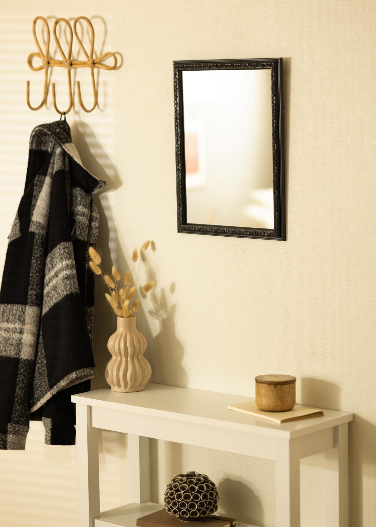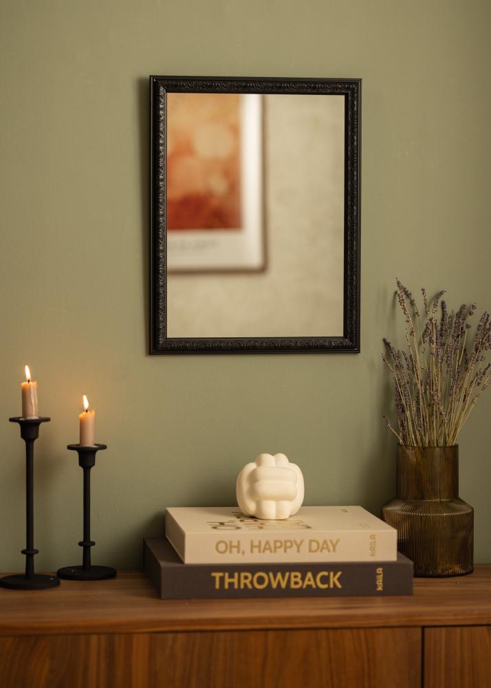 Starta ramväljaren »Nost Svart heter en serie väggspeglar. Ramen är rikligt dekorerad av oregelbundna symboler som ger ett lite mystiskt intryck.