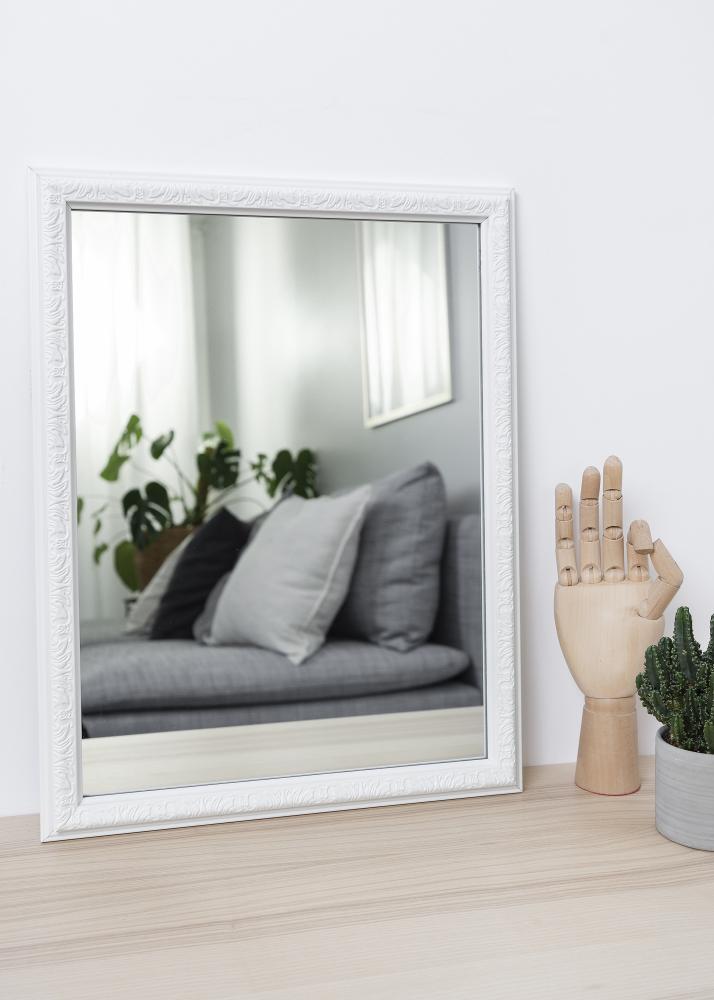 Starta ramväljaren »Nost Vit heter en serie väggspeglar. Ramen är rikligt dekorerad av oregelbundna symboler som ger ett lite mystiskt intryck.