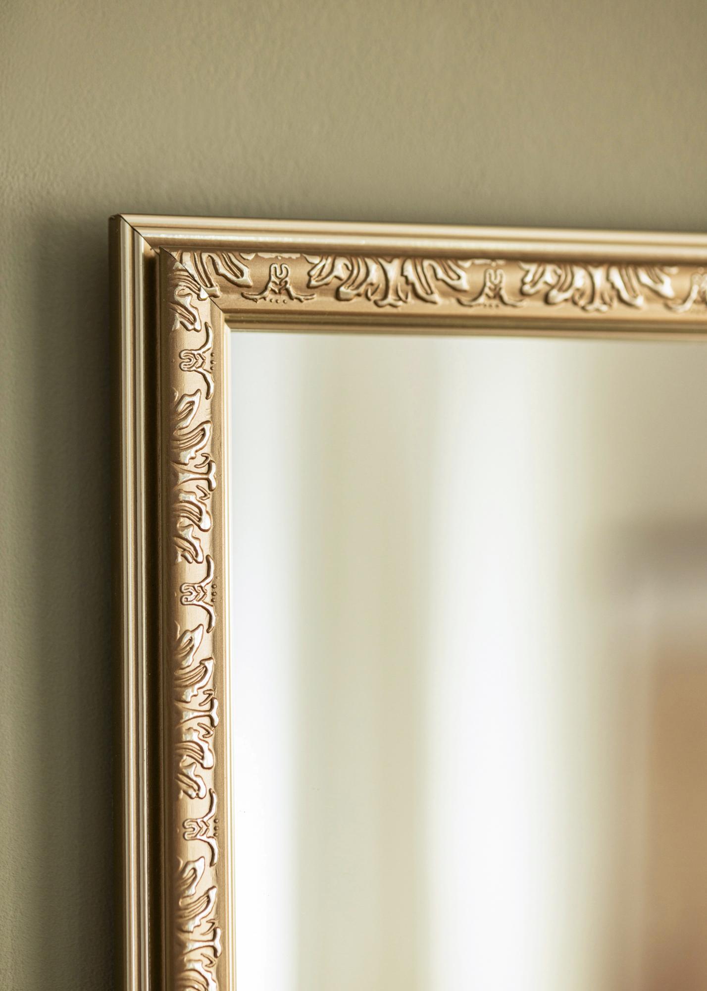 Låt denna tidlösa spegel pryda väggarna i ditt hem. Den silverfärgade ramen har unik profil och är dekorerad med vackra ornament. Det klassiska utseendet gör att den kommer bli ett utmärkt tillskott i nästan alla rum och den passar bra både för sig själv eller som ett intressant inslag i tavelväggen!