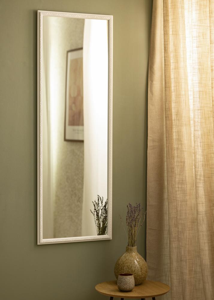 Denna väggspegel är en stilren inredningsdetalj som vackert reflekterar ljus från rummets alla ljuskällor. Den vita ramlisten ger ett ljust och fräscht intryck, som perfekt kompletteras av det ramens dekorativa profil och vackra mönster.