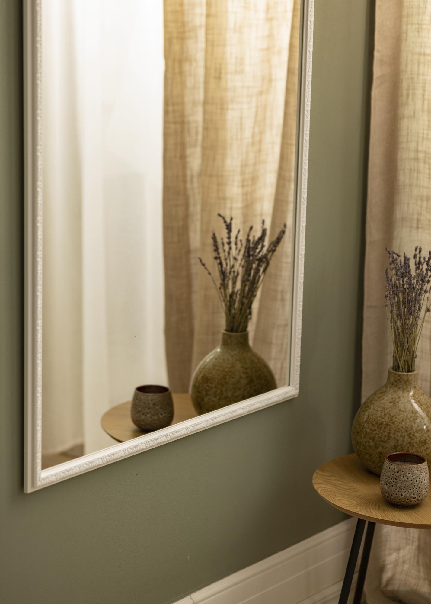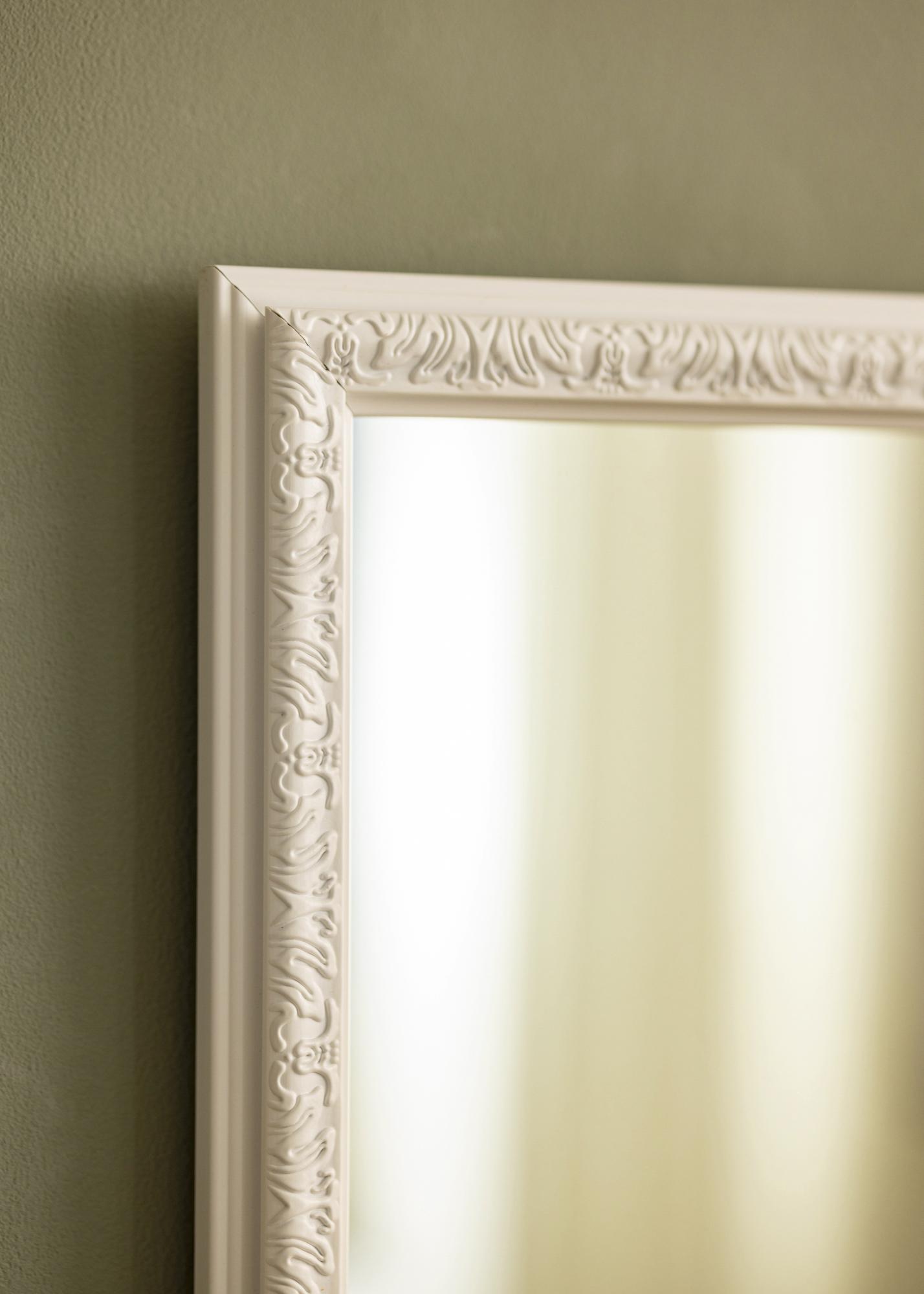 Denna väggspegel är en stilren inredningsdetalj som vackert reflekterar ljus från rummets alla ljuskällor. Den vita ramlisten ger ett ljust och fräscht intryck, som perfekt kompletteras av det ramens dekorativa profil och vackra mönster.