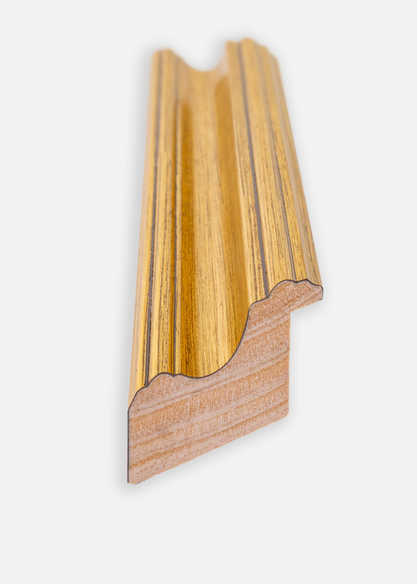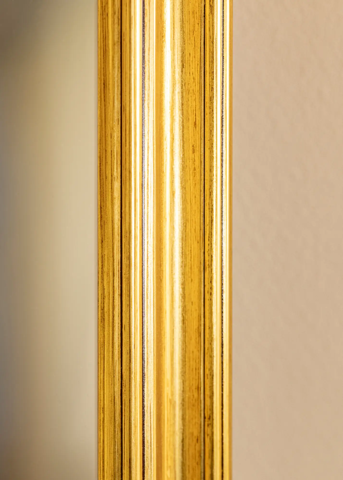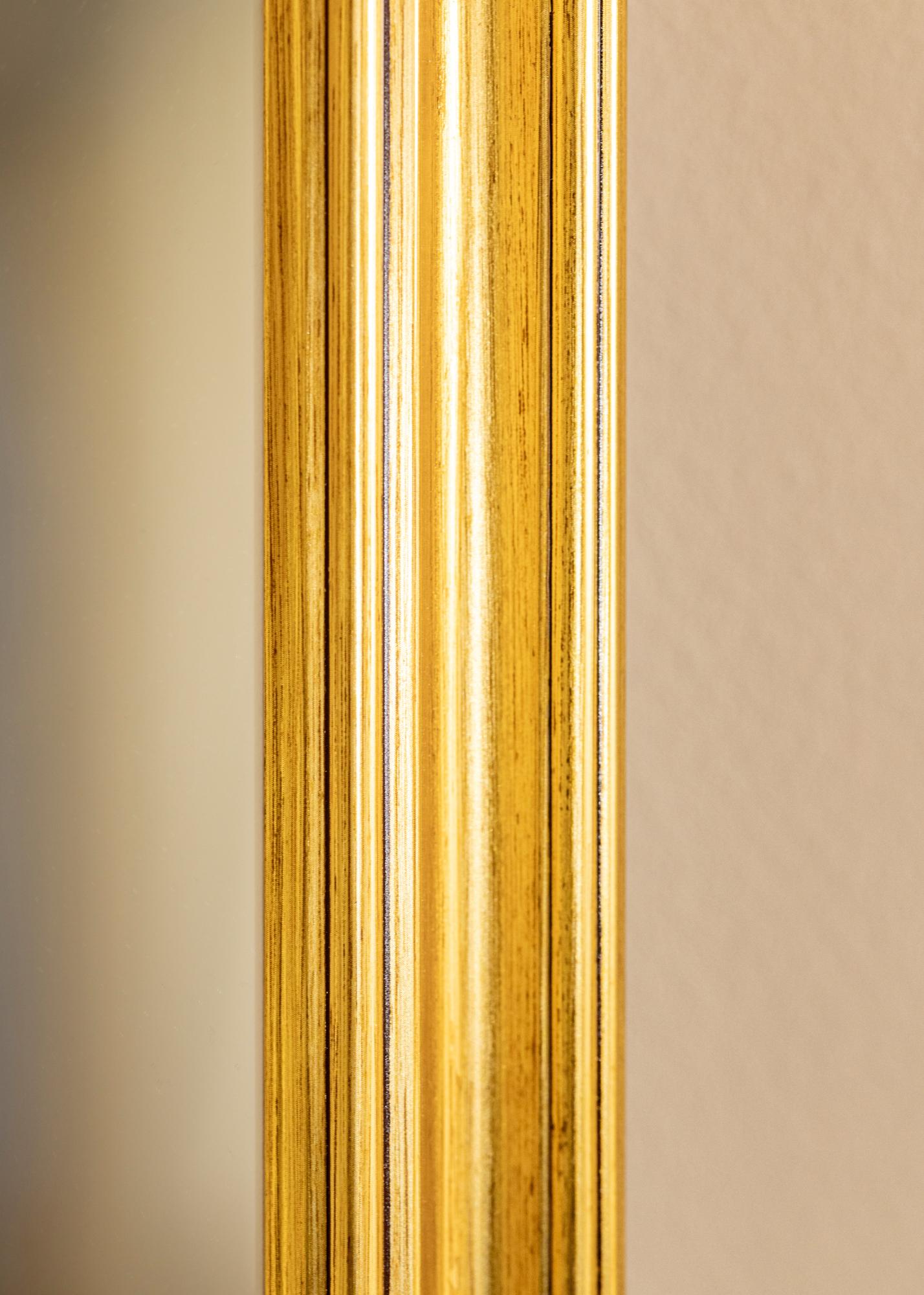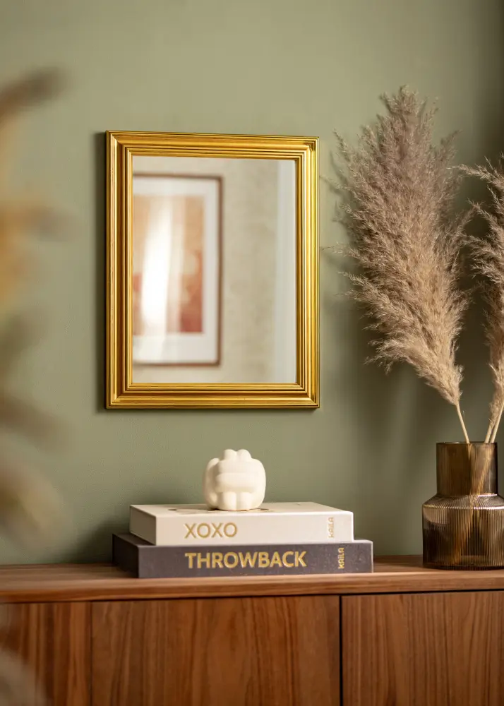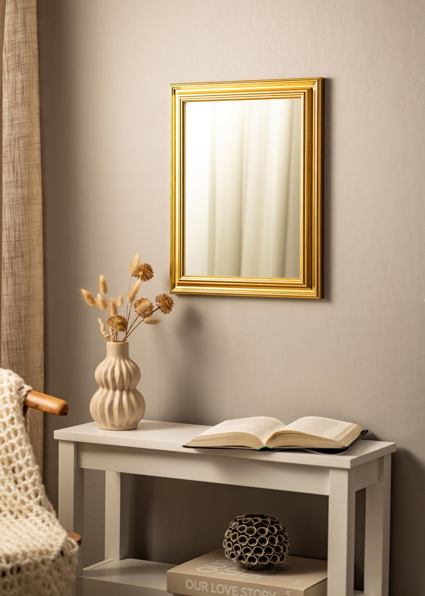 Klassiskt profilerad guldfärgad spegel med ram i trä som känns handmålad, det ger spegeln en levande känsla och en fin lyster. Den breda ramlisten ger spegeln ett exklusivt utseende och gör att spegeln passar lika bra in i ett hem inrett med antikviteter, som i det moderna hemmet med en romatisk eller elegant inredning. Kombinera gärna spegeln med ett par mässingslampetter och tavlor i guldramar för att skapa en helhetskänsla i rummet.