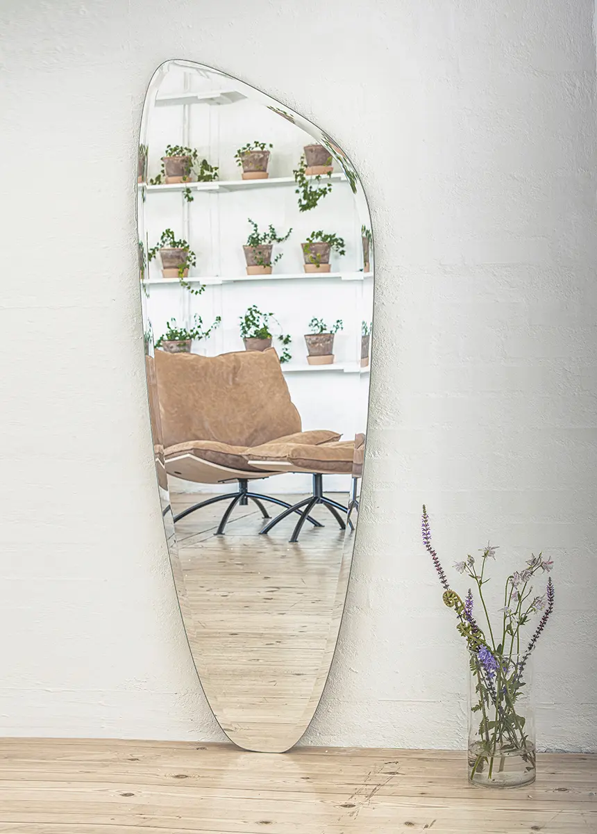 Detta är en riktigt snygg spegel som är både stor och snyggt formad – den här spegeln kommer du att bli nöjd med! Du får med väggfäste så att du enkelt kan fästa den.
