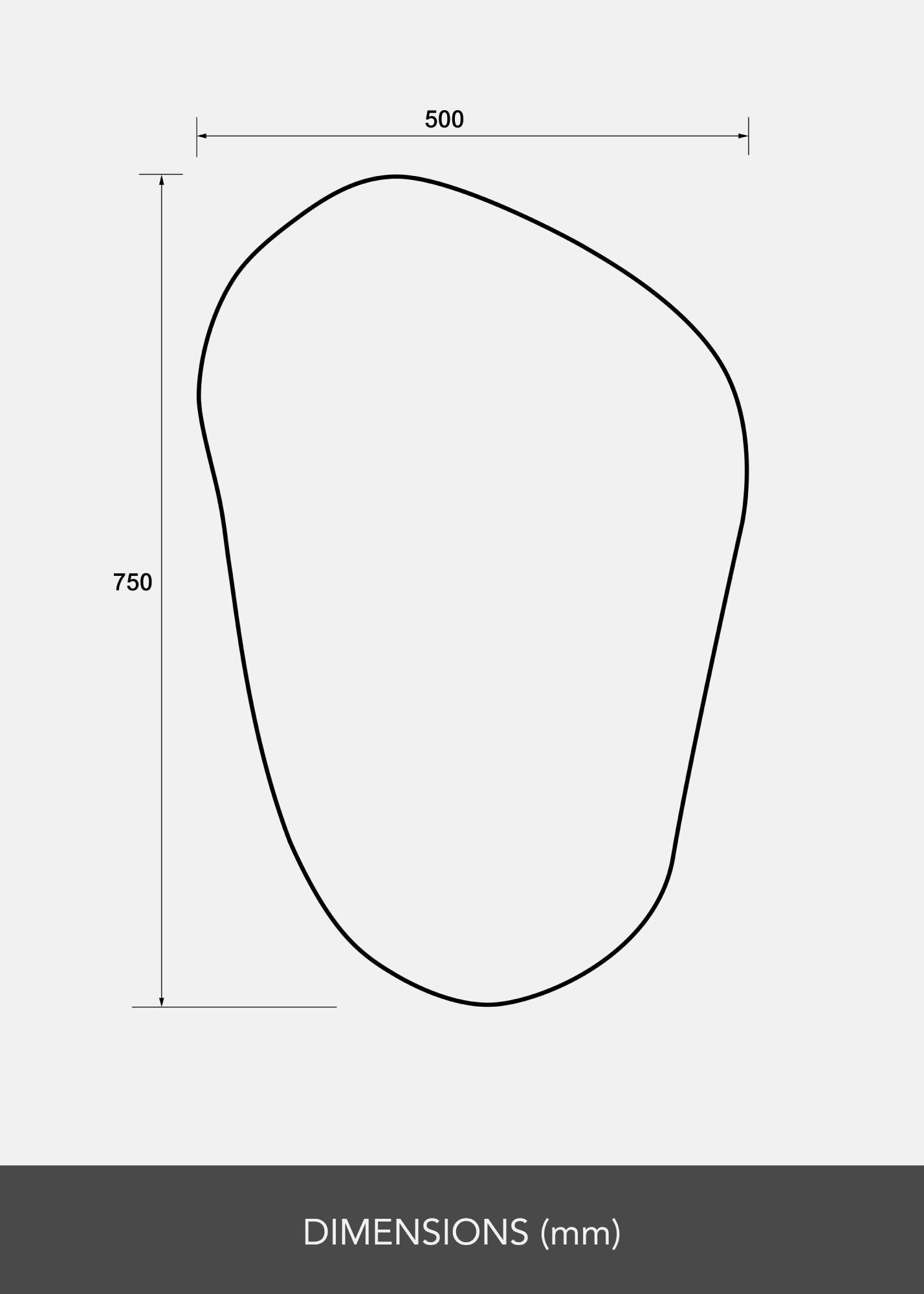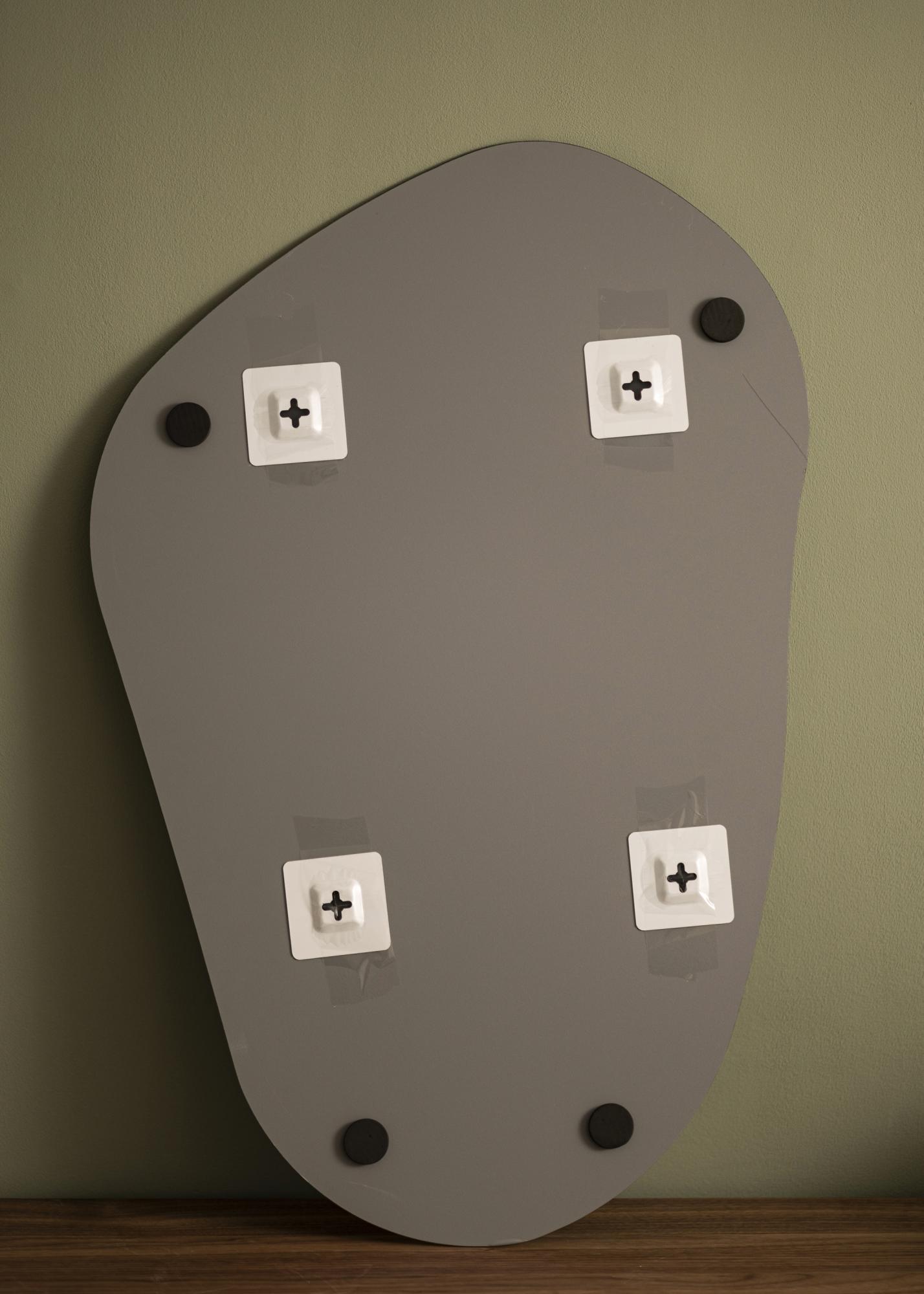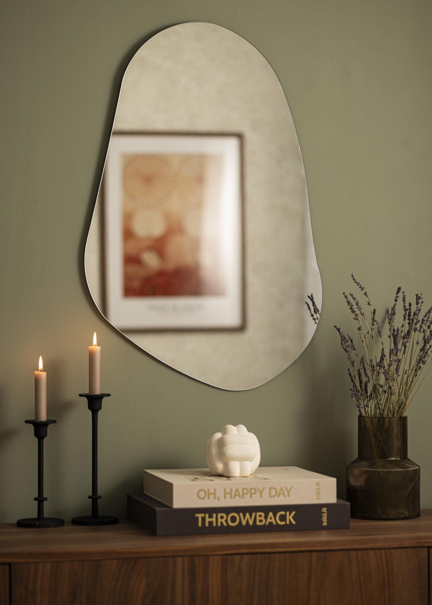 Denna spegel har en organisk, asymmetrisk och mjukt böljande form som ger ett modernt och konstnärligt uttryck. Med sina rundade kurvor och avsaknad av raka kanter påminner den om en frihandsritad siluett, likt en naturligt formad sten eller en utdragen droppform.