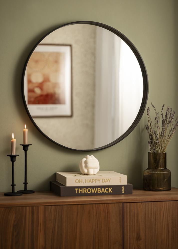 Upptäck den eleganta enkelheten i vår runda spegel, en tidlös inredningsdetalj som passar perfekt i varje hem. Den här stilrena, runda spegeln utmärker sig med sin svarta ram, som ger en fräsch och modern känsla till rummet. Dess minimalistiska design gör att den smälter in i såväl klassiska som samtida miljöer, och blir ett praktfullt blickfång på väggen.
