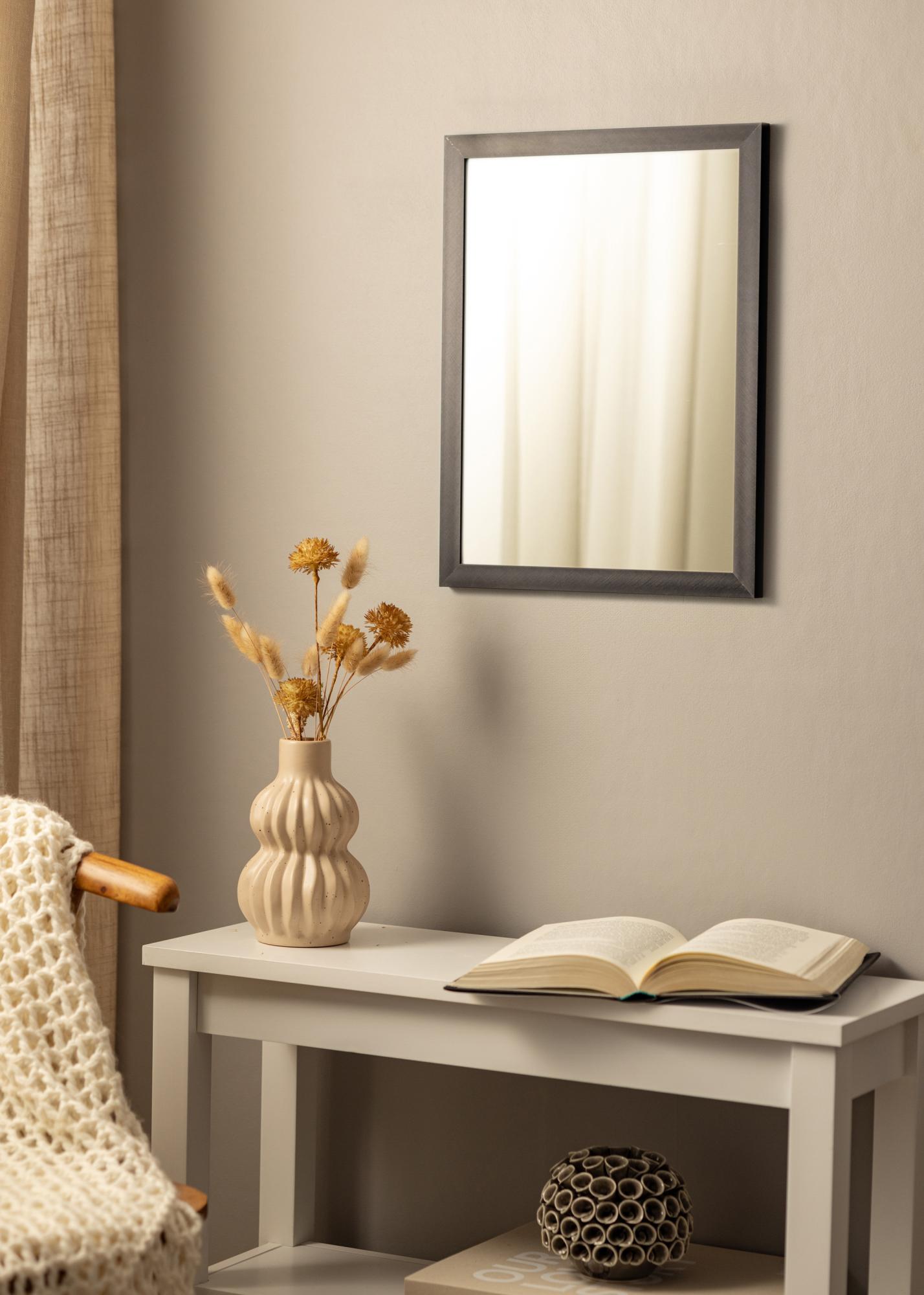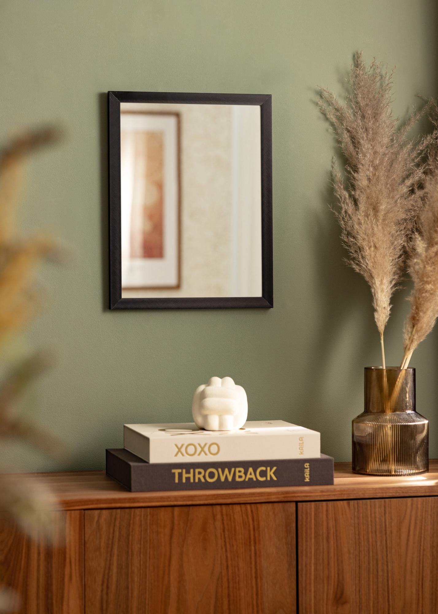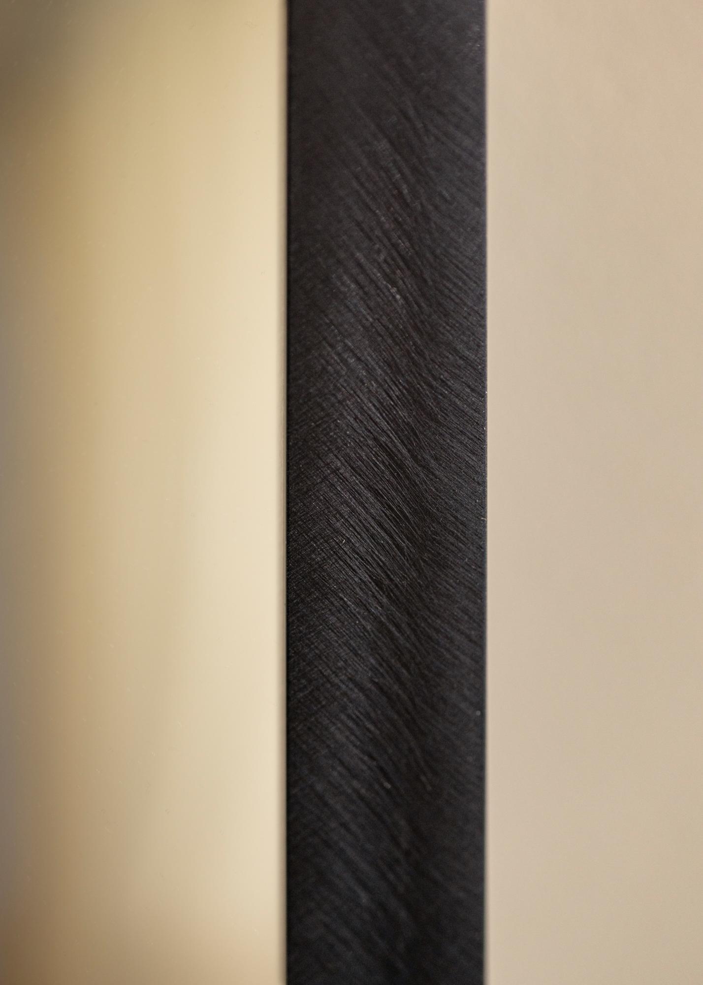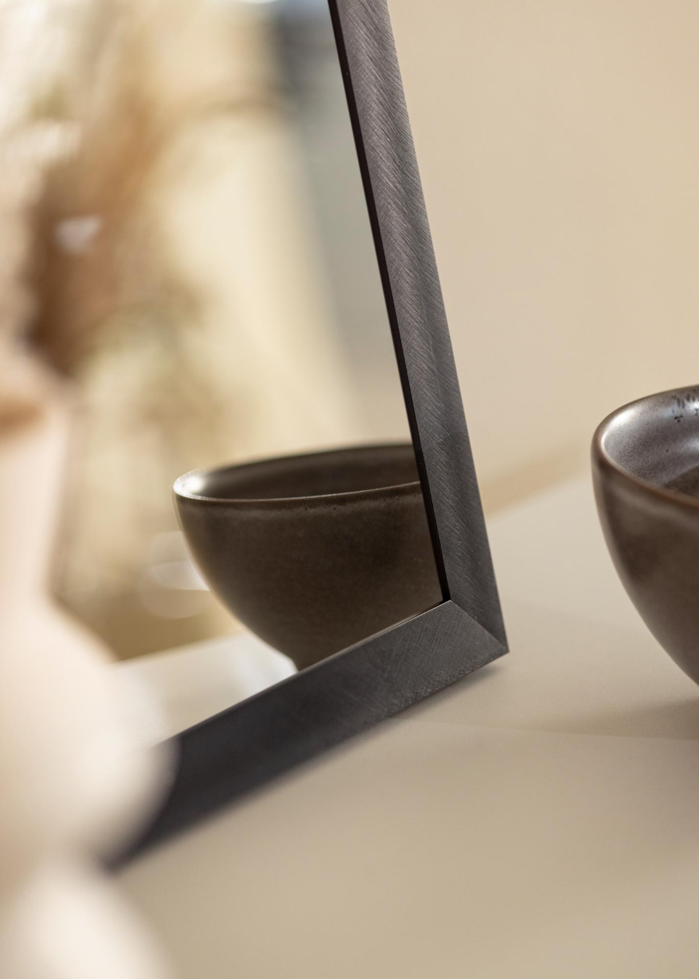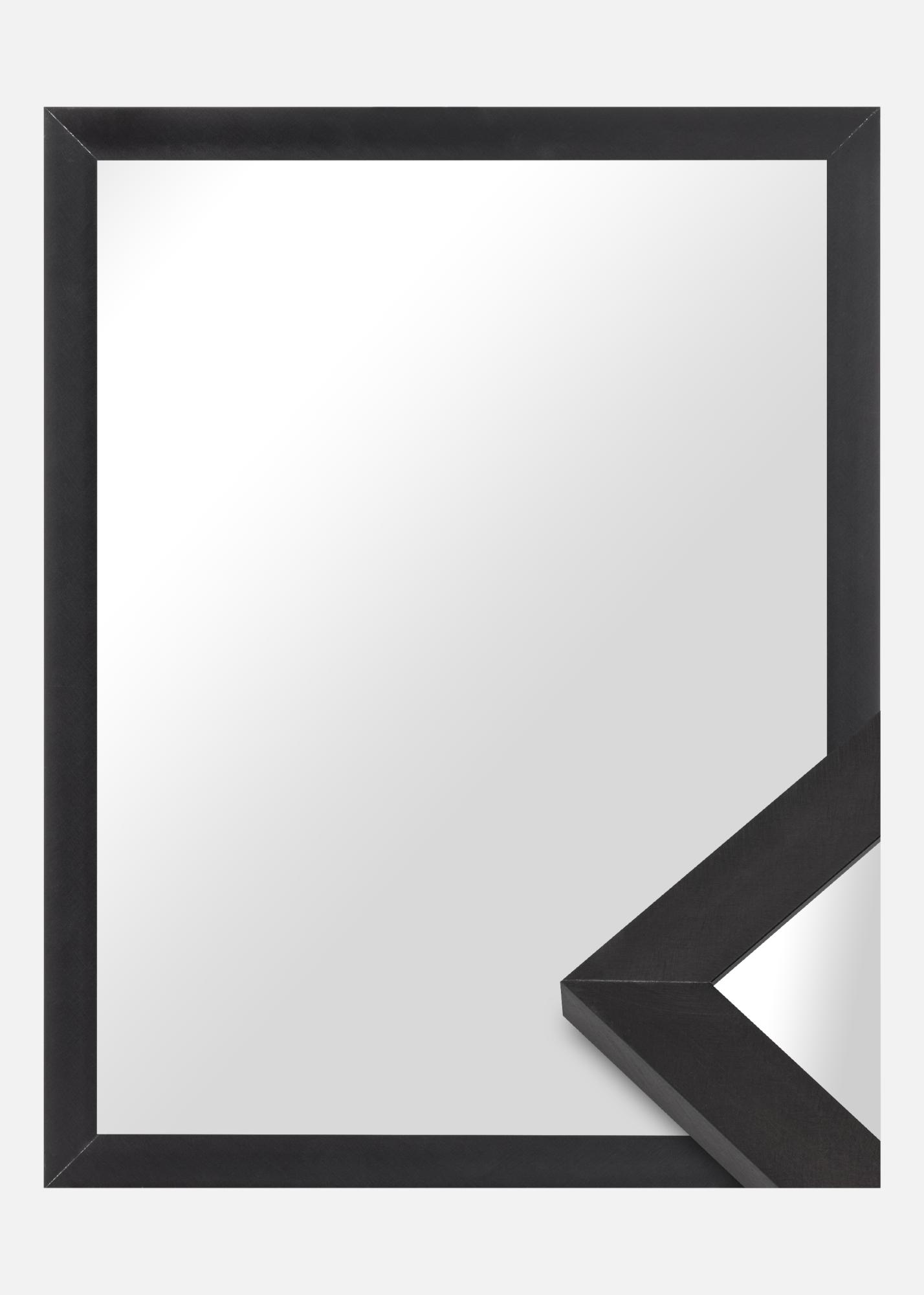 Svart stilren spegel med en ram av aluminium som passar in i alla typer av inredningar och miljöer. Den svarta ramlisten är smal men känns ändå stabil och har ett minimalistiskt uttryck.Spegelramen är med sin strikta form lätt att placera och är fin att kombinera med tavlor med grafiska motiv i svarta ramar. En spegel kan även användas för att få rummet att kännas större, eller för att ljusa upp ett mörkt rum då den placeras mittemot ett fönster.