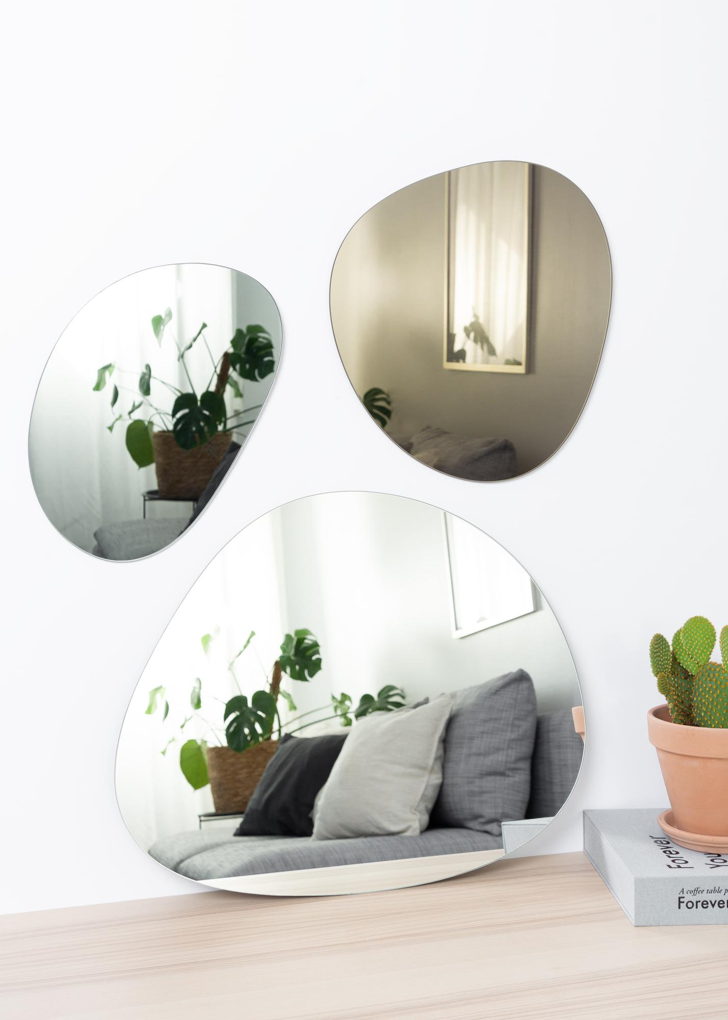 Detta är ett läckert spegelset med 3 stycken gråtonade speglar. De är i olika storlekar för att det ska bli extra kul när man placerar dem på väggen. De olika storlekarna på dessa speglar är snygga bredvid varandra och de passar mycket bra på väggen, oavsett rumsstorleken.
