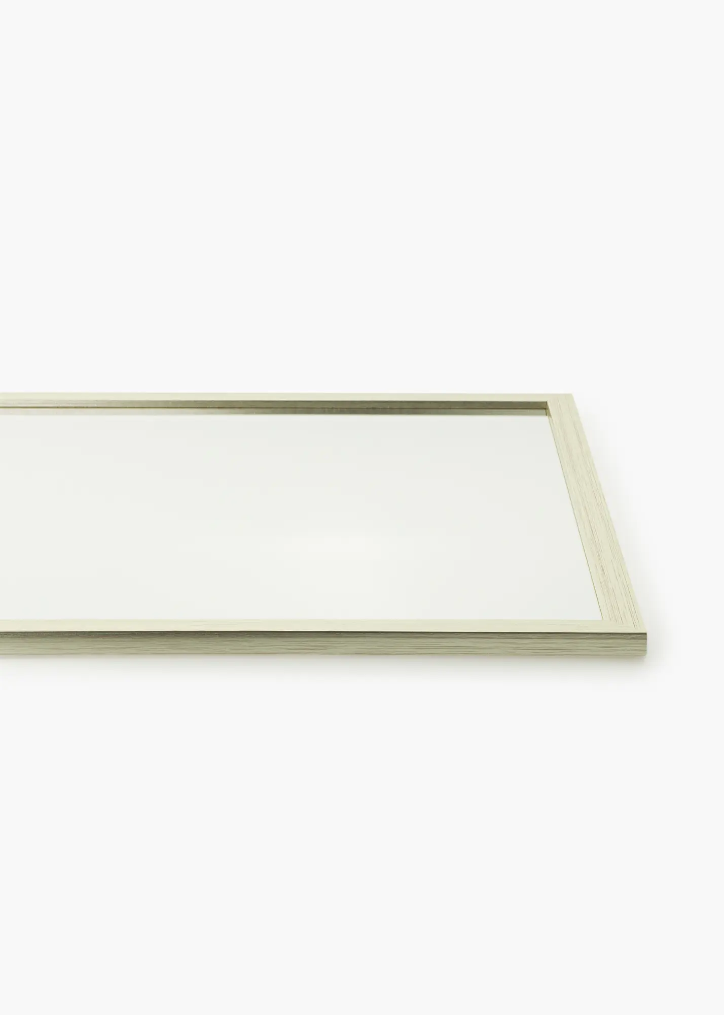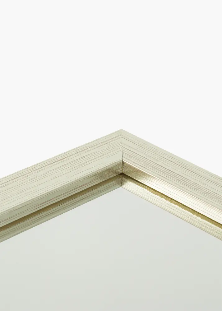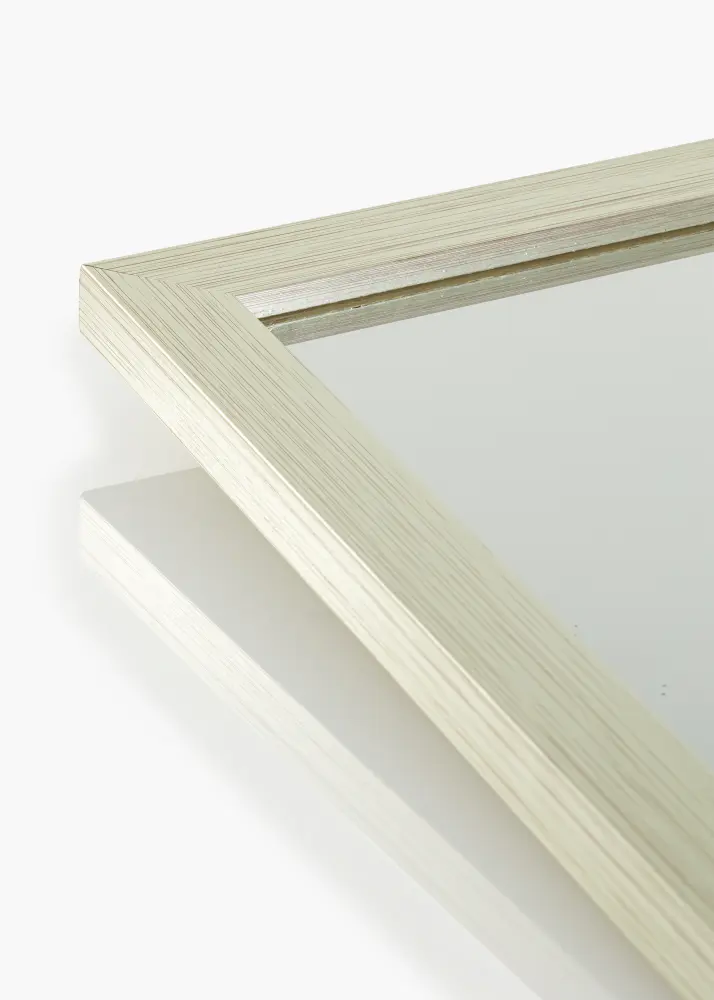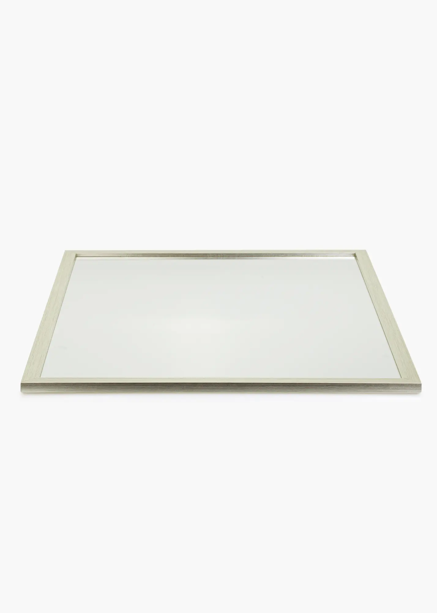Denna spegel är tillverkad i ayosträ, målad i en stilfull silvernyans. Ramen är 22 mm bred och har en rak profil, vilket skapar en något avskalad helhet. Placera spegeln i hallen, sovrummet eller vardagsrummet och låt den reflektera ljus från lampor och fönster på ett vackert vis.