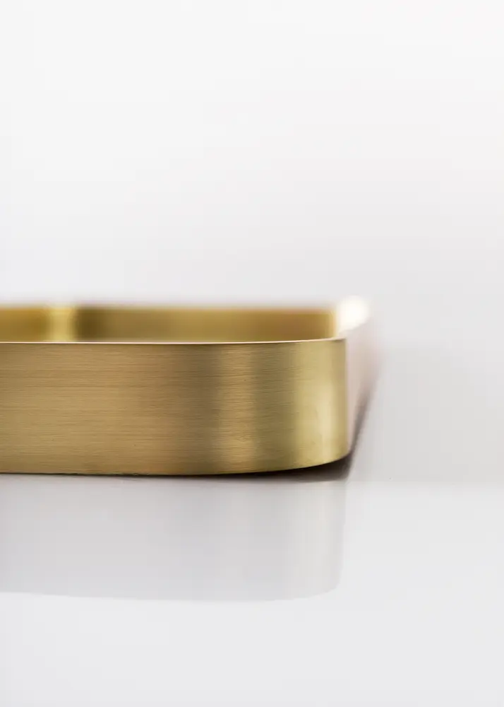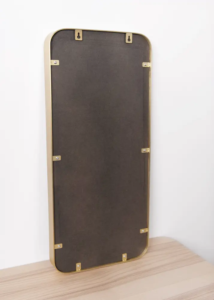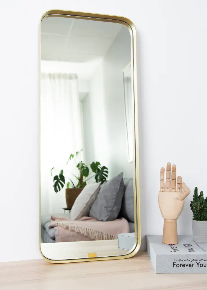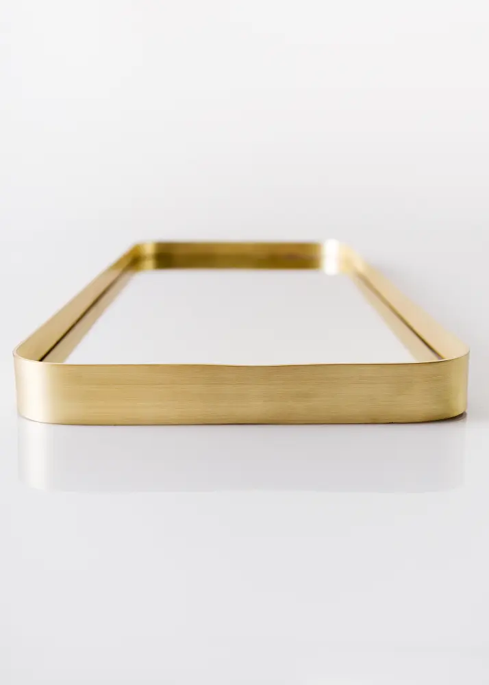 En rektangulär spegel i stilren dansk design. Ramen har rundande hörn och är tillverkad i metall med mässingsfinish, vilket ger ett mjukt och elegant intryck. Spegeln kan fästas på väggen eller enkelt lutas mot väggen ståendes på byrån eller hyllan. Denna smakfulla spegel kommer från danska Hübsch.