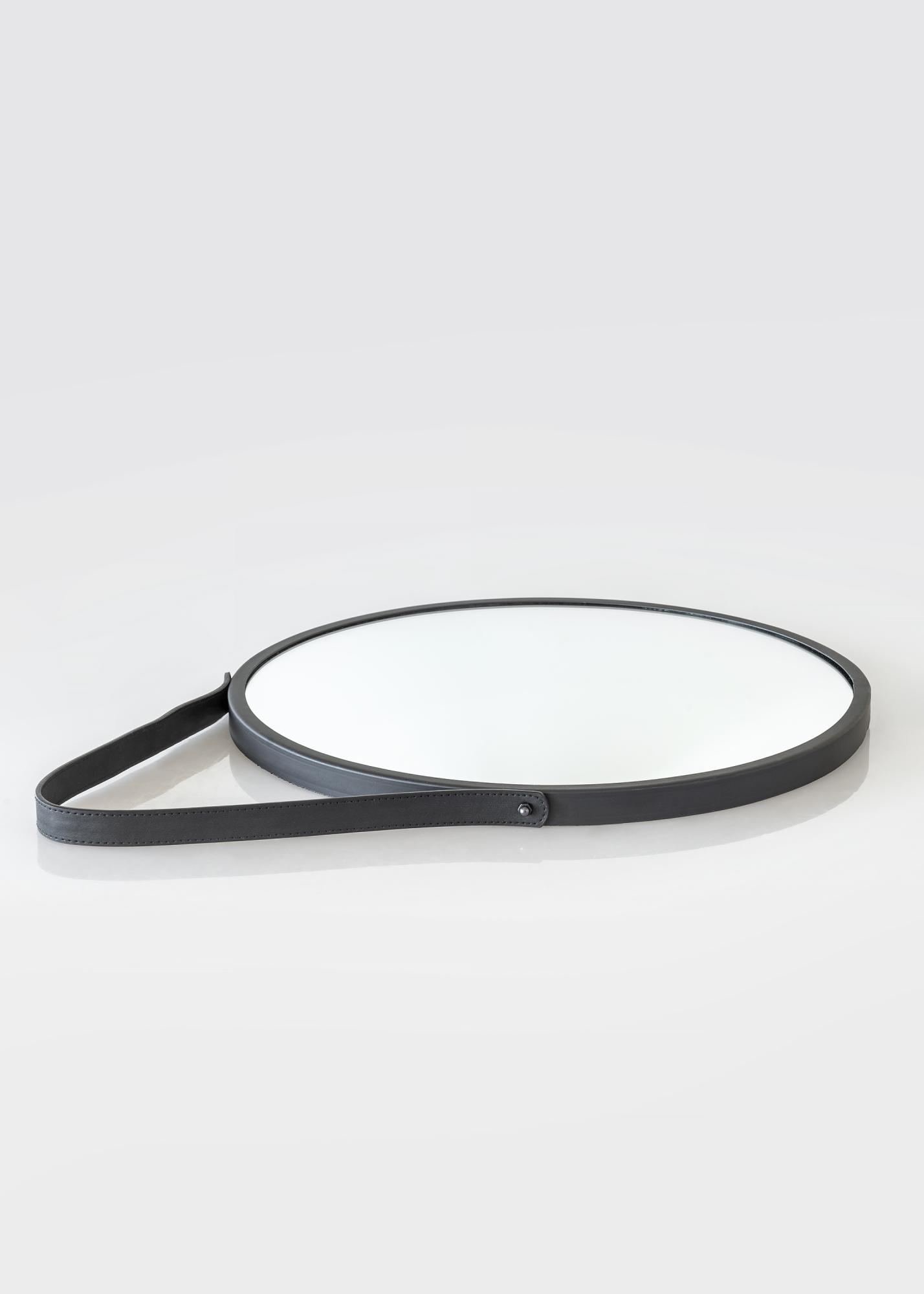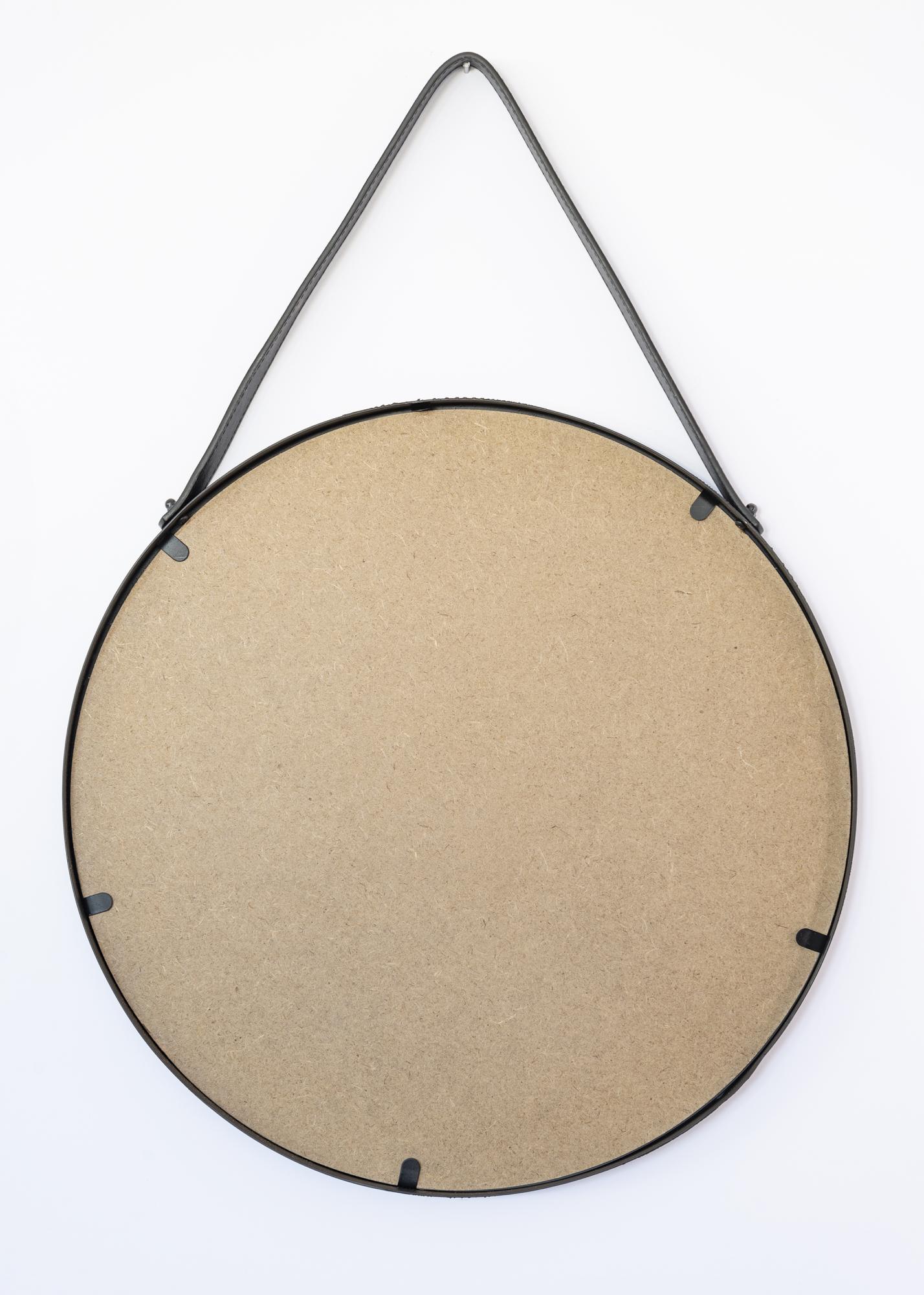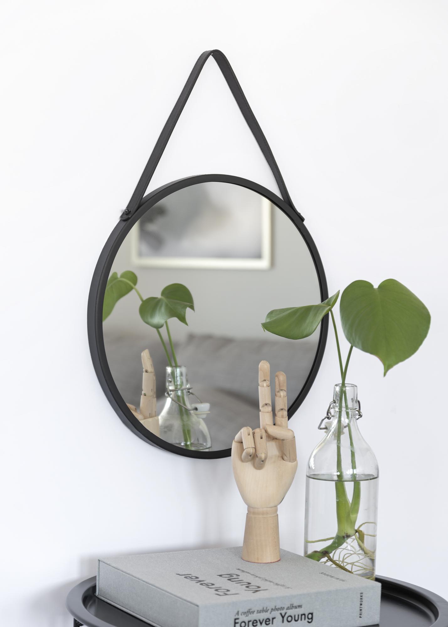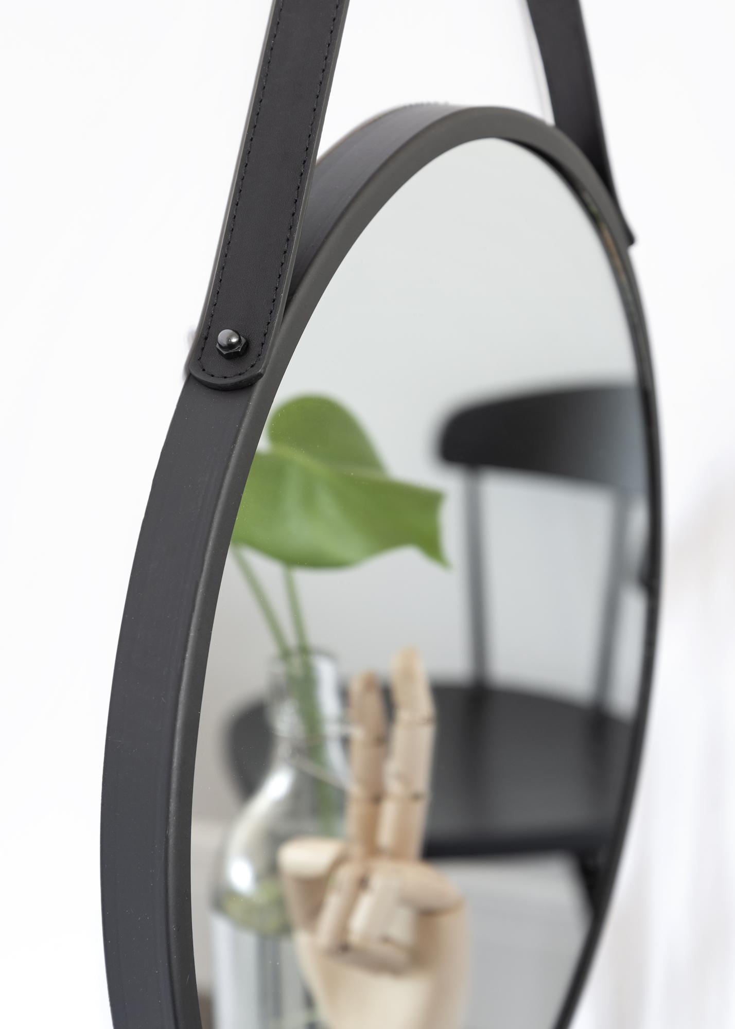 Trapani är en rund och stilren väggspegel med svart metallram. Den runda spegeln hänger vackert på väggen i ett elegant och funktionellt band i PU-läder (konstläder). Smycka din hall, ditt sovrum eller ditt vardagsrum med denna mycket dekorativa spegel.