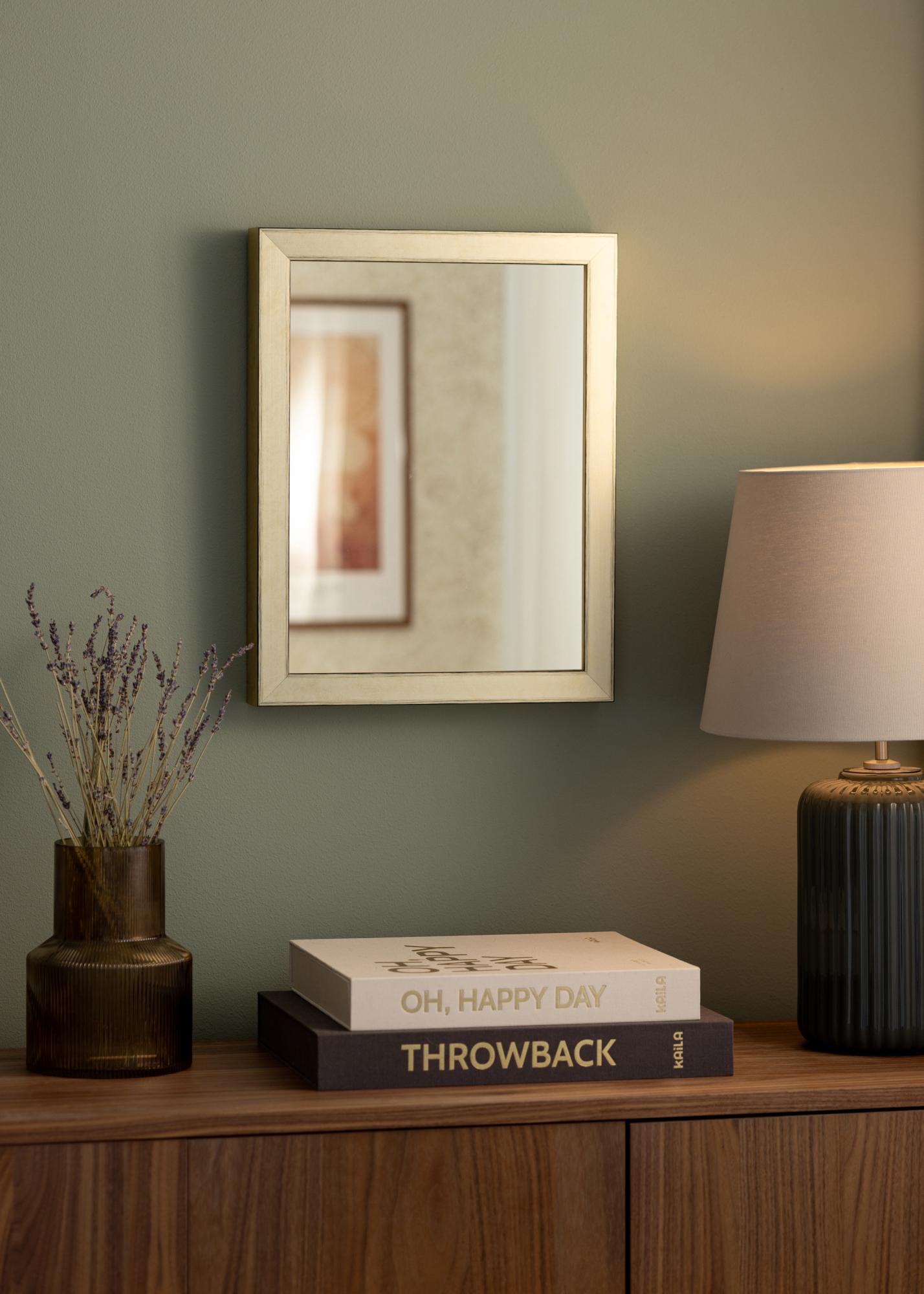 Ramen på Spegel Tyr Guld är 30 mm bred och har ett djup på 50 mm, vilket ger spegeln en robust och gedigen känsla. Tillverkad av furu, kombinerar den hållbarhet med estetik. Den subtila patinan på ramen ger spegeln en unik karaktär utan att ta över rummet, vilket gör den till ett utmärkt val för alla typer av inredningar.