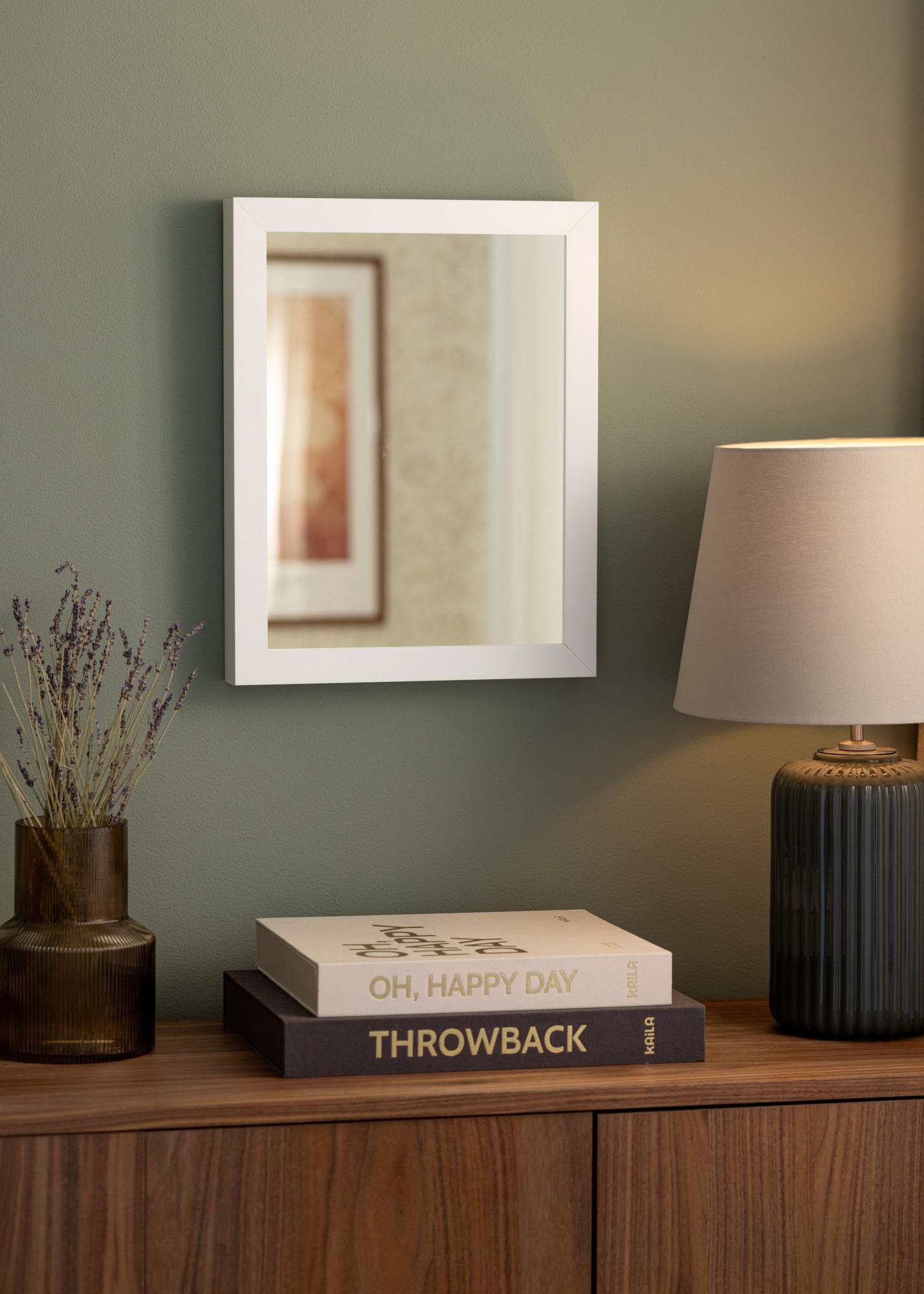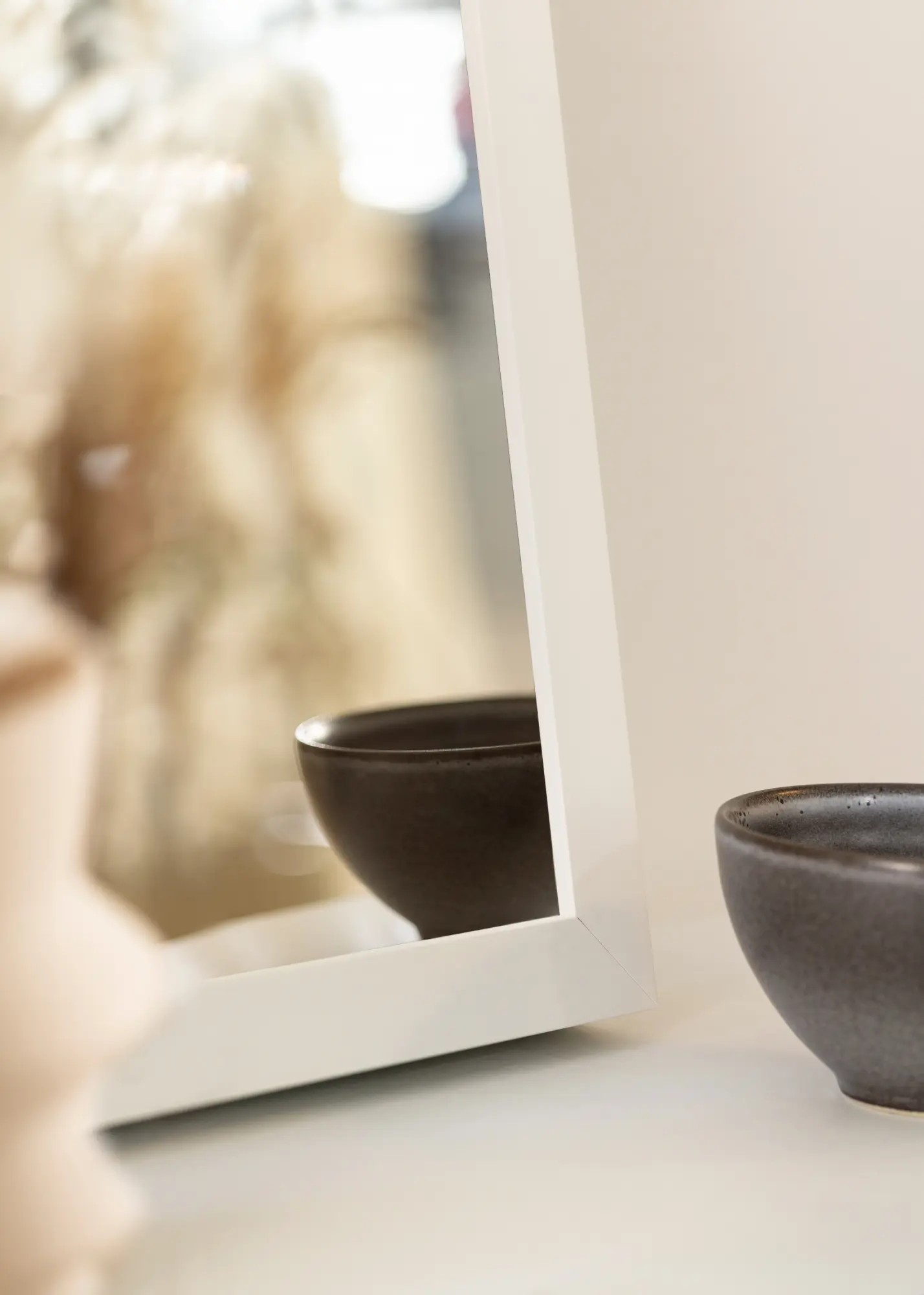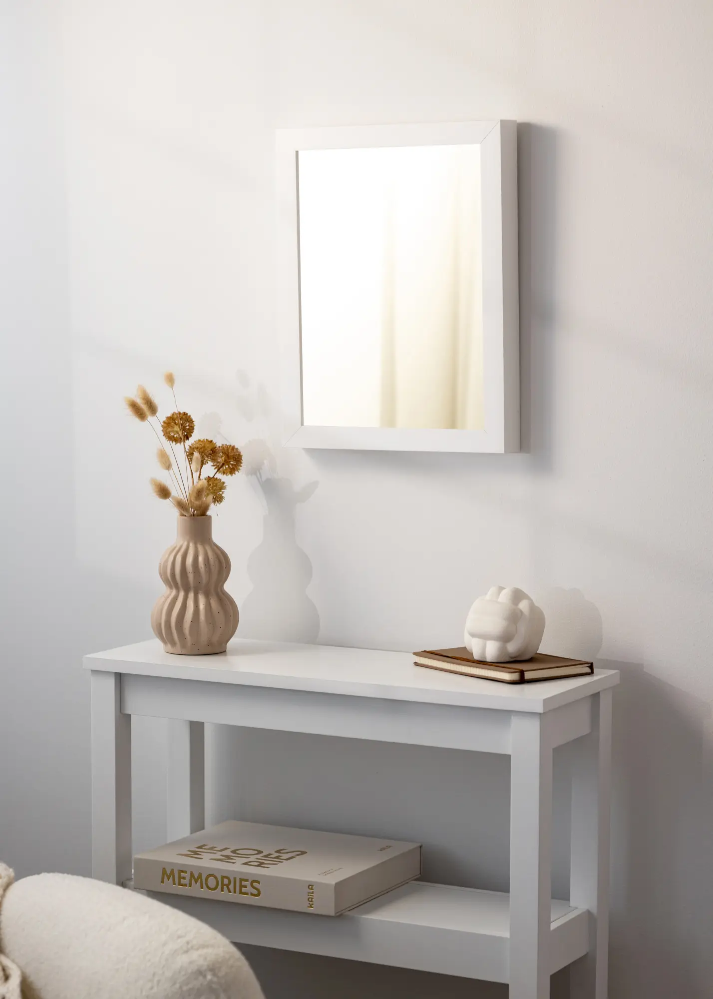 Denna spegel har en elegant vit färg som smälter in i de flesta inredningsstilar. Den 30 mm breda ramlisten ger spegeln en stilren och diskret inramning, medan det 50 mm djupa måttet skapar ett robust och gediget intryck. Tillverkad av furu, erbjuder spegeln både hållbarhet och en naturlig känsla som kompletterar dess moderna design.