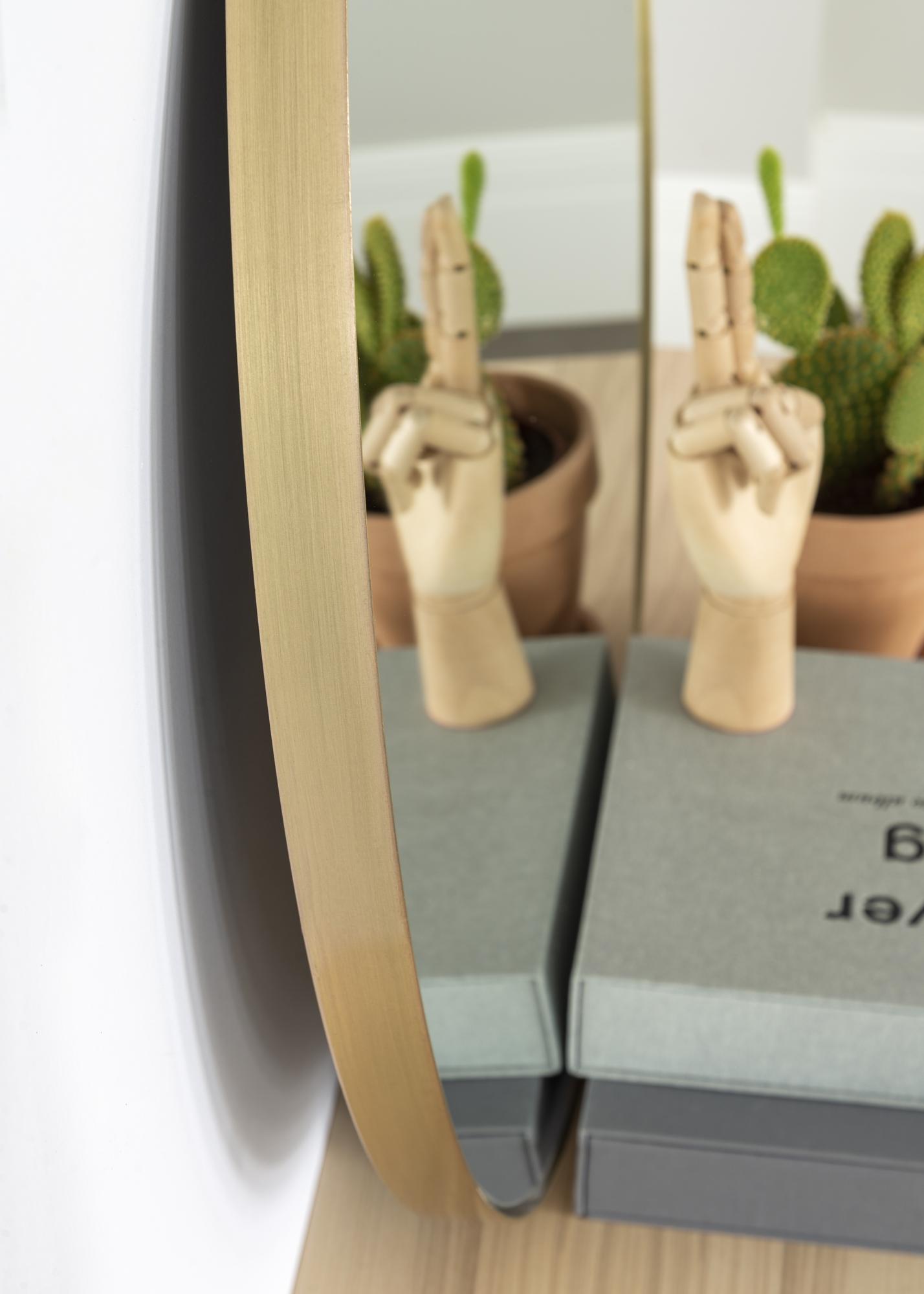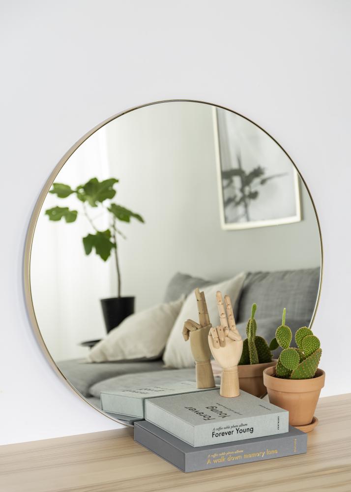 Den här runda spegeln omges av en smakfull ram i mässingsfärgad metall. Spegeln ger ett mycket elegant och avskalat intryck och passar såväl den moderna som den klassiska heminredningen.