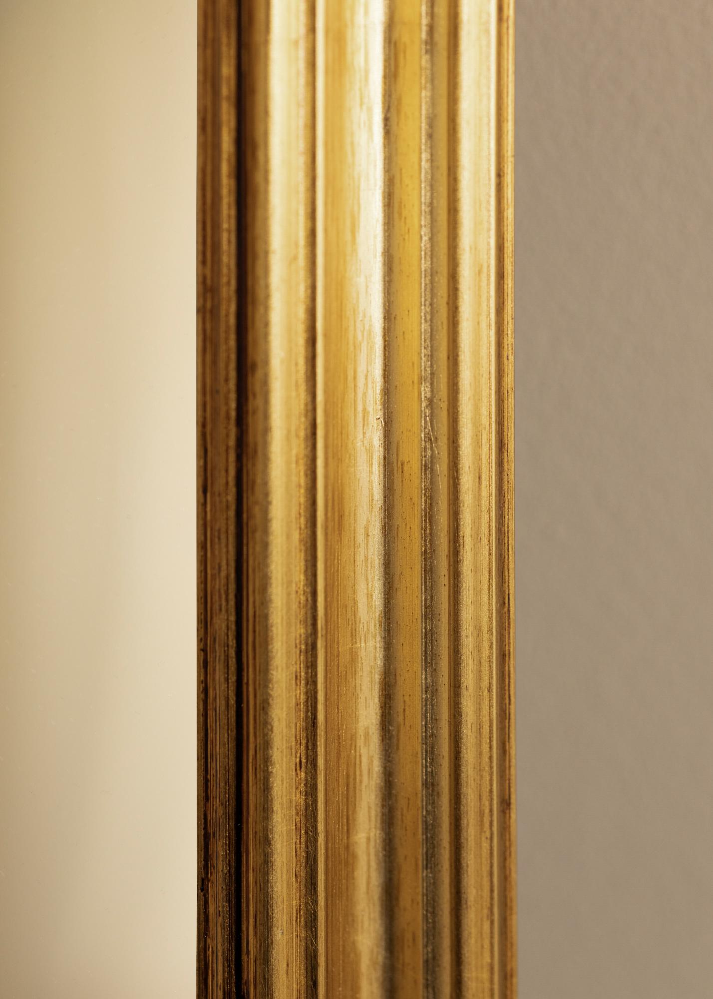 Denna spegel har en vacker guldfärg med mjuka rundade profiler som ger ett klassiskt och sofistikerat utseende. Den varma guldfärgen har subtila skiftningar och en lätt åldrad yta, vilket bidrar till ett tidlöst uttryck som passar i både moderna och traditionella inredningar. Spegeln kan enkelt bli en central del av ditt rum, oavsett om du placerar den i hallen, vardagsrummet eller sovrummet.