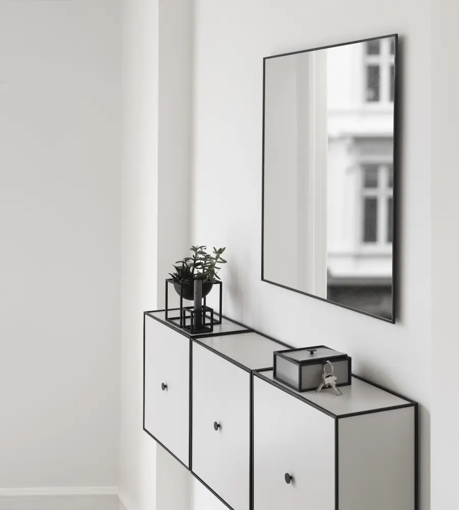 Här hittar du en stilren och tidlös design från by Lassen. Med sin smarta konstruktion på baksidan av spegeln hänger spegeln någon centimeter från väggen och ger känslan av att spegeln svävar fritt i rummet.