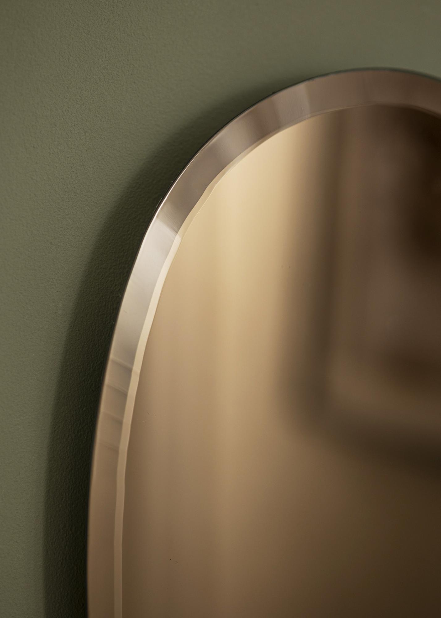 Oavsett om du placerar den i hallen för en sista blick innan du går ut, eller som ett stilfullt inslag i vardagsrummet, kommer denna spegel att komplettera din inredning med sin unika form och varma glans. Välj denna spegel för att skapa en känsla av djup och dimension i ditt hem.