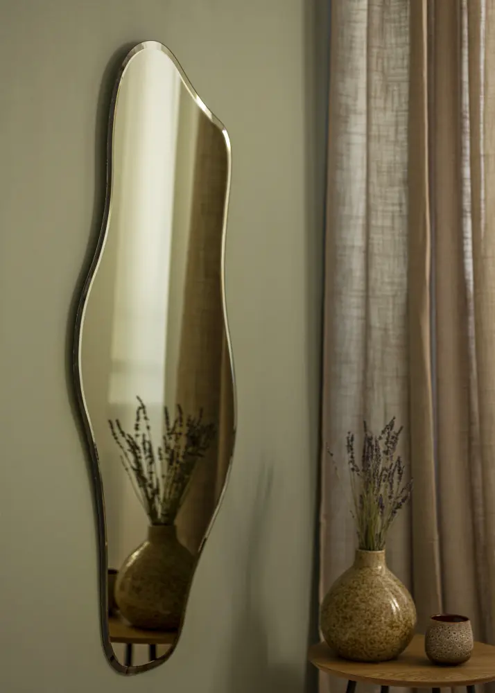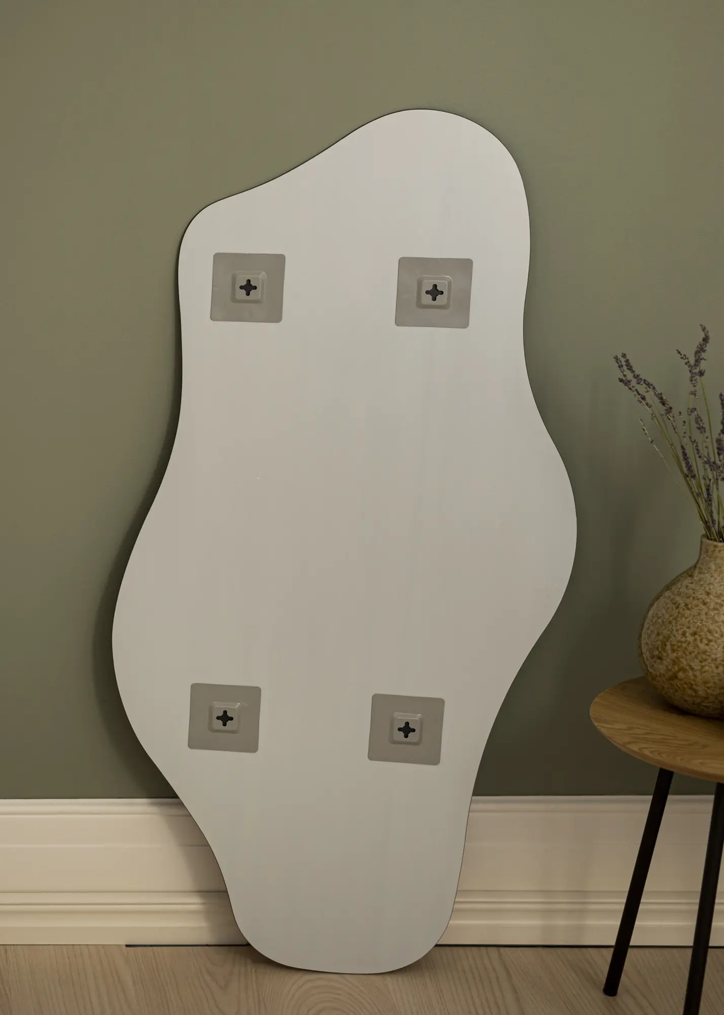 Upptäck en spegel som kombinerar funktion med enastående design – vår vågformade spegel är en sann blickfångare. Med sina generösa mått på 55x110 cm erbjuder den en rymlig reflektionsyta som passar perfekt i såväl hallen som i sovrummet eller vardagsrummet. Formen på denna spegel är unik och våglik, vilket ger ett mjukt och dynamiskt intryck till rummet.
