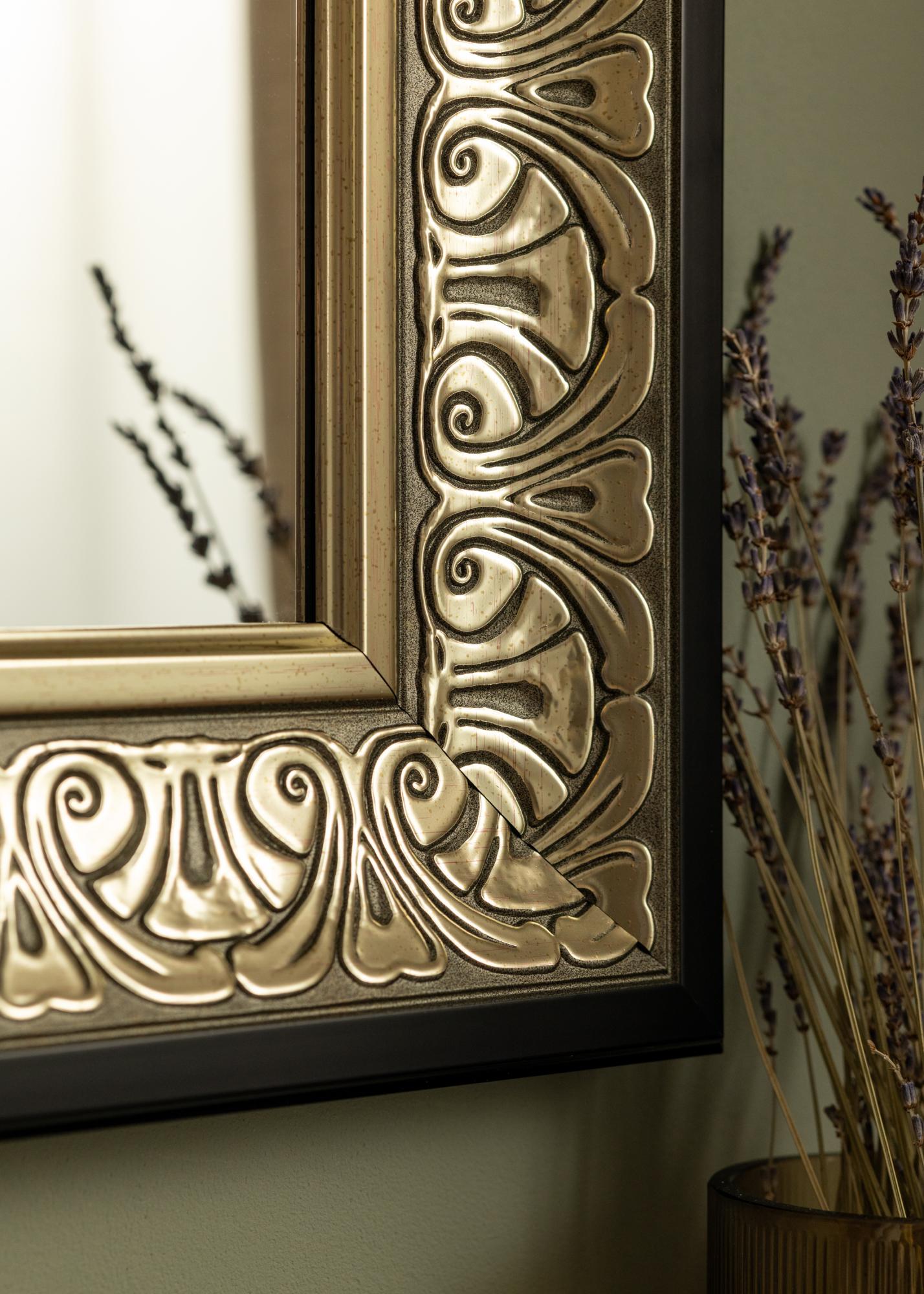 Vår spegel Wismar Silver är en väggspegel med regelbunden utsmyckning runt hela ramen. Wismar Silver pryder sin plats utan att ta över ett rum.