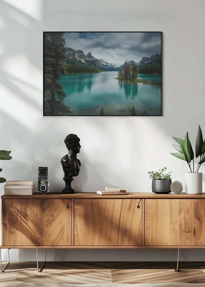 Denna poster fångar en hisnande vacker naturvy med en spegelblank sjö omgiven av majestätiska berg. Den lilla ön i mitten pryds av träd i djupt gröna och rika röda nyanser, vilket skapar en färgstark kontrast mot de omgivande blå och turkosa vattnet. De dimmiga molnen mot en klar himmel ger en känsla av lugn och harmoni. Denna bild är perfekt för den som söker en fridfull och inspirerande atmosfär i sitt hem.