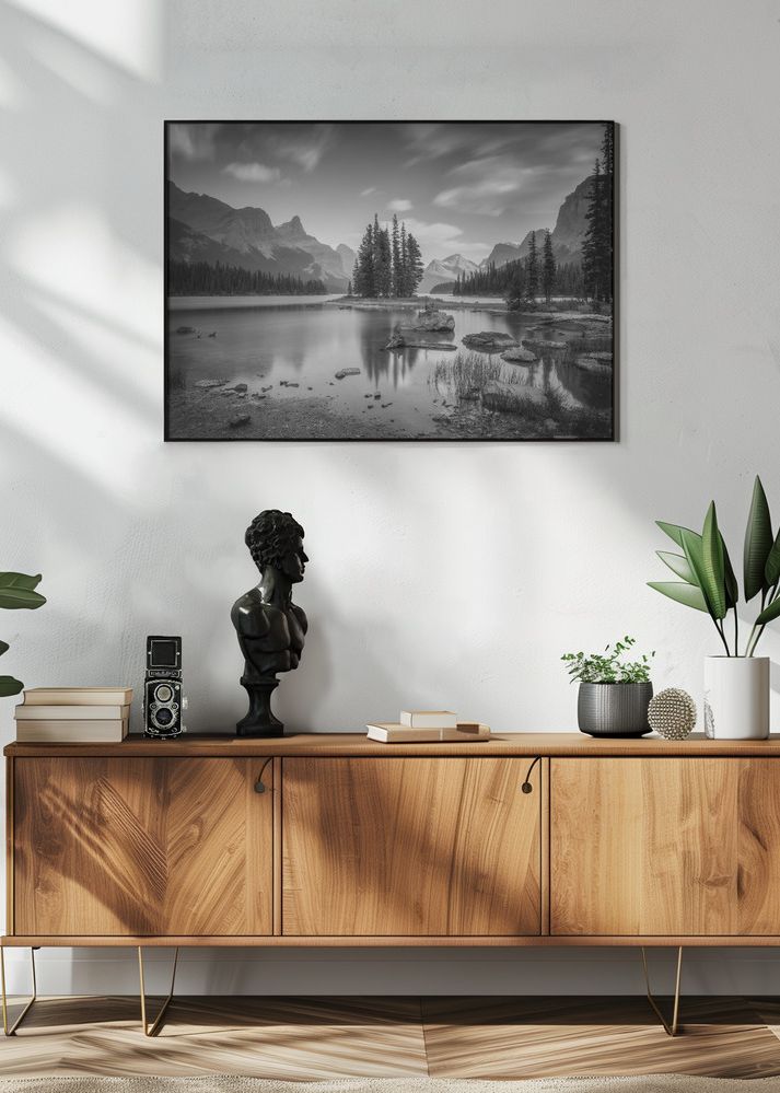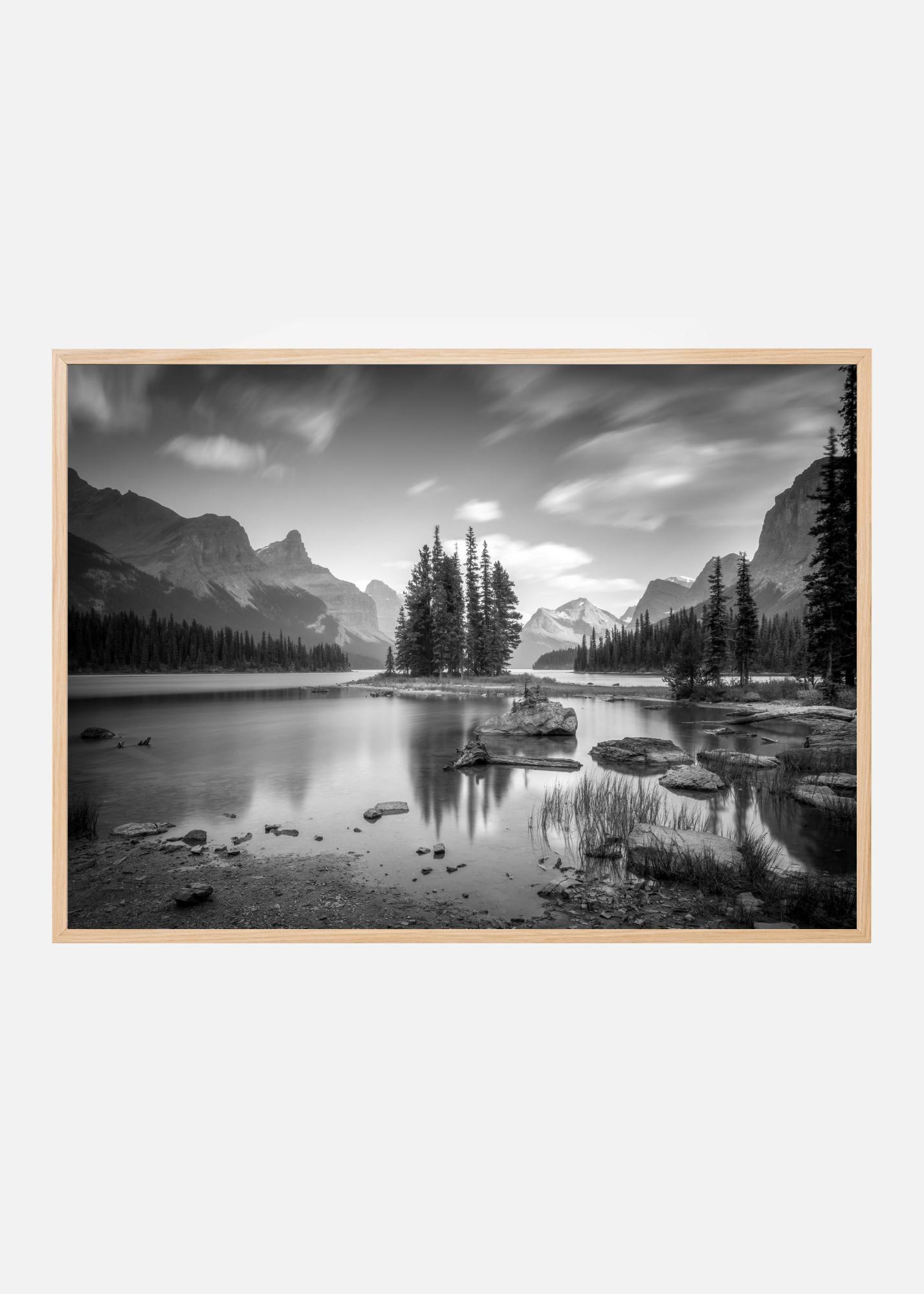 Denna svartvita poster fångar den dramatiska skönheten hos ett majestätiskt bergslandskap med spegelblanka vatten. Den lugna sjön, omgiven av majestätiska bergstoppar och en tät skog, väcker känslor av ro och tidlöshet. Himmelns rörelse speglas i vattnets yta, vilket skapar en harmonisk balans. Denna affisch utstrålar en klassisk elegans som passar perfekt i moderna som traditionella inredningar.