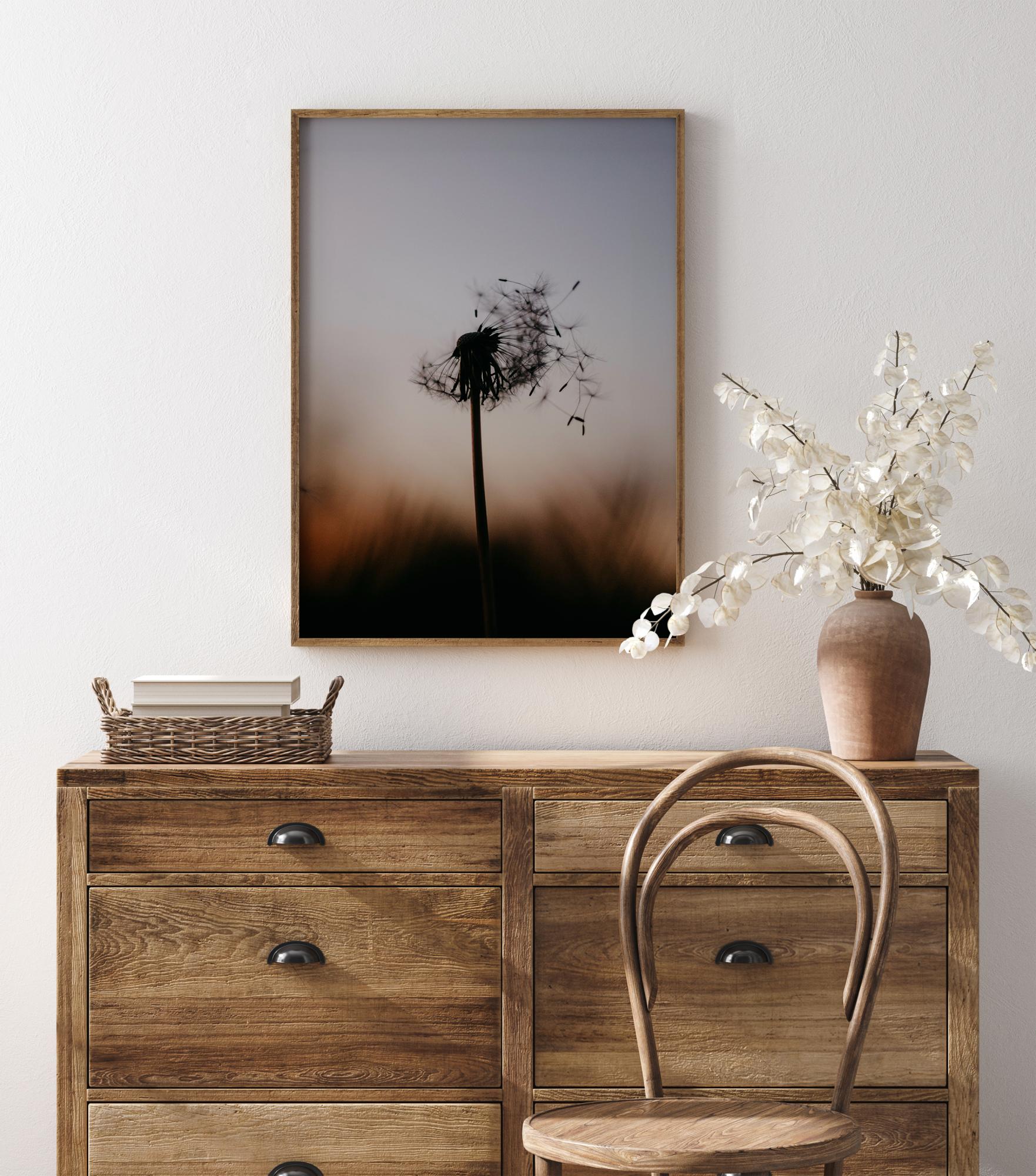 En elegant poster med en maskrosklocka med hälften av fröna bortblåsta. Klockan står i siluett i mitten av bilden. En blå himmel gör att de enskilda fröna framträder i fantastiska detaljer. Det mjuka orange gräset nedanför skapar en känsla av värme när brisen blåser igenom.
