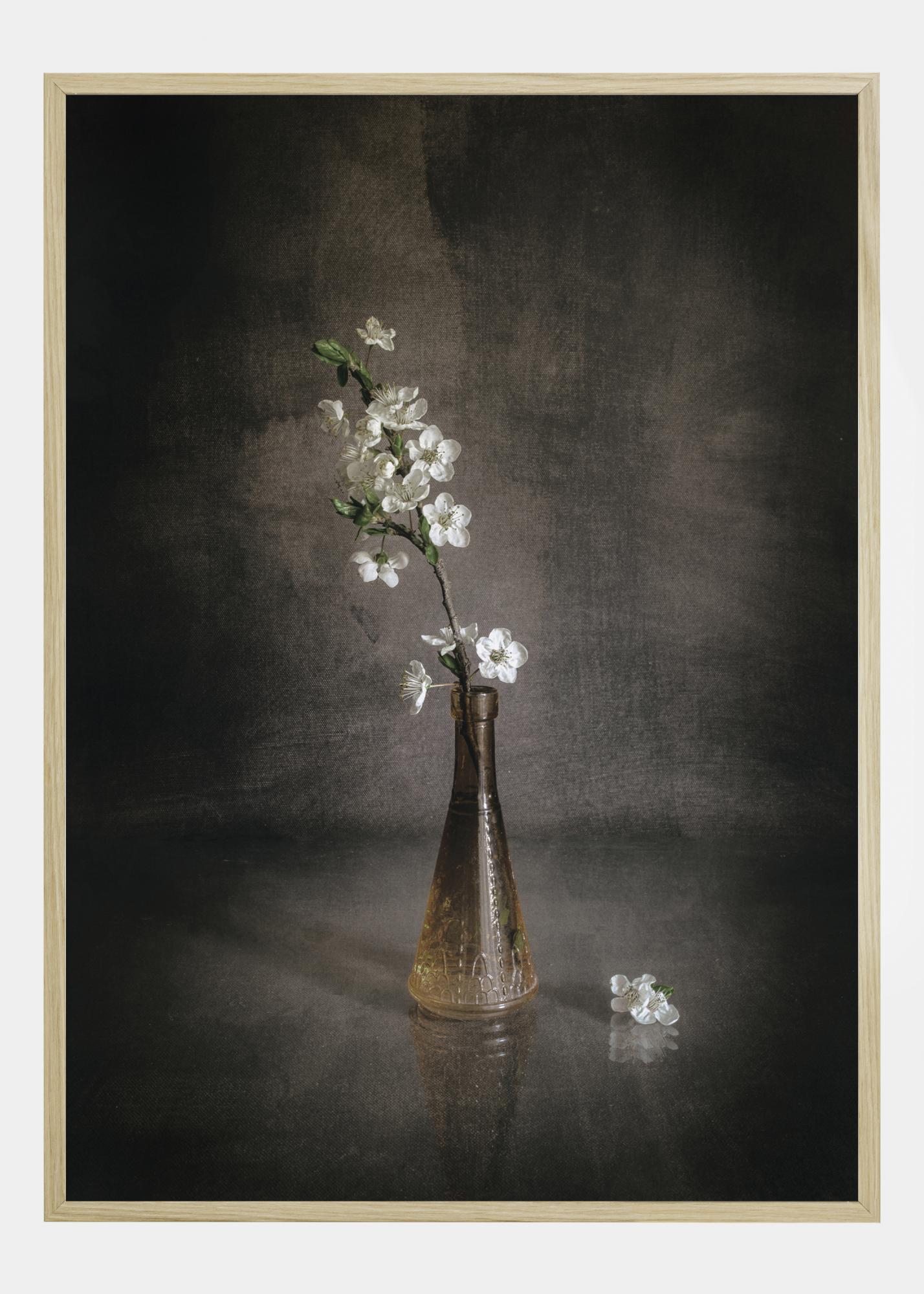En vårposter med vita blommor i en tunn brun vas. Vasen kastar skuggor i två riktningar och skapar en ljus fokuspunkt där de stjärnformade blommorna växer upp mot de mörkbruna breda penseldragen på väggen bakom. Betrakta detta eleganta stilleben.