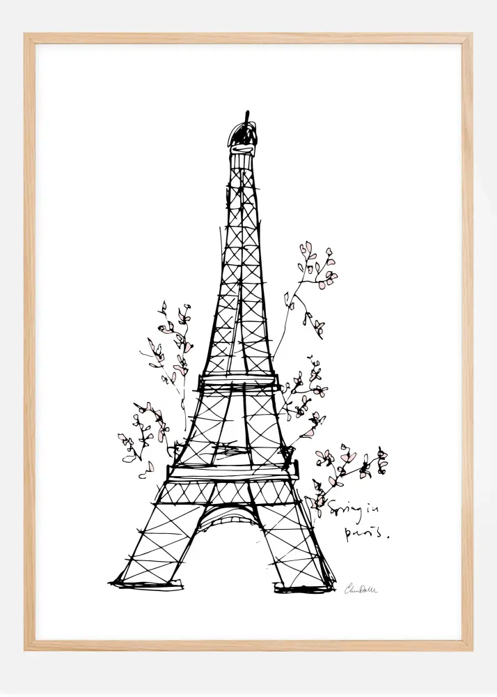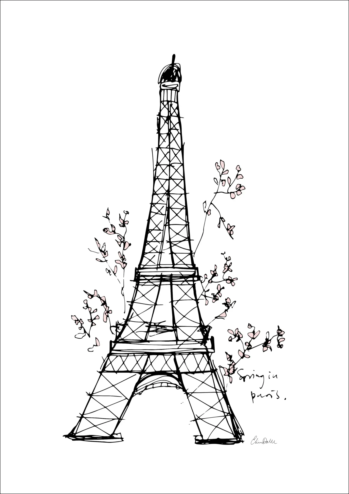En poster med en enkel bläckritning av Eiffeltornet. De skrapiga linjerna i bilden och tornets ojämna placering i mitten bidrar till att ge den en illustrativ kvalitet. Stora blommande grenar sträcker sig ut bakom tornet för att ge den där våren i Paris-känslan.