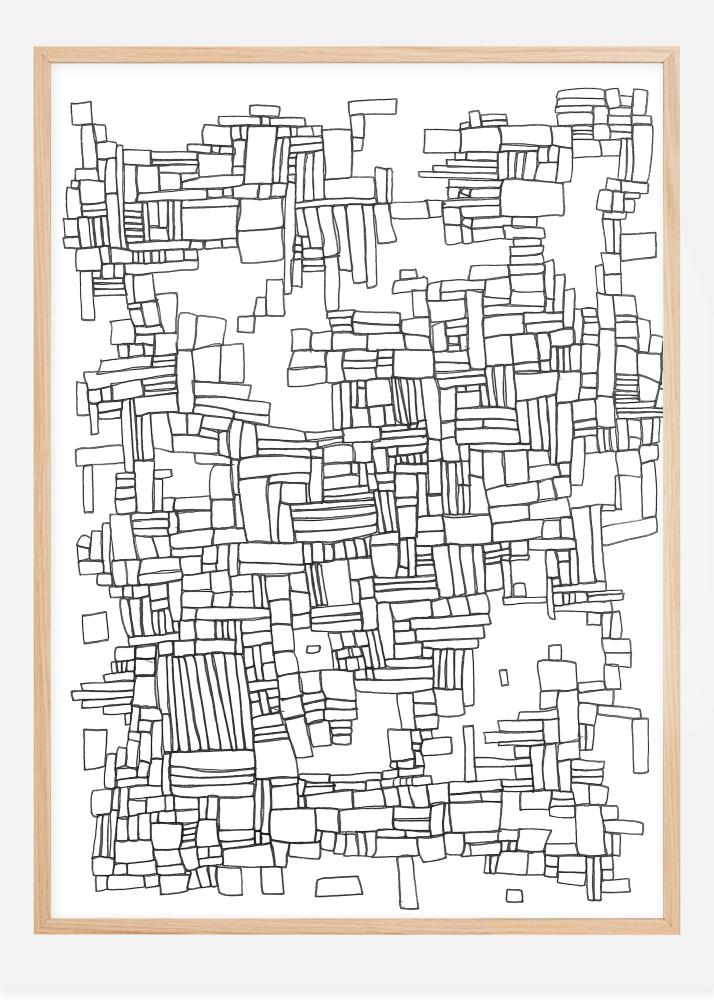 En mönsterposter med geometriska kvadrater i svarta linjer på en vit bakgrund. Hundratals små kvadrater och rektanglar kombineras för att skapa ett märkligt mönster över hela bilden. Titta på den och försök att hitta mönstren och formerna när du har det här talande verket hängande hemma.