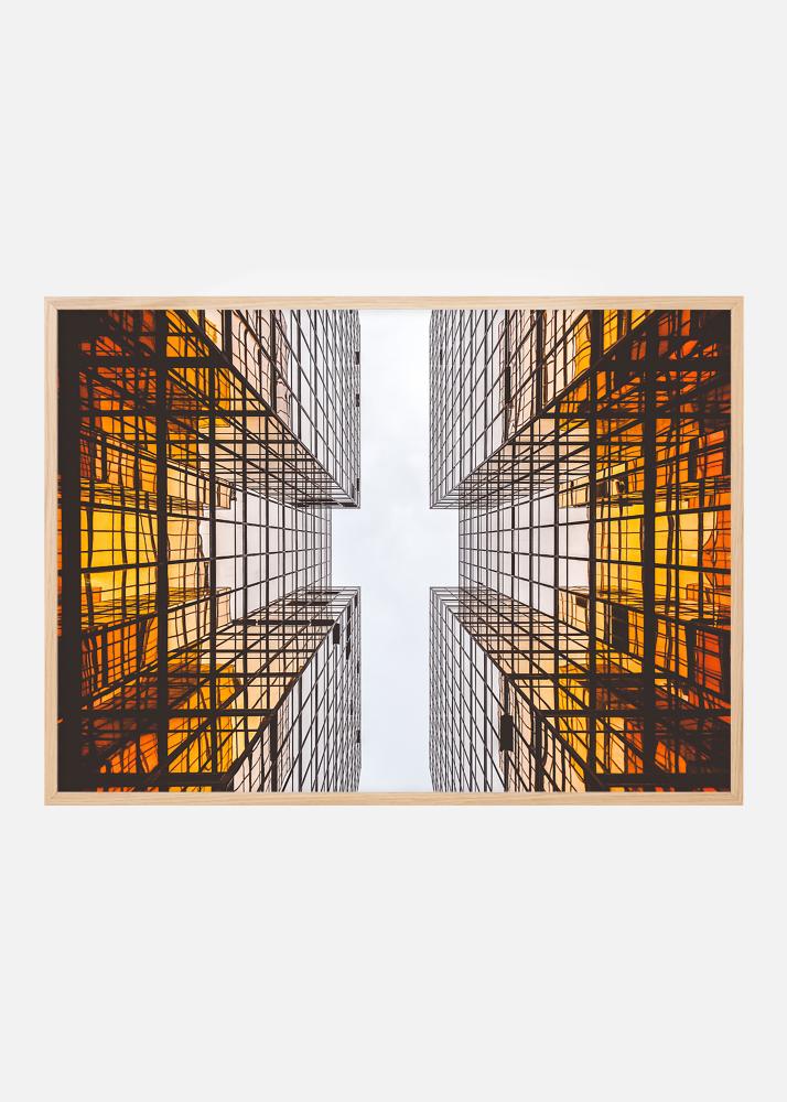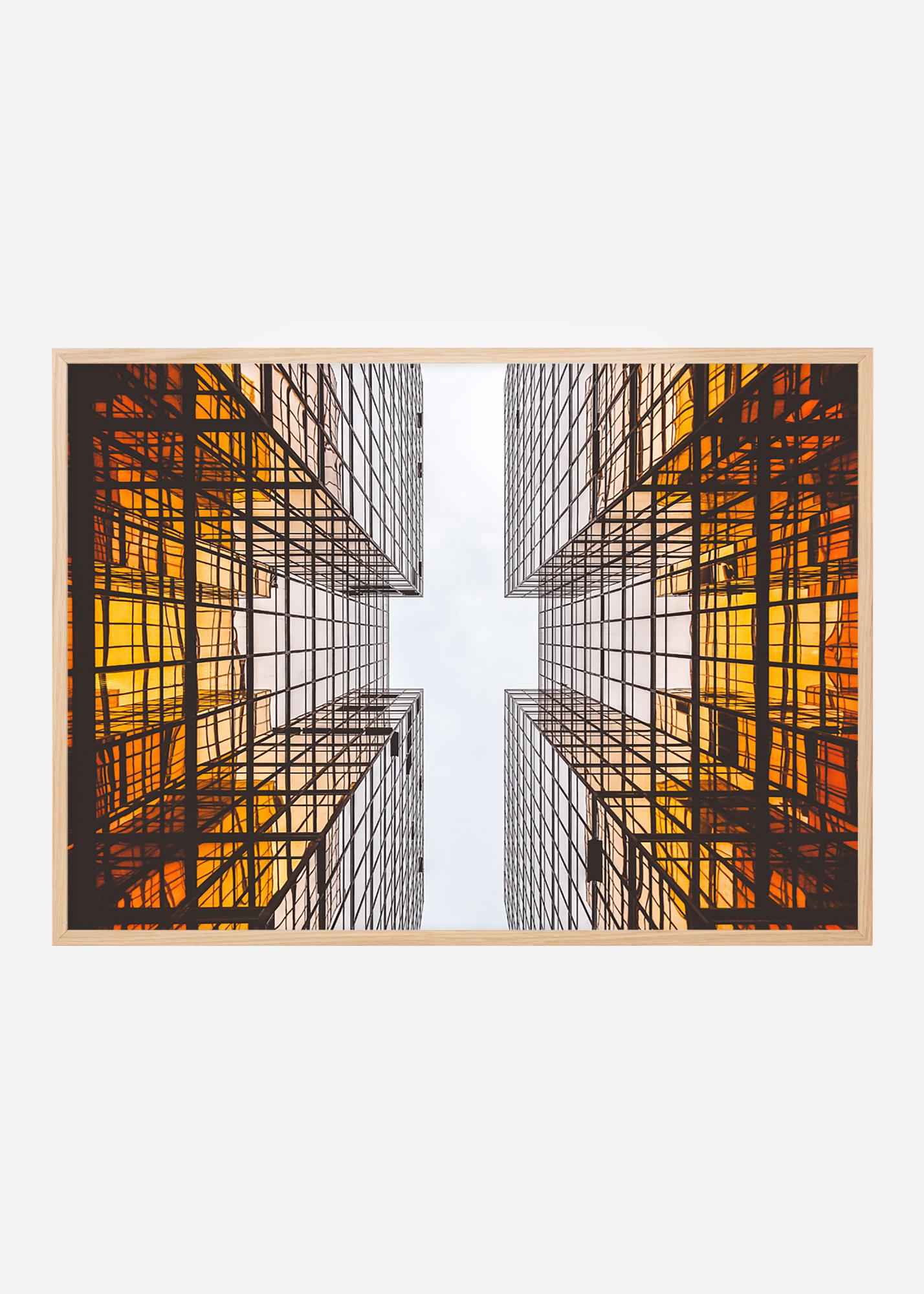 Affisch med futuristisk arkitektur som med sina grafiska linjer skapar ett spännande mönster. Färgerna tonar ut från djupt orange i byggnadens bas mot den vita himlen. Postern gör sig bra med en tunnare ram i så väl minimalistisk inredning som i andra stilar med grafiska element. Kombinera gärna med andra tavlor på spännande arkitektur eller stadsmiljöer.