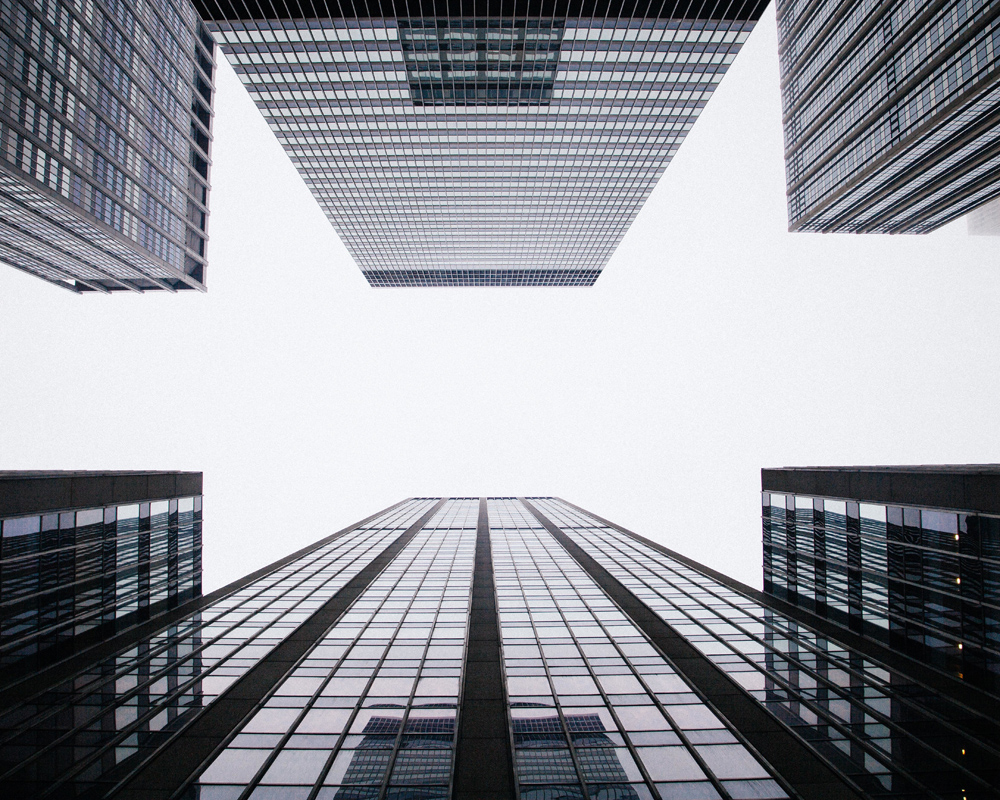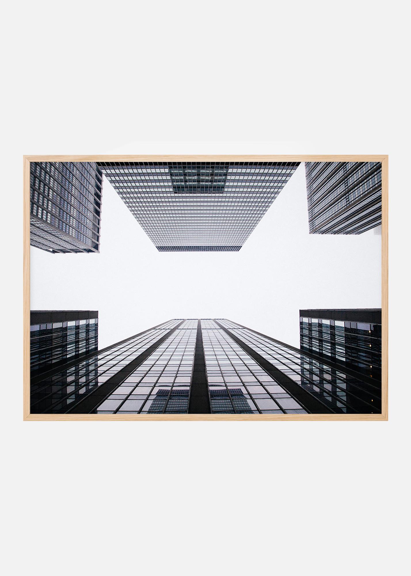 Arkitekturposter med växande skyskrapor mot en molnvit himmel. Stilren bild på mörka byggnader mot en vit bakgrund, med himlens reflektioner i glasrutorna. Perfekt present till den som gillar grafiska byggnadsporträtt. Printet gör sig bra i en svart ram som förstärker det mörka i bilden och blir fin i kombination med andra fotografier av arkitektur.