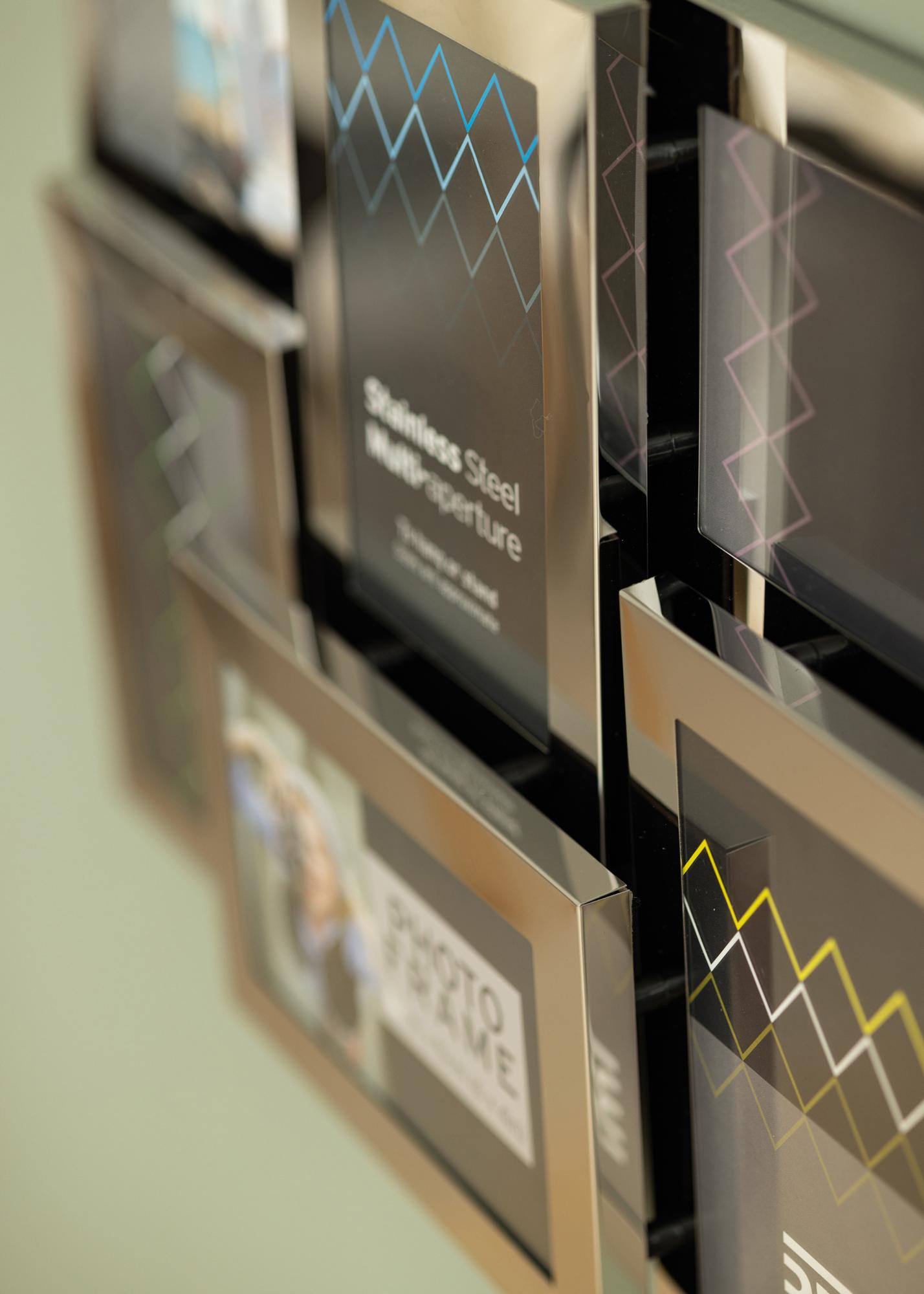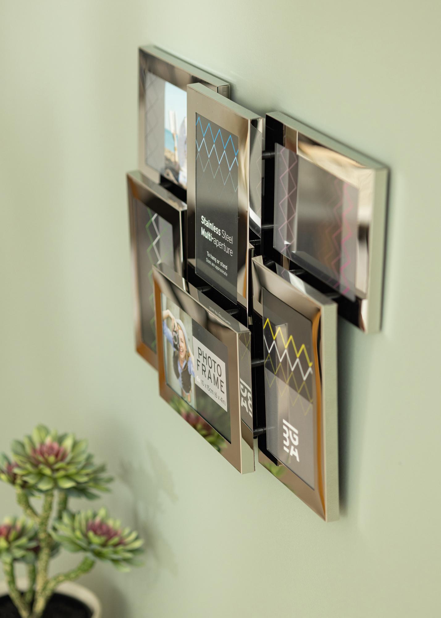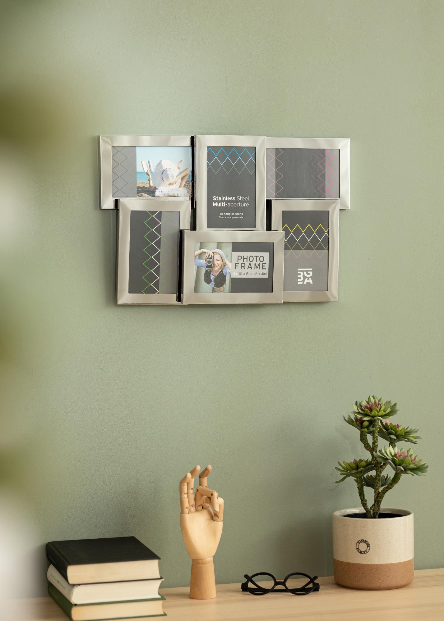 Detta är en collageram för 6 foton i 10x15 cm. Ramen har en modern framtoning, tack vare det robusta materialet i metall och den blanka silverfärgen. Du kan själv välja om du vill montera upp ramen på väggen eller placera den ståendes i exempelvis bokhyllan eller fönsterkarmen.