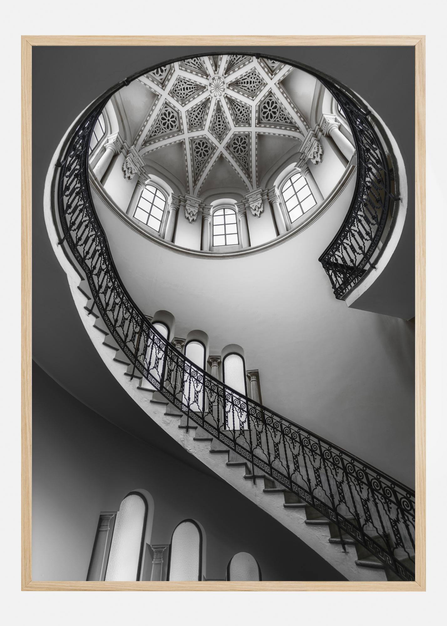 En invecklad poster med en byggnads insida. En spiraltrappa med intrikata smidesjärnstänger slingrar sig upp mot taket. Blicken dras upp till kupolen med en fantastisk gitterdesign och ljusa fönster där ljuset lyser in. Elegans och detaljrikedom kombineras i den här svartvita bilden.