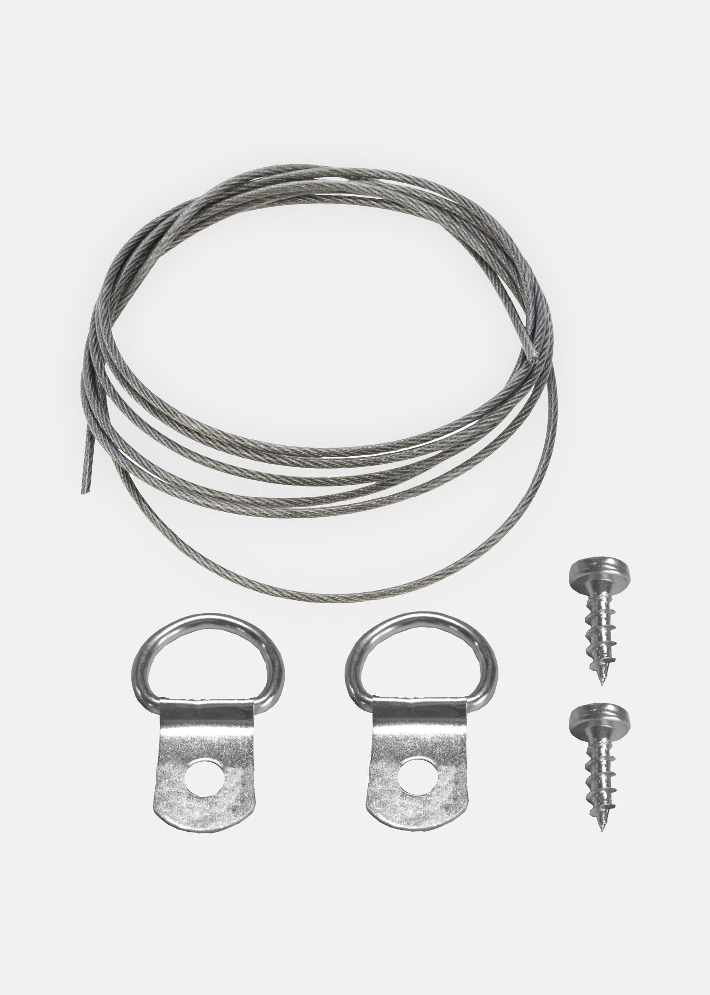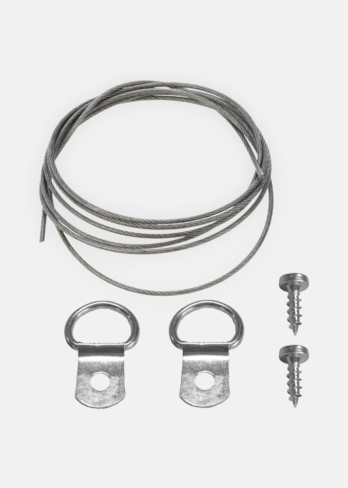Med detta kompletta kit har du allt du behöver för att montera en stålvajer på din tavla: 1 meter lång stålvajer, 2 skruvar och 2 öglor/krokar. Stålvajern är galvad och tålig men endast 0,7 mm tjock, vilket gör den lätt att arbeta med då den kan böjas och tvinnas efter önskemål.