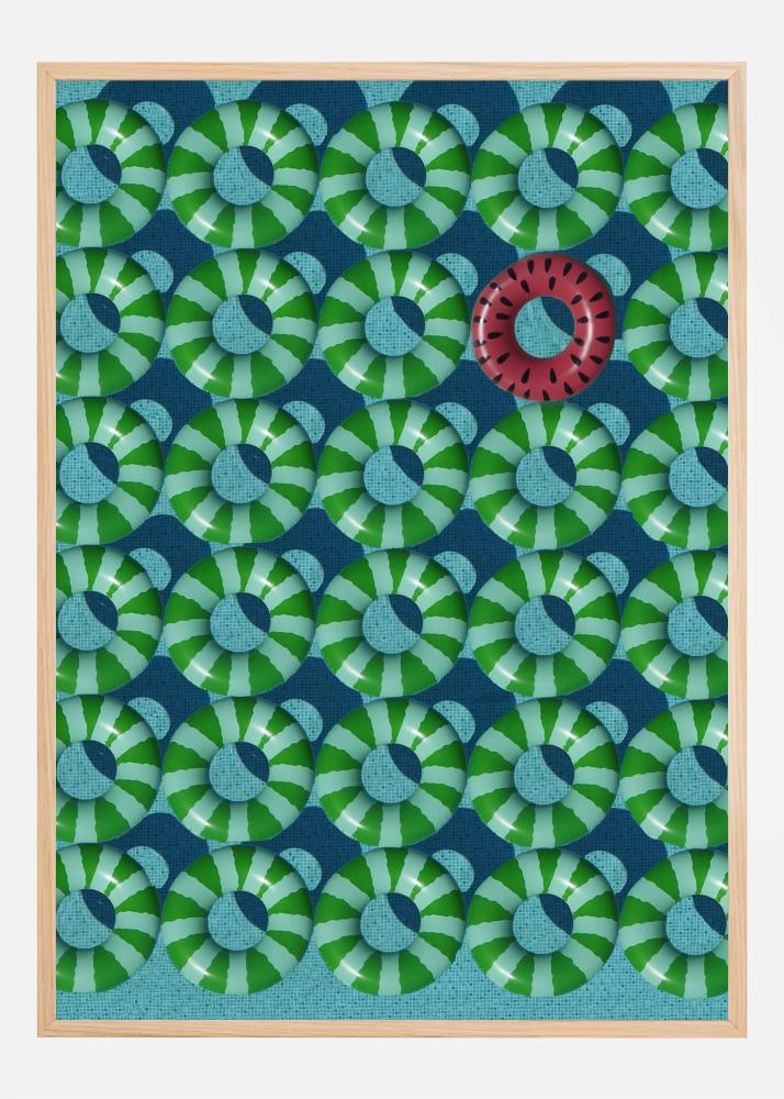 Denna lekfulla och färgstarka poster är en hyllning till individualitet och originalitet. I en hav av identiska gröna och vita badringar fångar en ensam vattenmelonbadring blicken och bjuder på en omedelbar känsla av glädje och skoj. Denna print är en perfekt sommarkompanjon, som lyfter fram det unika i att sticka ut från mängden.