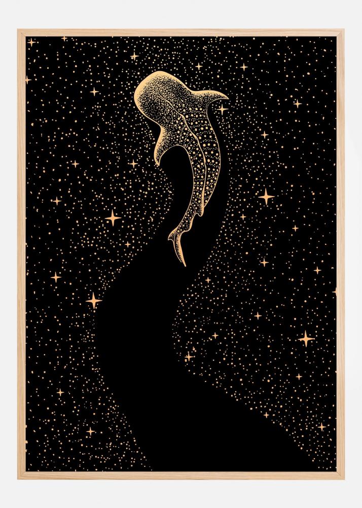 Fånga universums magnifika skönhet med denna mystiska poster som framkallar känslan av rymdens oändlighet. Designen består av en elegant silhuett av en kvinna som verkar smälta samman med en stjärnklar himmel, skapandes en visuellt fängslande illusion av ett med ett kosmiskt hav. Stjärnorna och det rymdlika glitter spridda över den svarta bakgrunden bidrar till en atmosfär av drömlik förundran och evigheten som är perfekt för alla som uppskattar en touch av mystik och poesi på sina väggar.