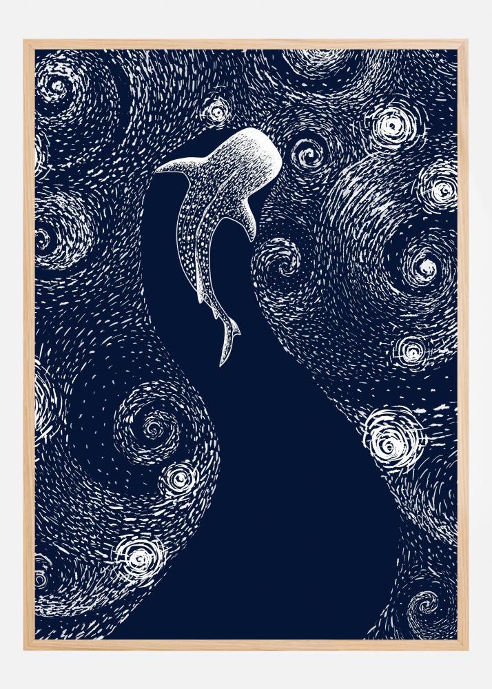 Denna artistiskt utförda poster fångar en fängslande maritim scen i ett dubbelspel av mönster och kontraster. En ljus, eterisk manet svävar nådigt i en djup marinblå bakgrund, omgiven av en myriadvirvel av abstrakta, likt stjärnspiraler. Den avgränsade maneten är utformad i en ljusare nyans, vilket ger en drömlik effekt medan den kontrasterar vackert mot den mörka, texturerade bakgrunden.