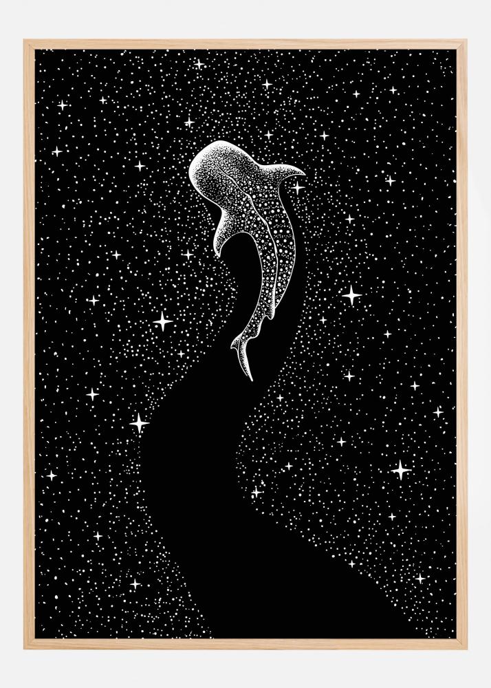 Upplev kosmisk skönhet med vår fascinerande affisch som bjuder på ett stjärnklart motiv. En skimrande vit val svävar magiskt på en bakgrundsplysch av prickiga stjärnor, vilket ger en känsla av djup och ändlighet i rymden. De små prickarna bildar en kontrastrik nattskymning som fångar betraktarens uppmärksamhet och inspirerar till dagdrömmeri och fantasi.